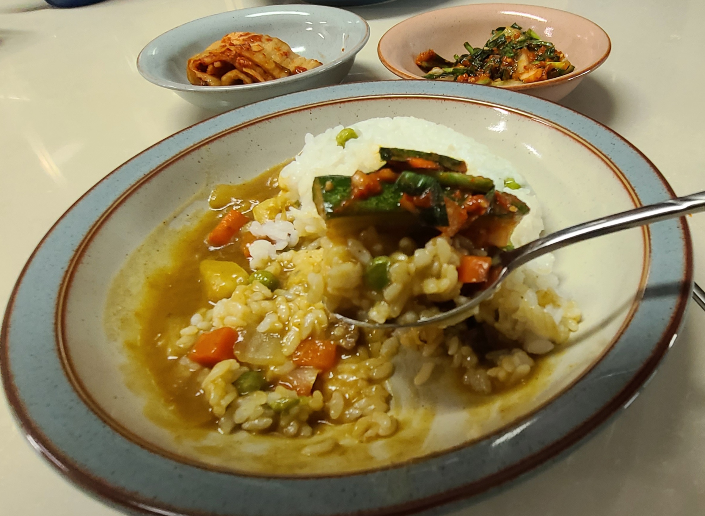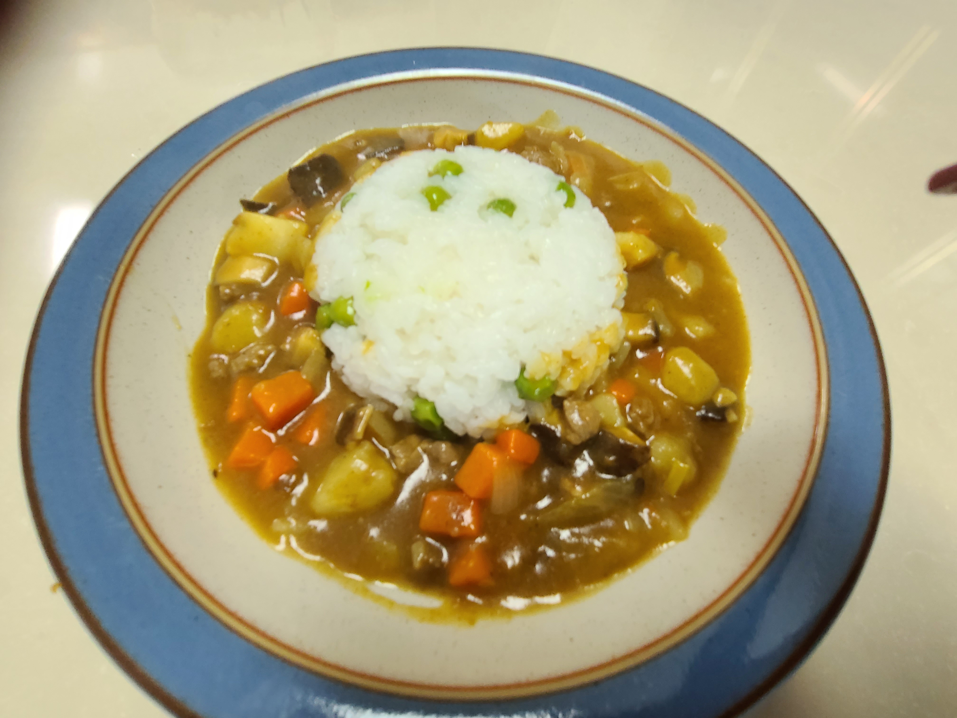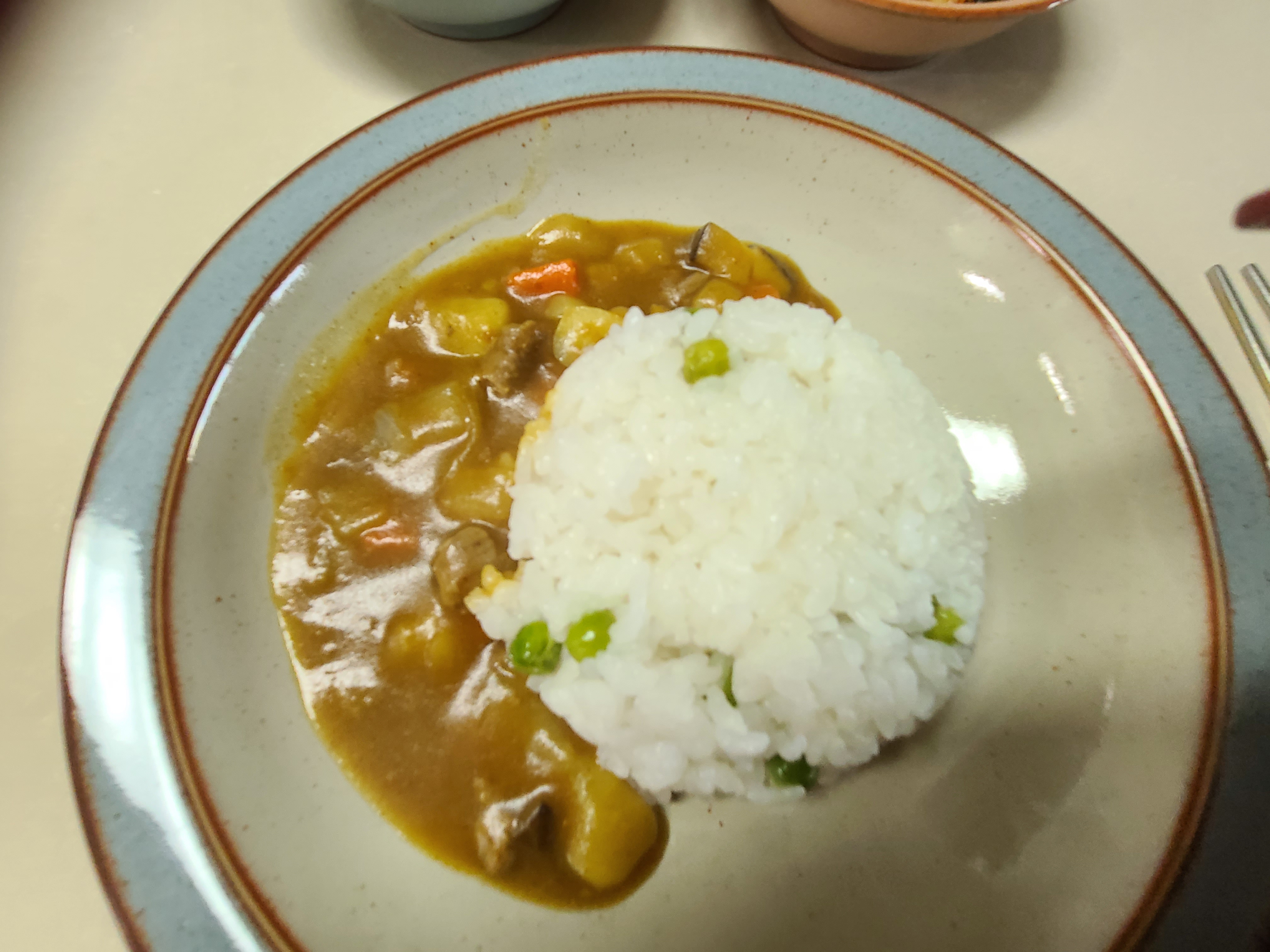 그릇에 완두콩밥을 담은 후 카레를 부어 주었다.