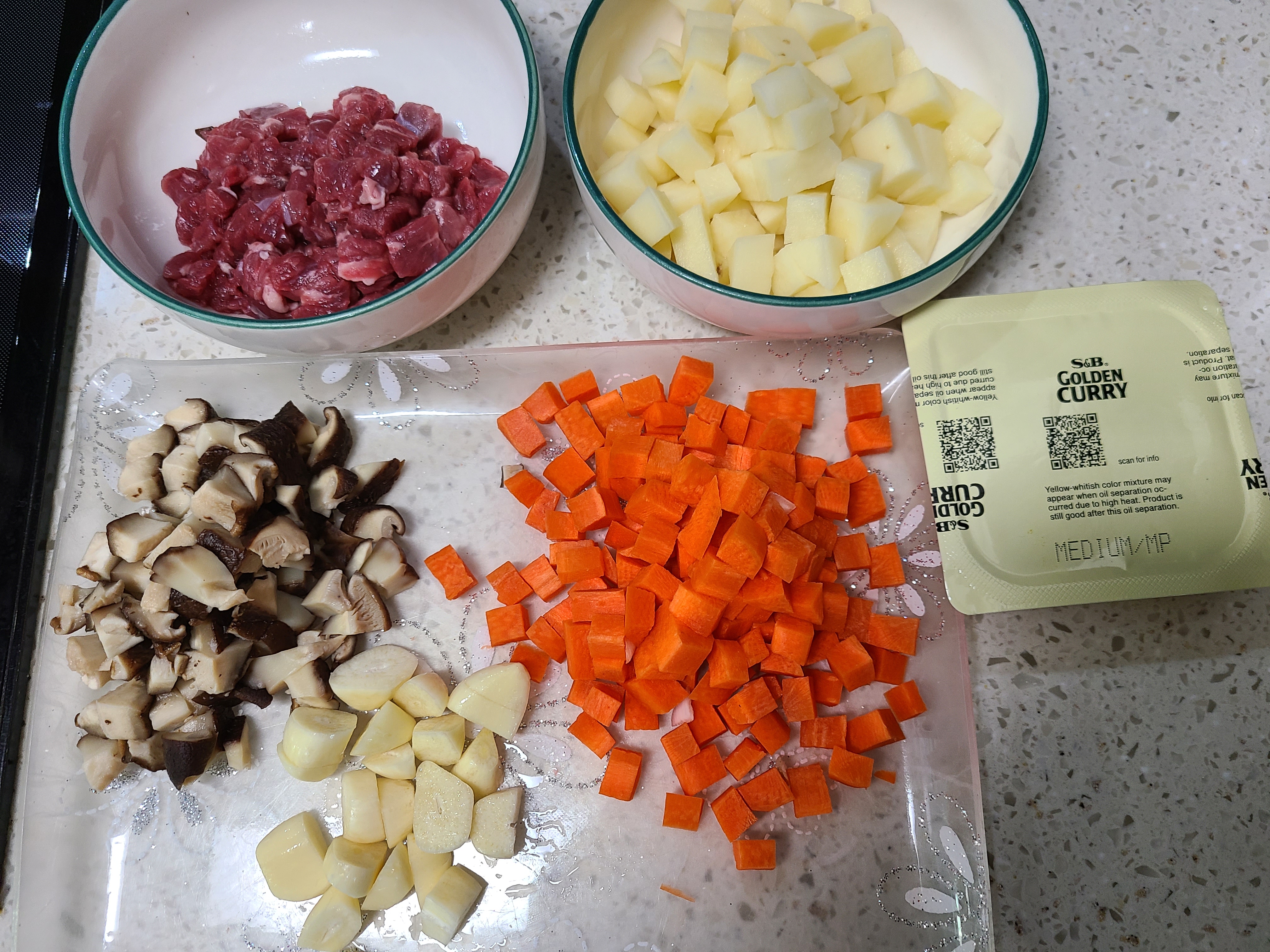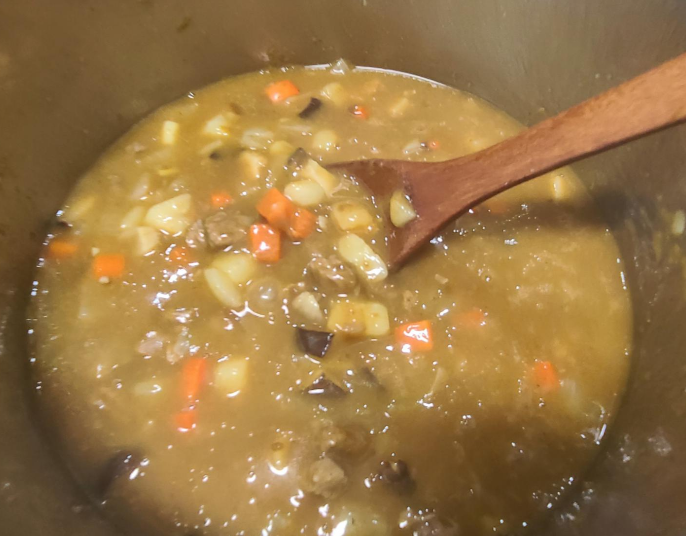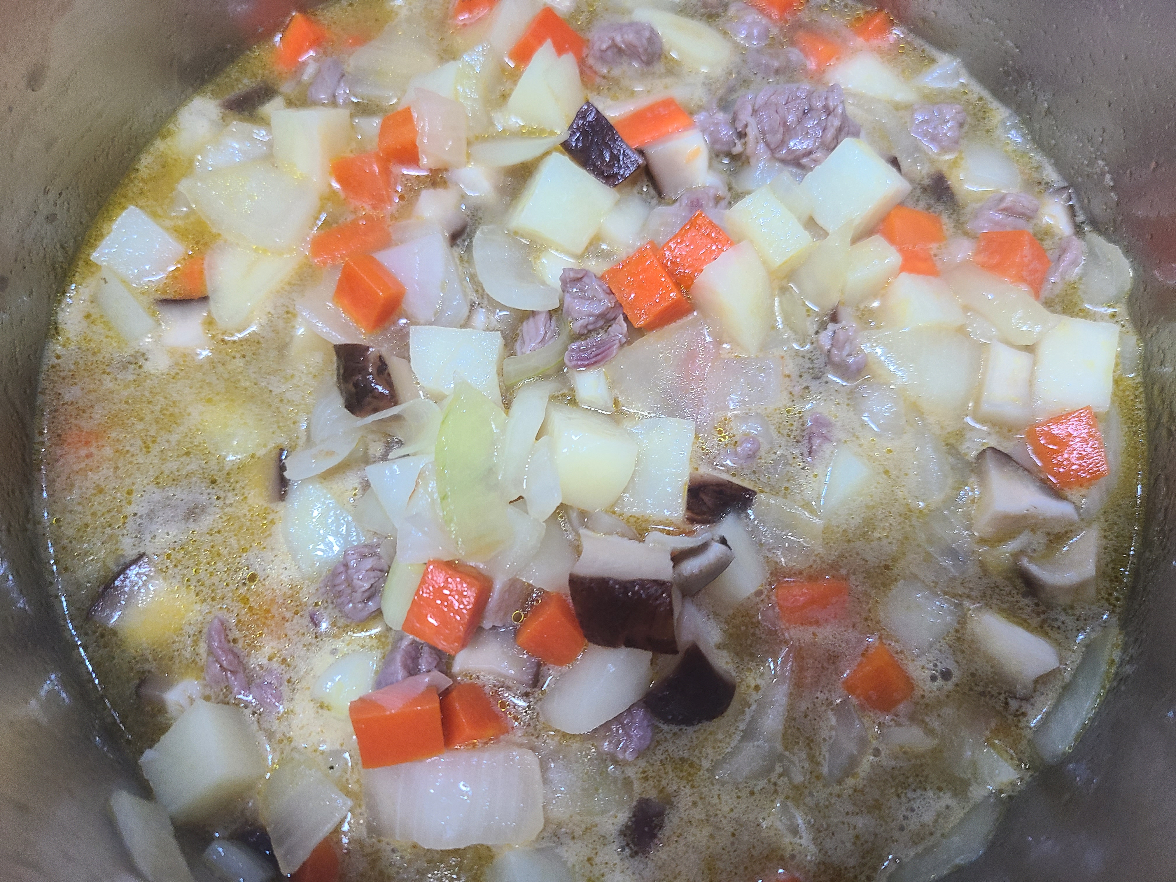 재료: 쇠고기 등심 160g , 양파 2개(200g), 불린 표고버섯 4장(100g), 감자 1개(200g), 당근 1개(130g), 통마늘 한 줌, 표고버섯물 1L, 고형분 카레 1팩(4조각)