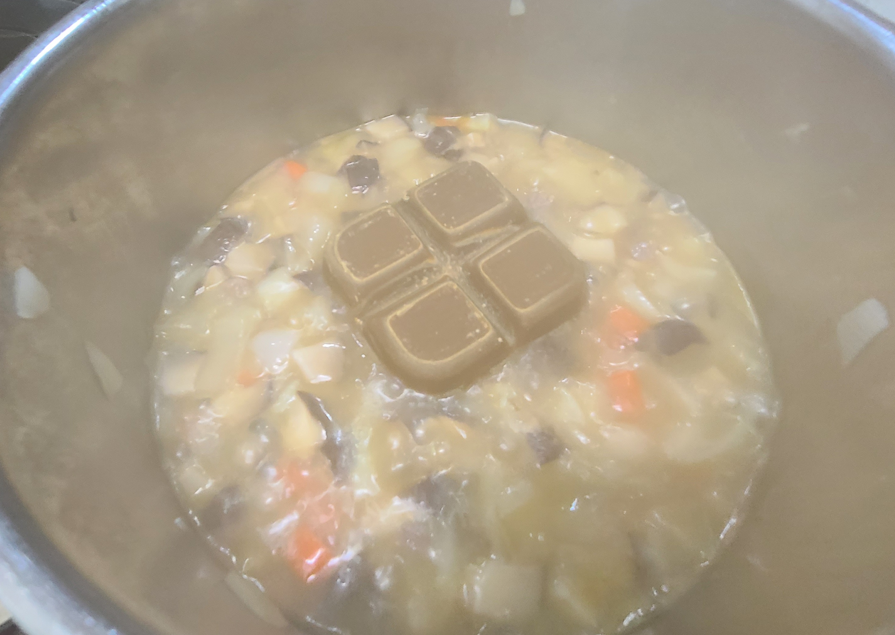 6. 야채가 익으면 고형분 카레 한팩 (4조각)을 넣어준 후 약불로 줄이고 저어준다. 요즘은 분말로 되어있는 카레도 따로 물에 풀지 않고 바로 넣어도 잘 녹지만 고형분 카레가 더욱 진한 카레 맛을 느낄 수 있어 자주 사용한다.