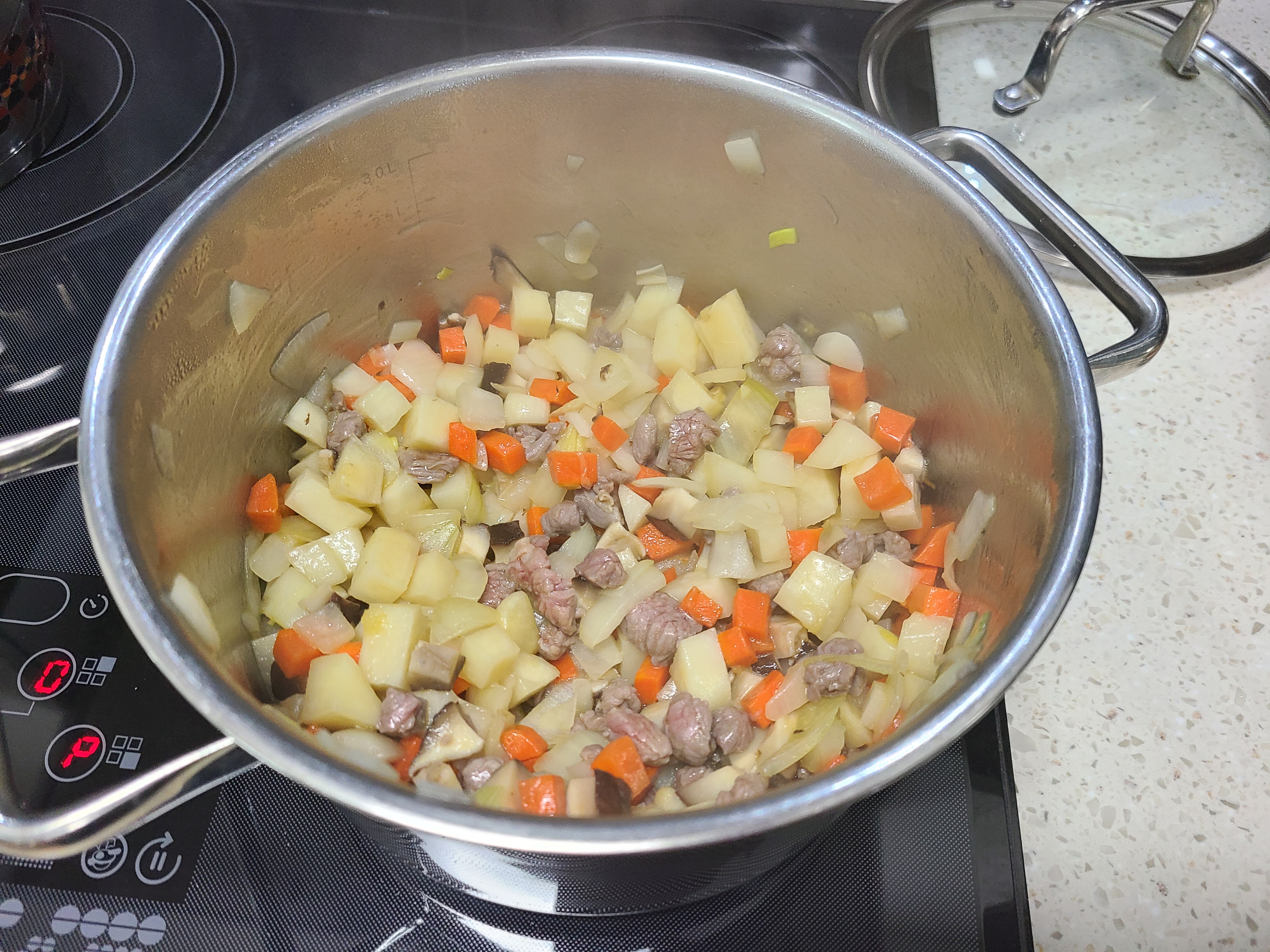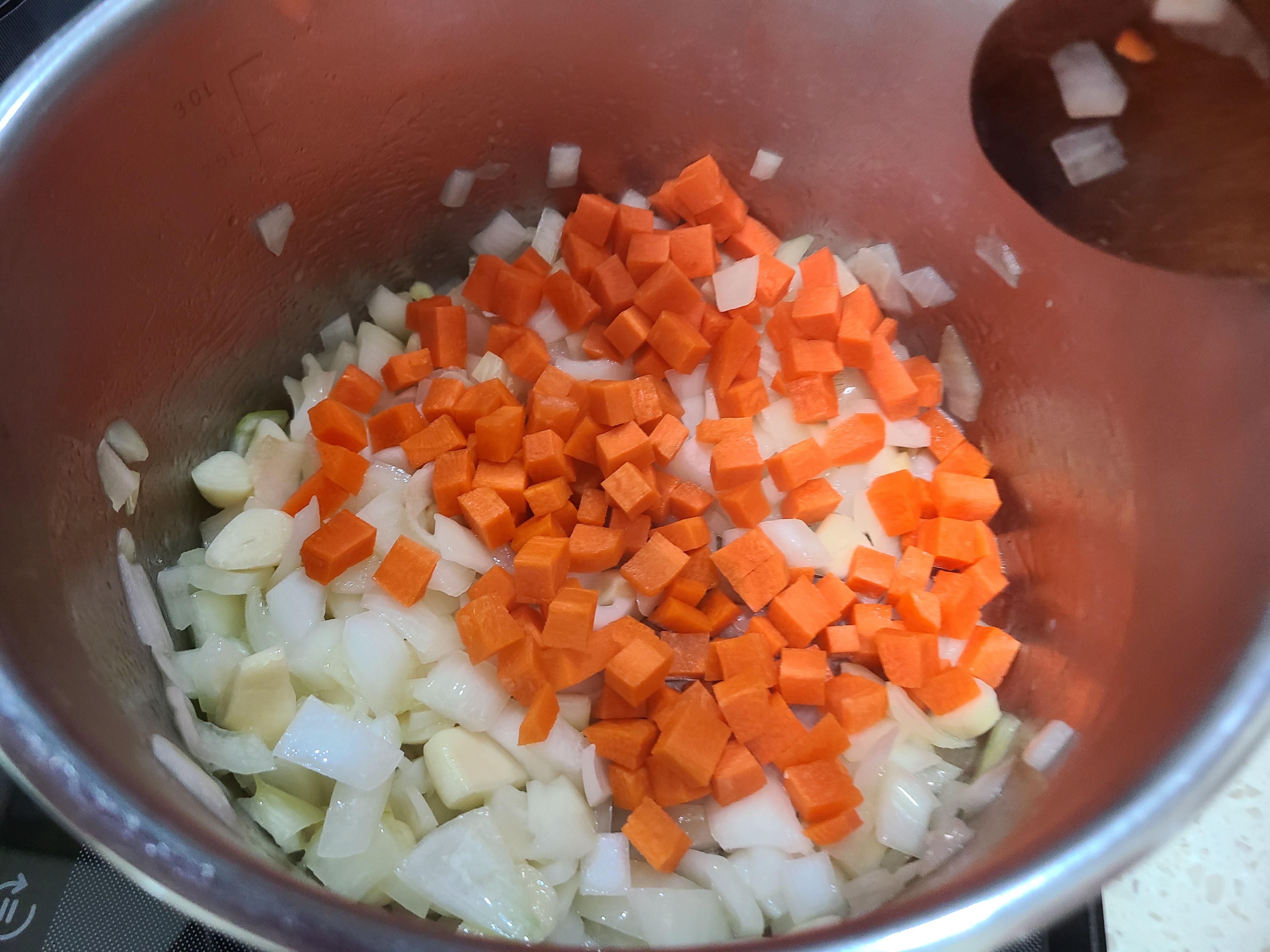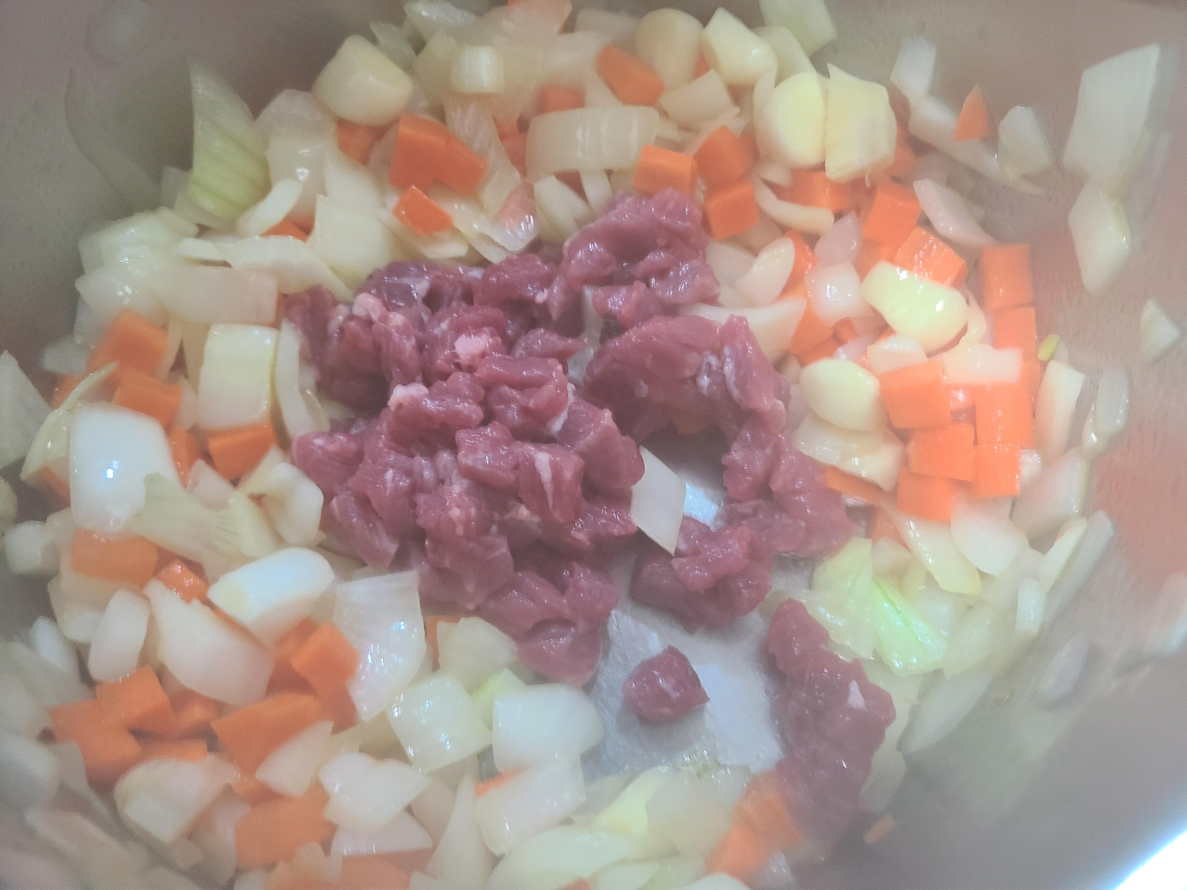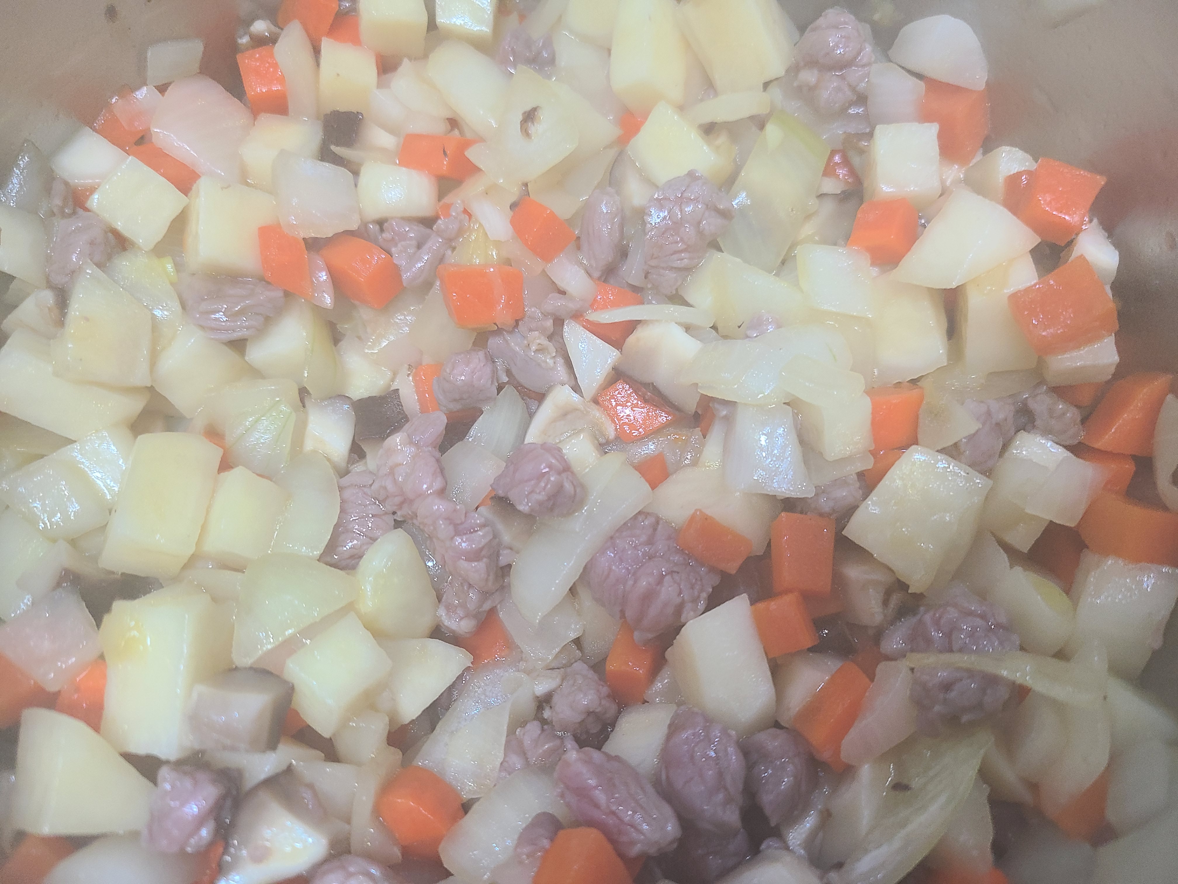 4. 당근, 감자, 쇠고기, 표고버섯 순서로 단단한 재료부터 순서대로 볶아준다.