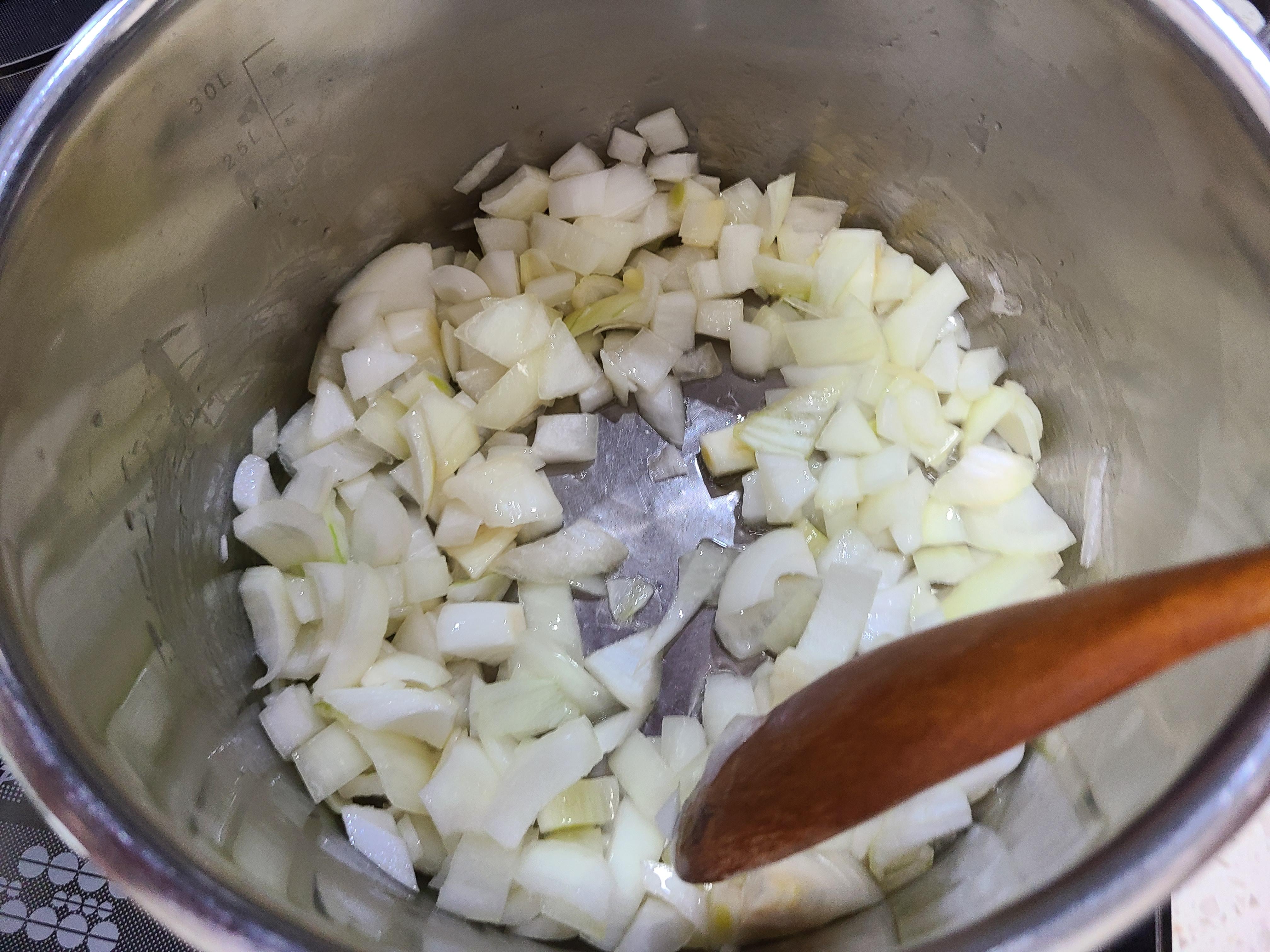 2. 냄비에 식용유를 넣고 양파를 볶아 준다. 캐러멜 색이 날대 까지 볶아줘야 풍미가 있다고 하는데 오늘은 빨리 볶았다.