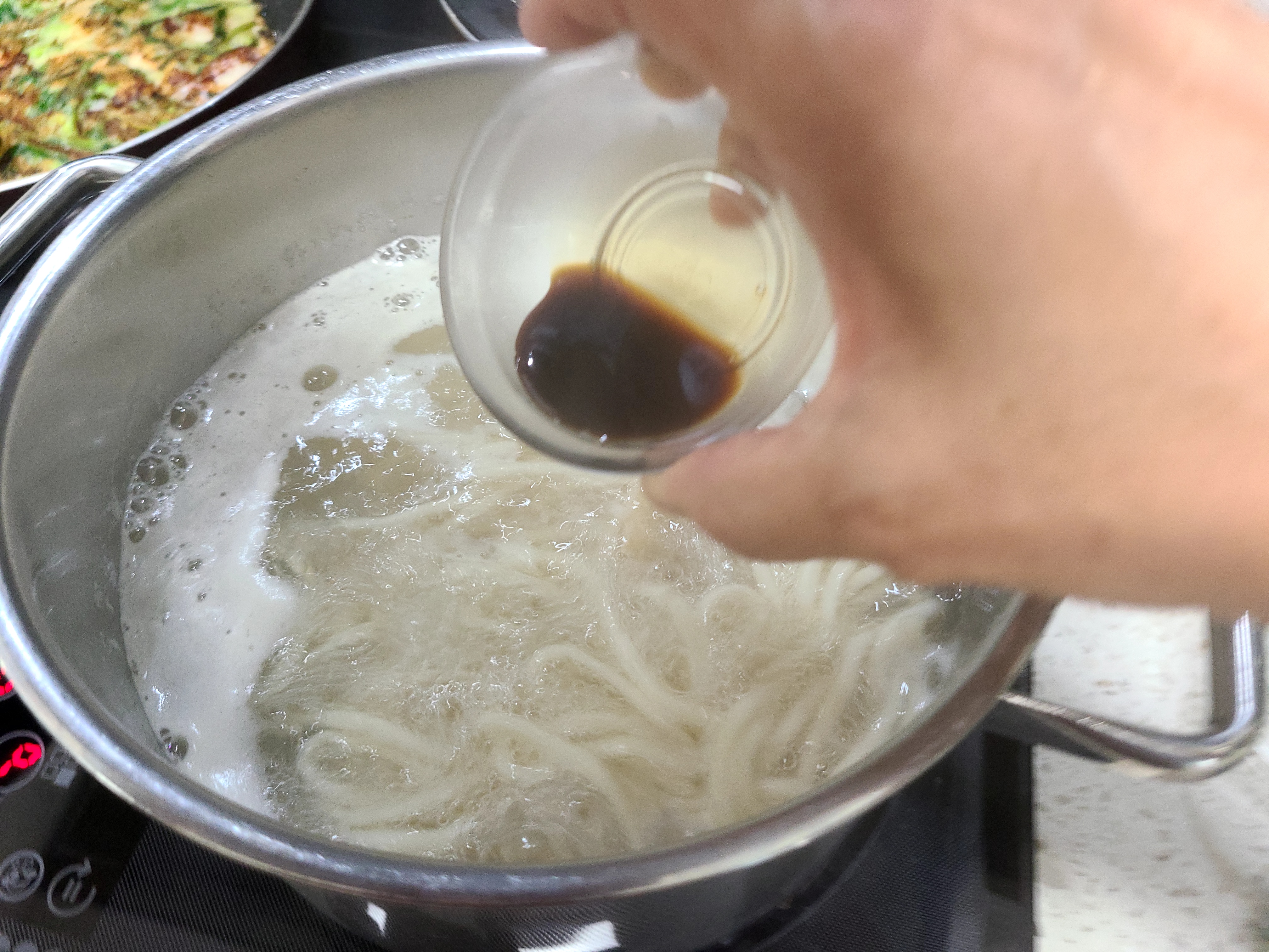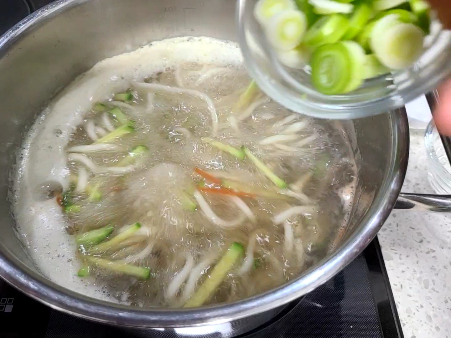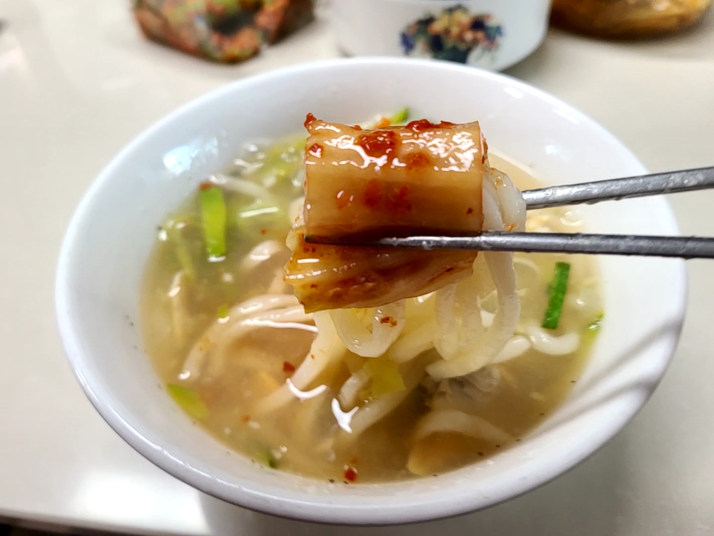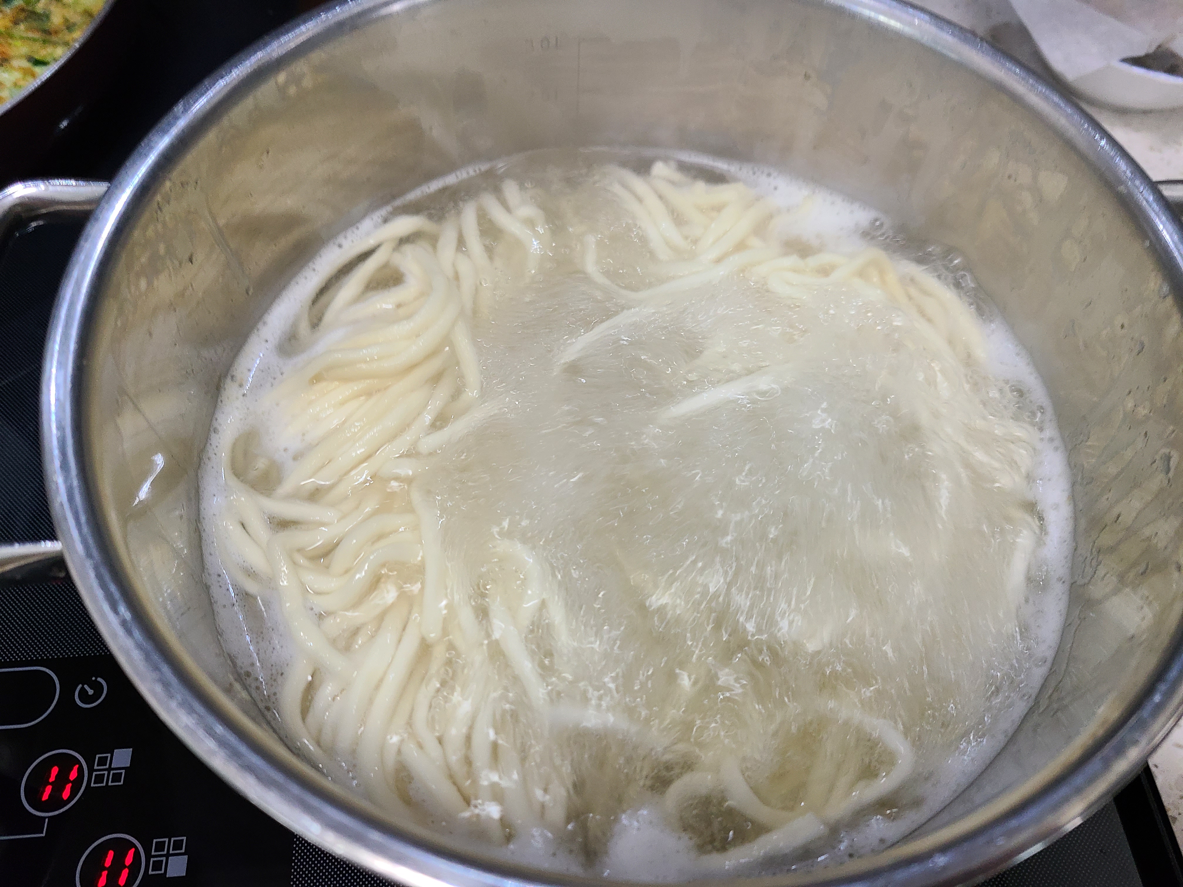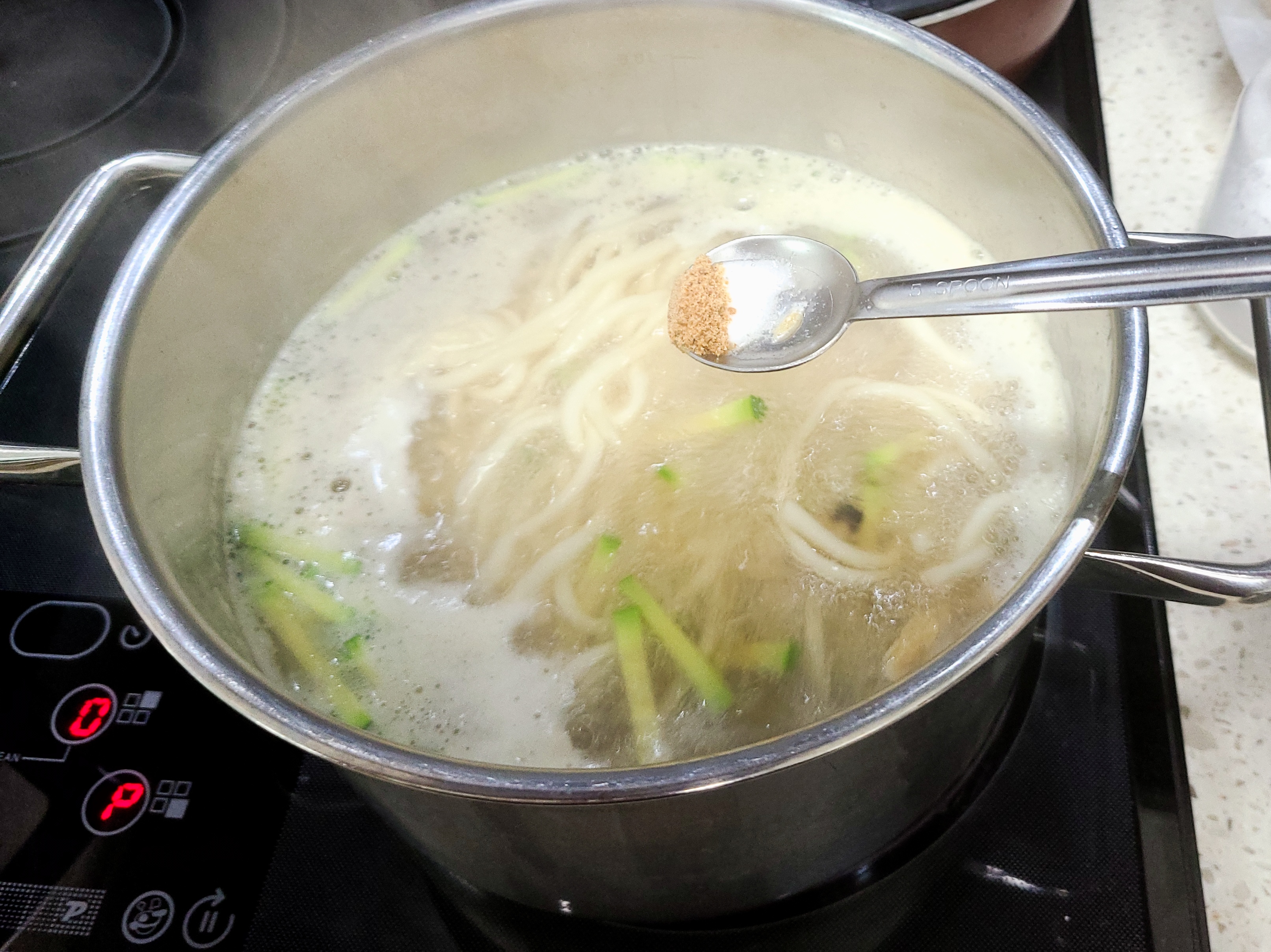 7. 면을 넣은 후 6분이 지나면 국물 간을 보아 싱거우면 소금 간을 해준다. 국물이 뜨거울 때는 짠맛이 덜 느껴질 수 있으니 심심하게 간을 하고 먹을 때 추가로 간을 해주는 것이 더 좋다. 양념장을 따로 만들어 얹어 주기도 하는데 오늘은 부침개까지 함께 만드냐고 그냥 넘어간다. 썰어놓은 대파를 넣고 1분 후 불을 끈다.