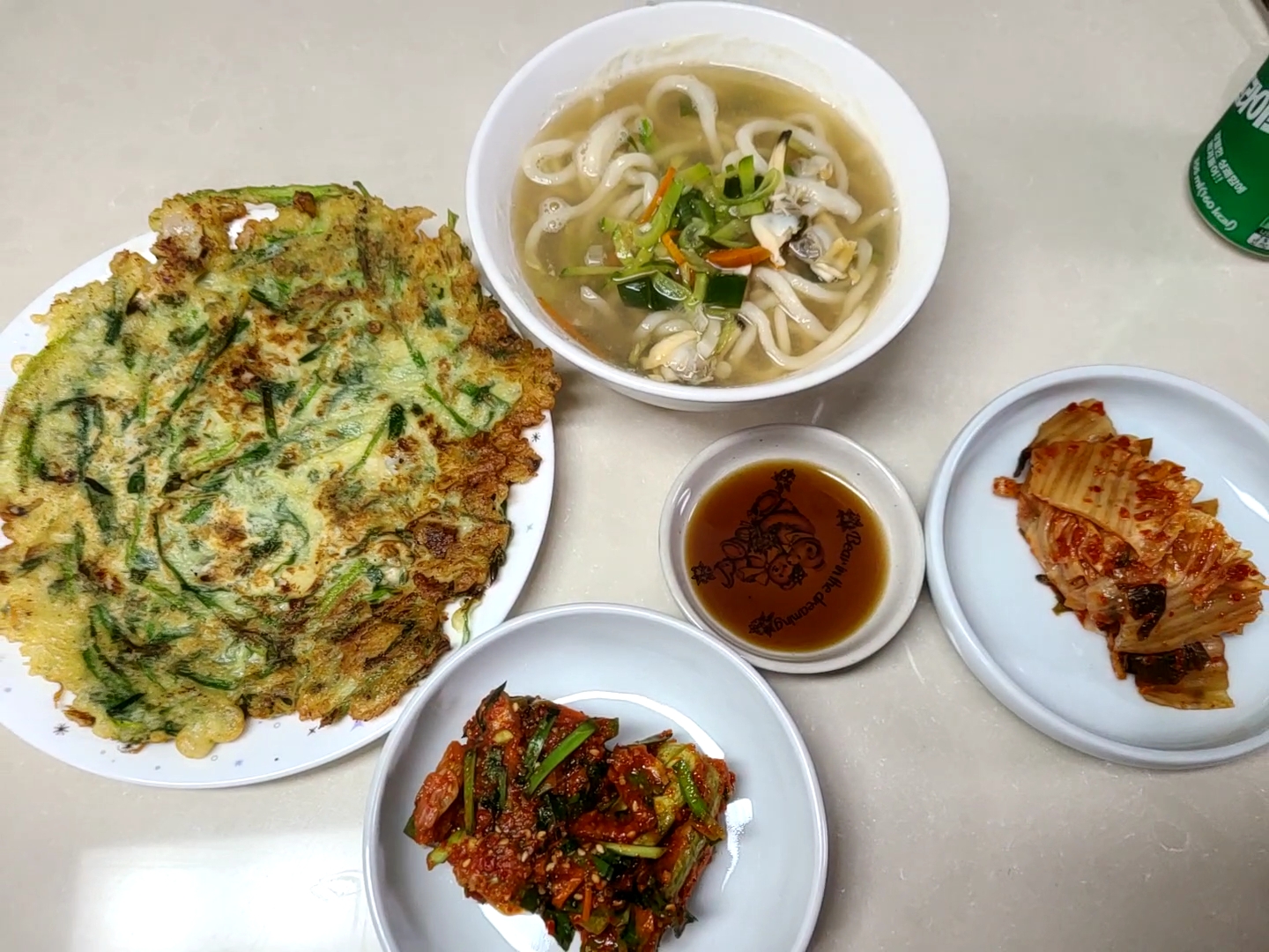 바지락 칼국수와 바지락을 넣은 미나리 부침개를 차려놓으니 남편은 맥주 한 캔을 꺼내온다.ㅠㅠ