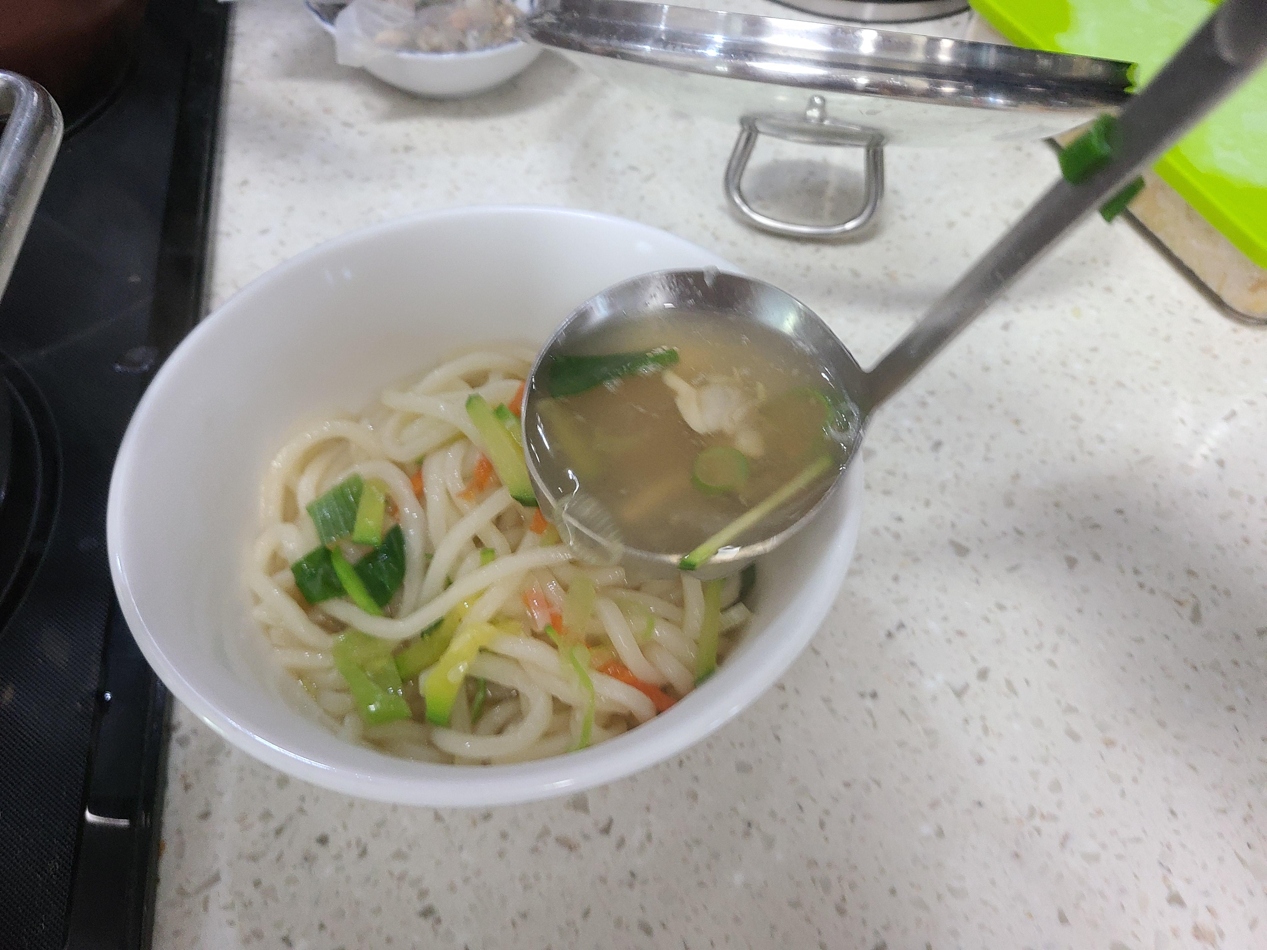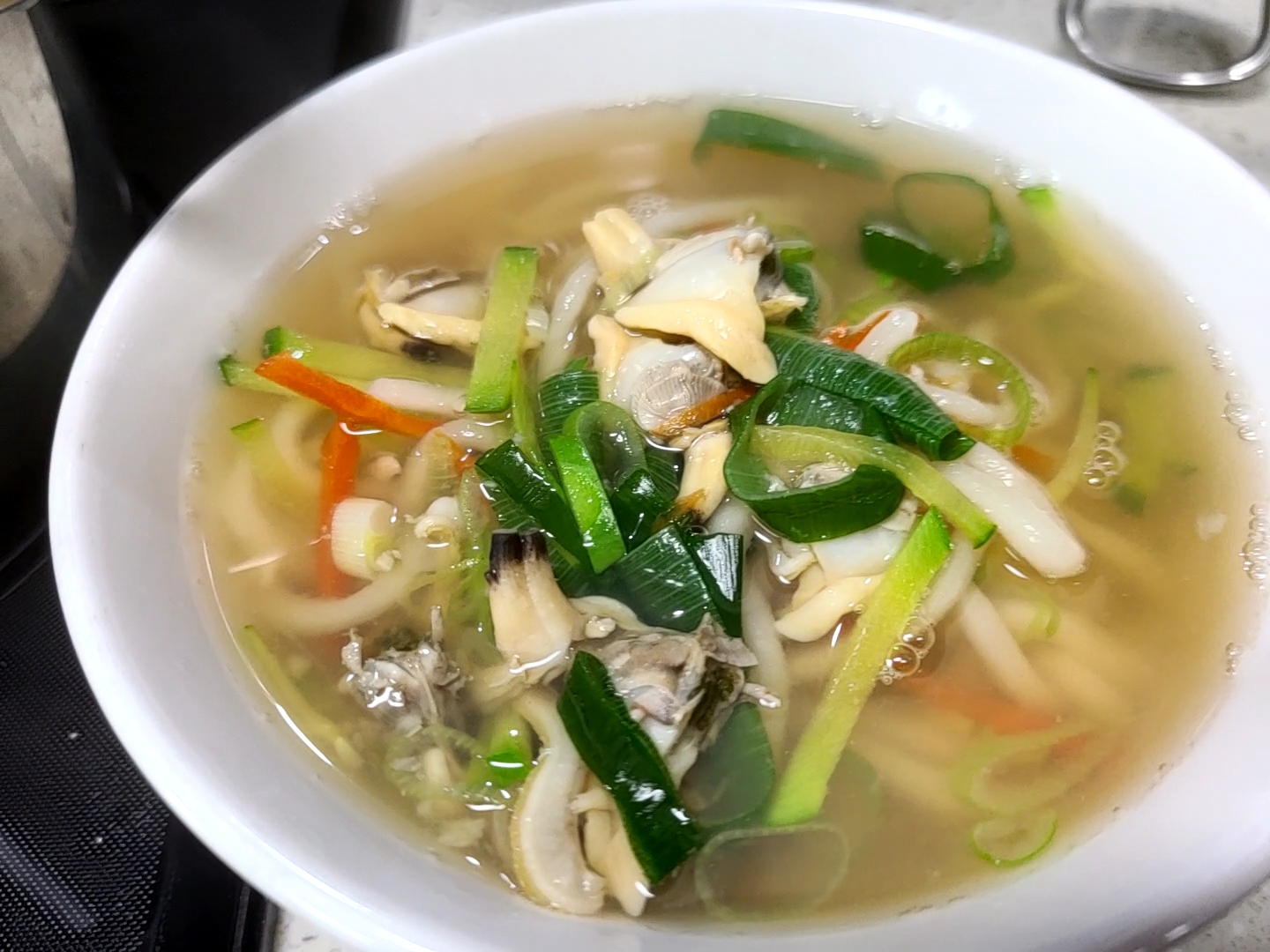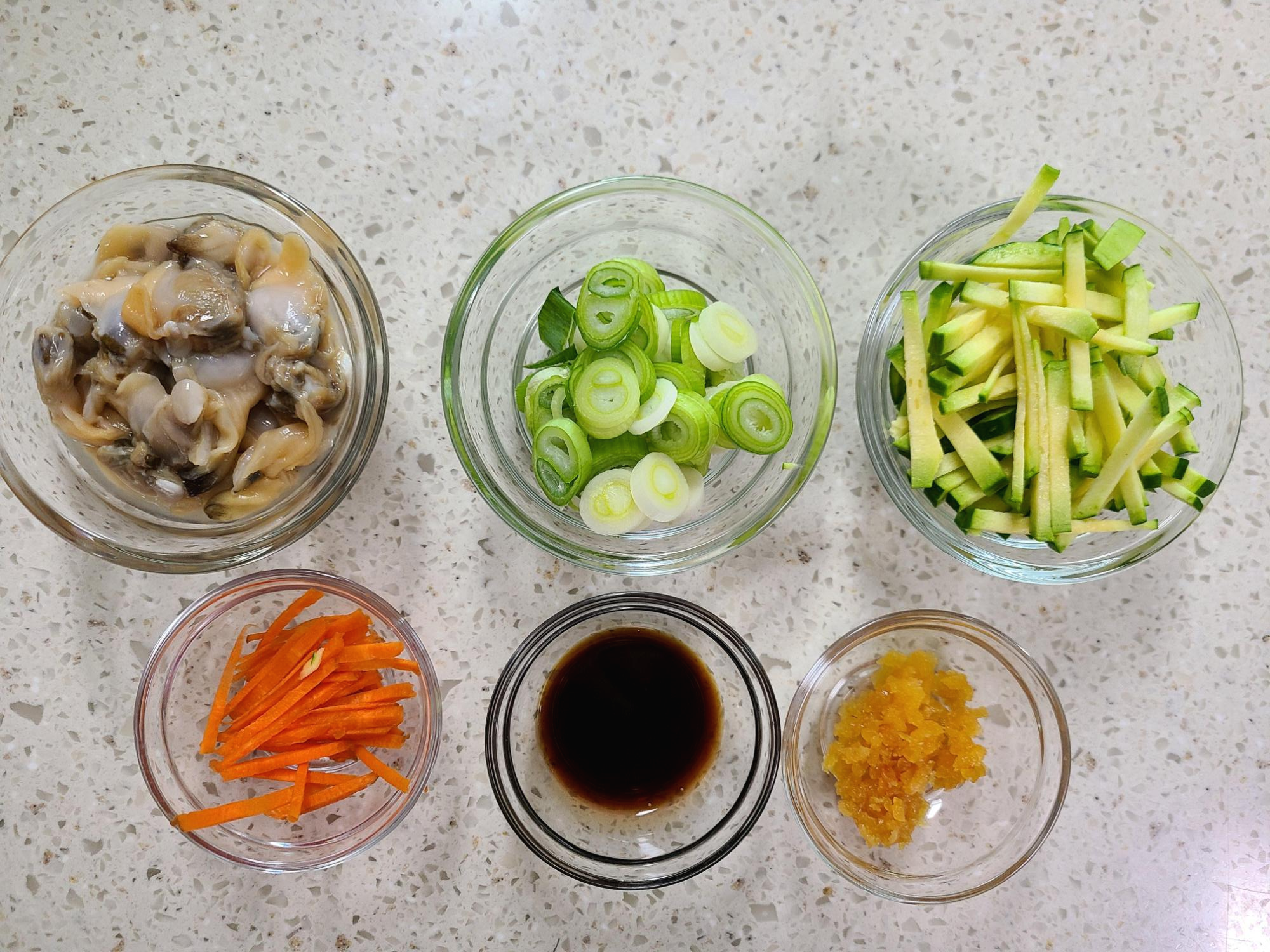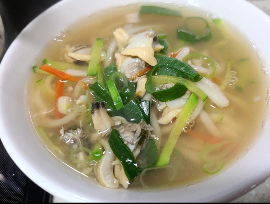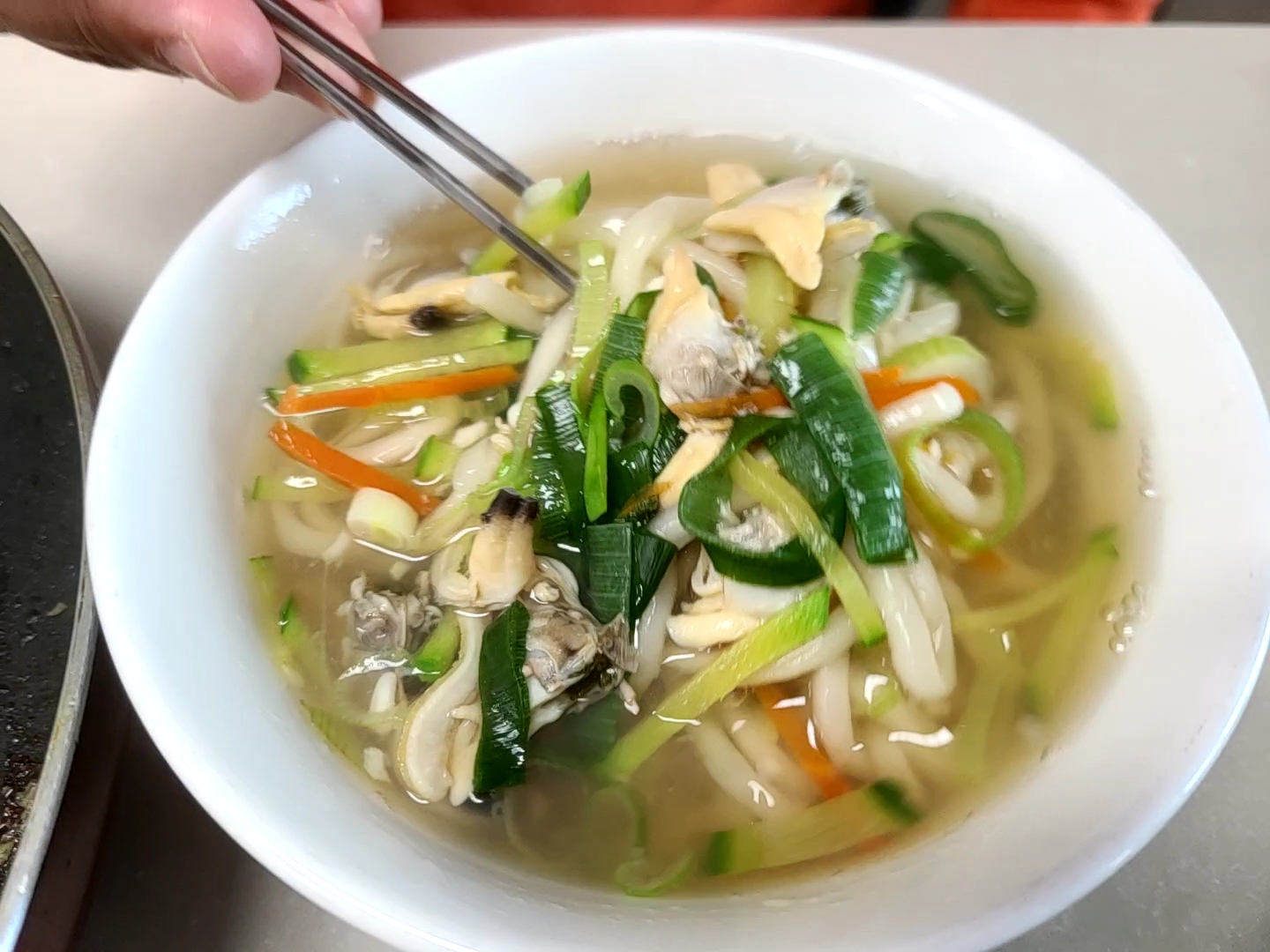 재료: 생칼국수 면 2인분(270g), 깐 바지락 1컵, 채 썬 애호박 1컵, 당근 약간, 대파, 마늘, 국간장