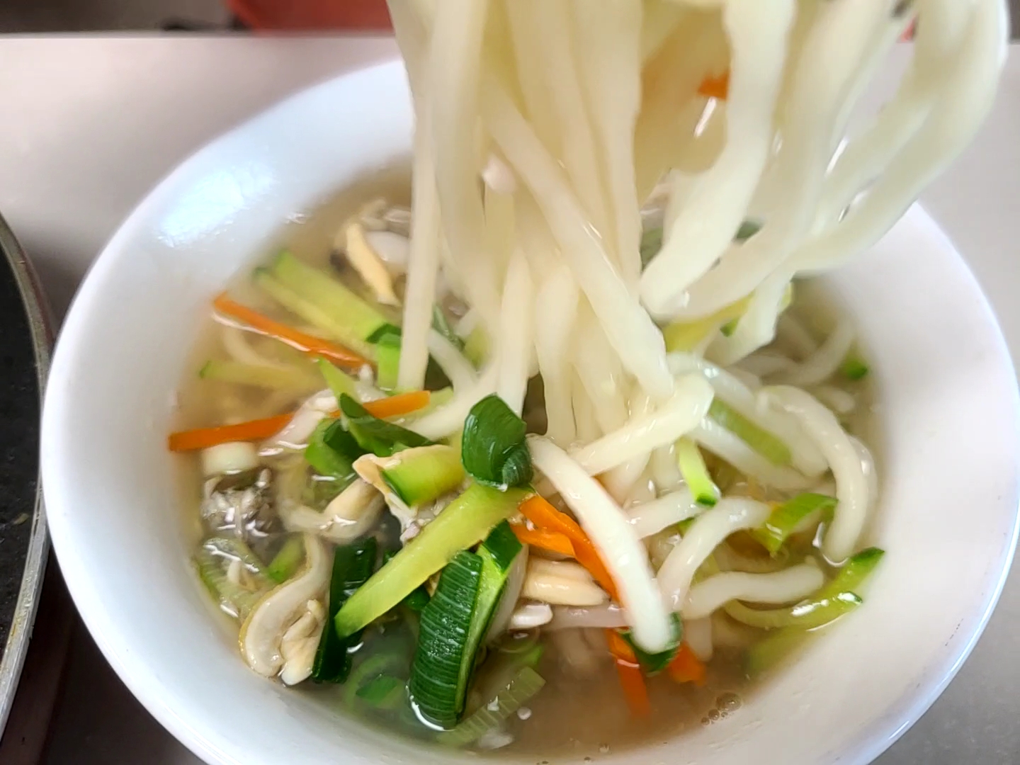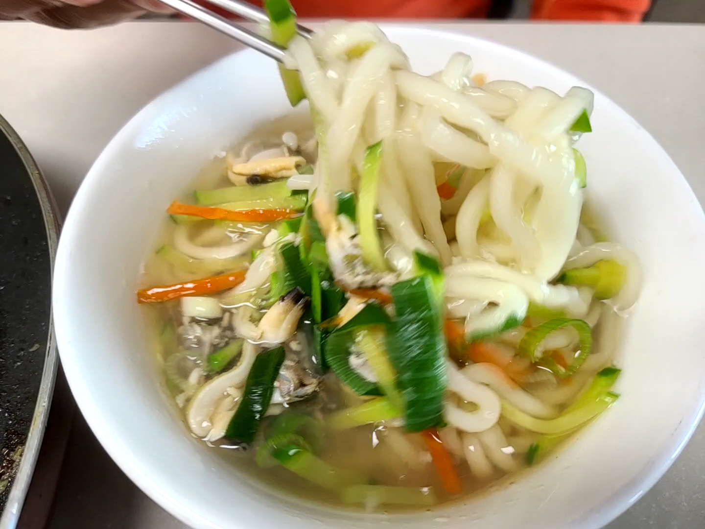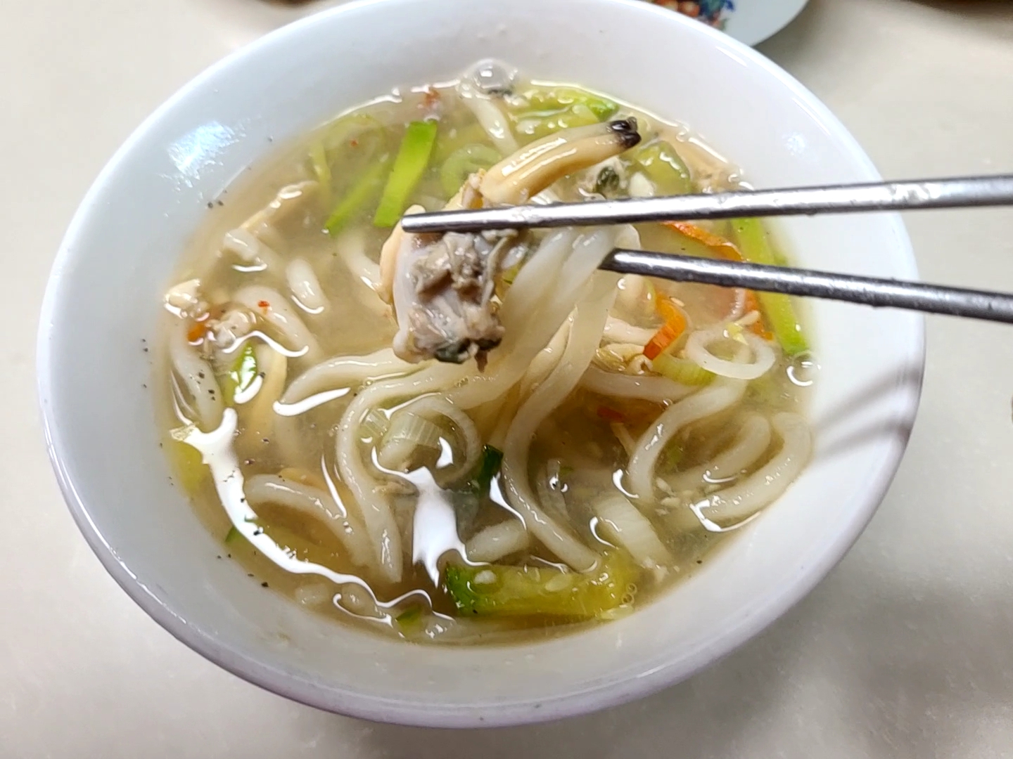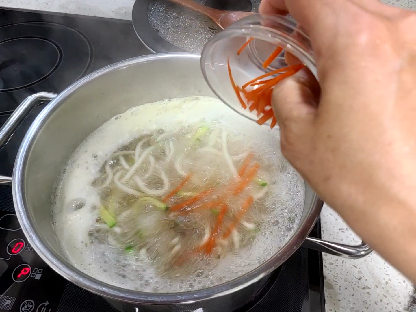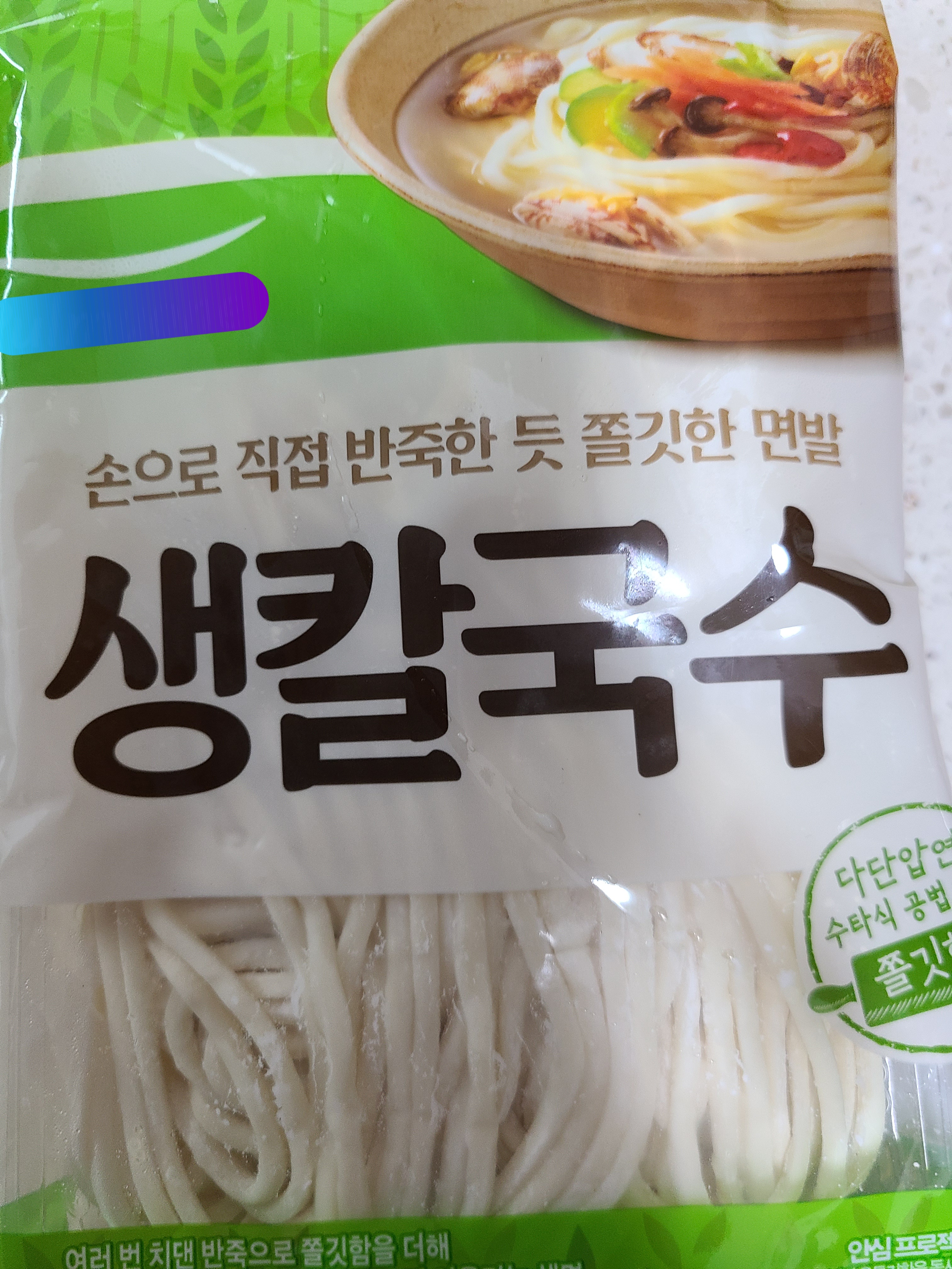 재료: 생칼국수 면 2인분(270g), 깐 바지락 1컵, 채 썬 애호박 1컵, 당근 약간, 대파, 마늘, 국간장
