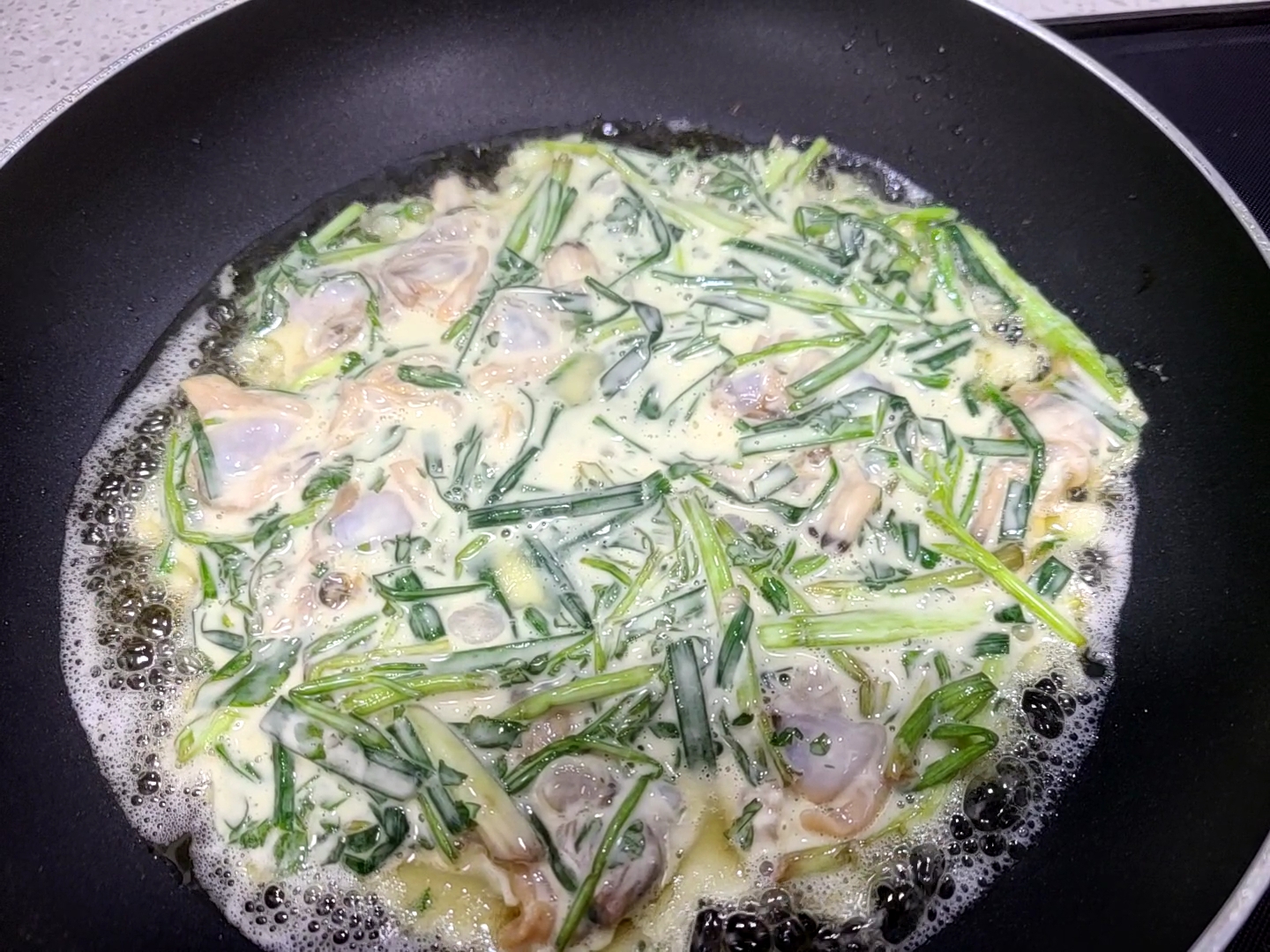 바지락과 미나리를 넣은 부침개가 노릇노릇하게 구워지고 있다.