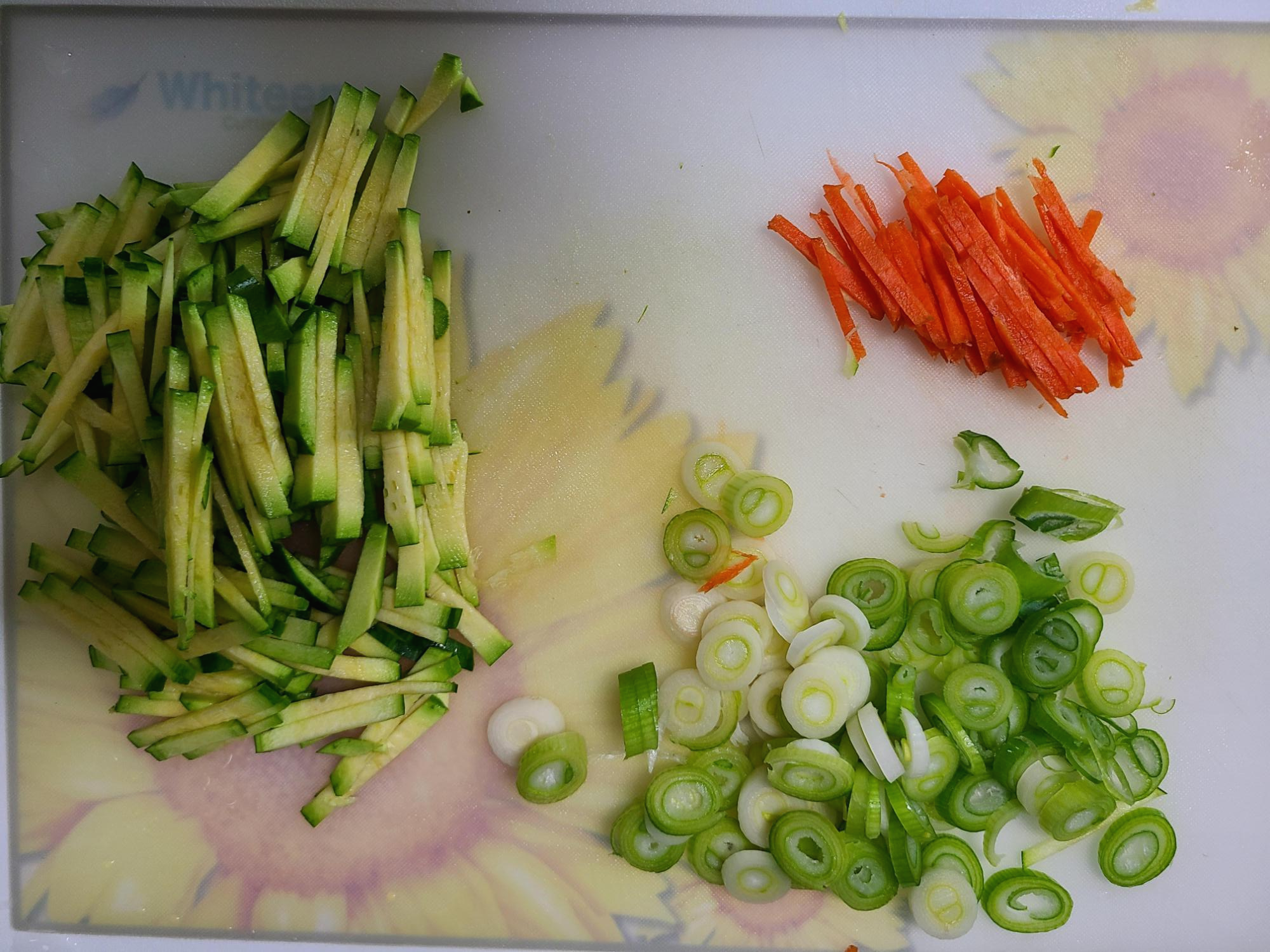6. 채 썰어놓은 호박과 당근을 넣어준다. 호박에 단맛이 있기에 양파는 생략하고 다진 마늘 1/2 큰술을 넣어 주었다.