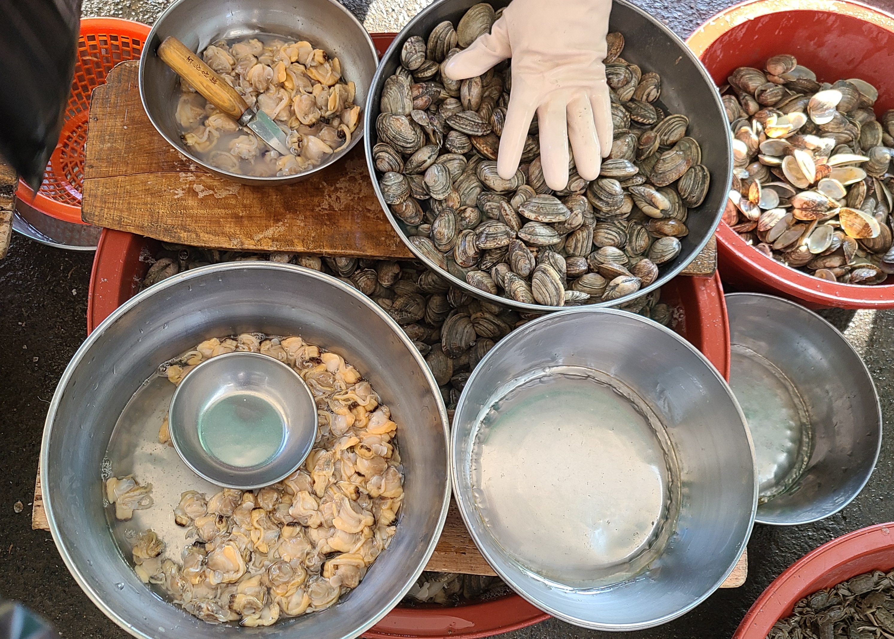 영암에서 집으로 돌아오던 날이 마침 장날이어서 야채와 생선을 사려고 영암장에 갔다. 영암 장날의 모습은 여전히 활기차다. 야채와 생선도 싱싱하지만 아주머니들이 갖고 나온 낙지와 바지락이 너무 싱싱해 보인다. 그날은 유난히 바지락이 장에 많이 나와 있다. 바지락을 파는 아주머니들이 자루에 들은 바지락을 까서 그릇에 담는데 손놀림이 장난이 아니다. 4월이어서 인지 바지락의 빛깔이 뽀얗고 알이 큼직하니 너무 좋다. 전날 강진 청자 식당에서 바지락 회무침을 너무 맛있게 먹었던 생각이 나서 바지락을 넉넉히 구입했다.