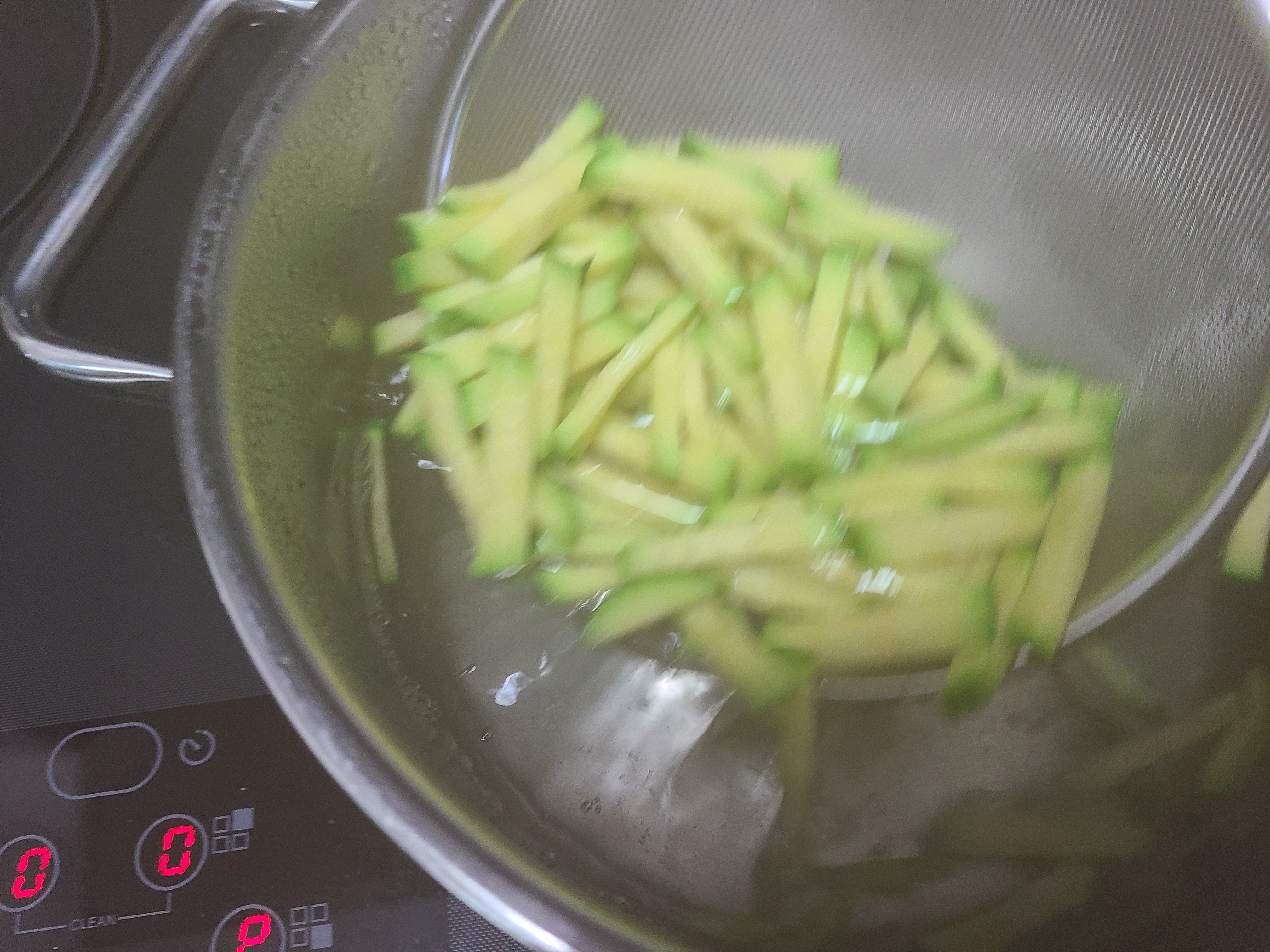 5. 바지락을 삶은 물에 애호박을 데쳐낸다.