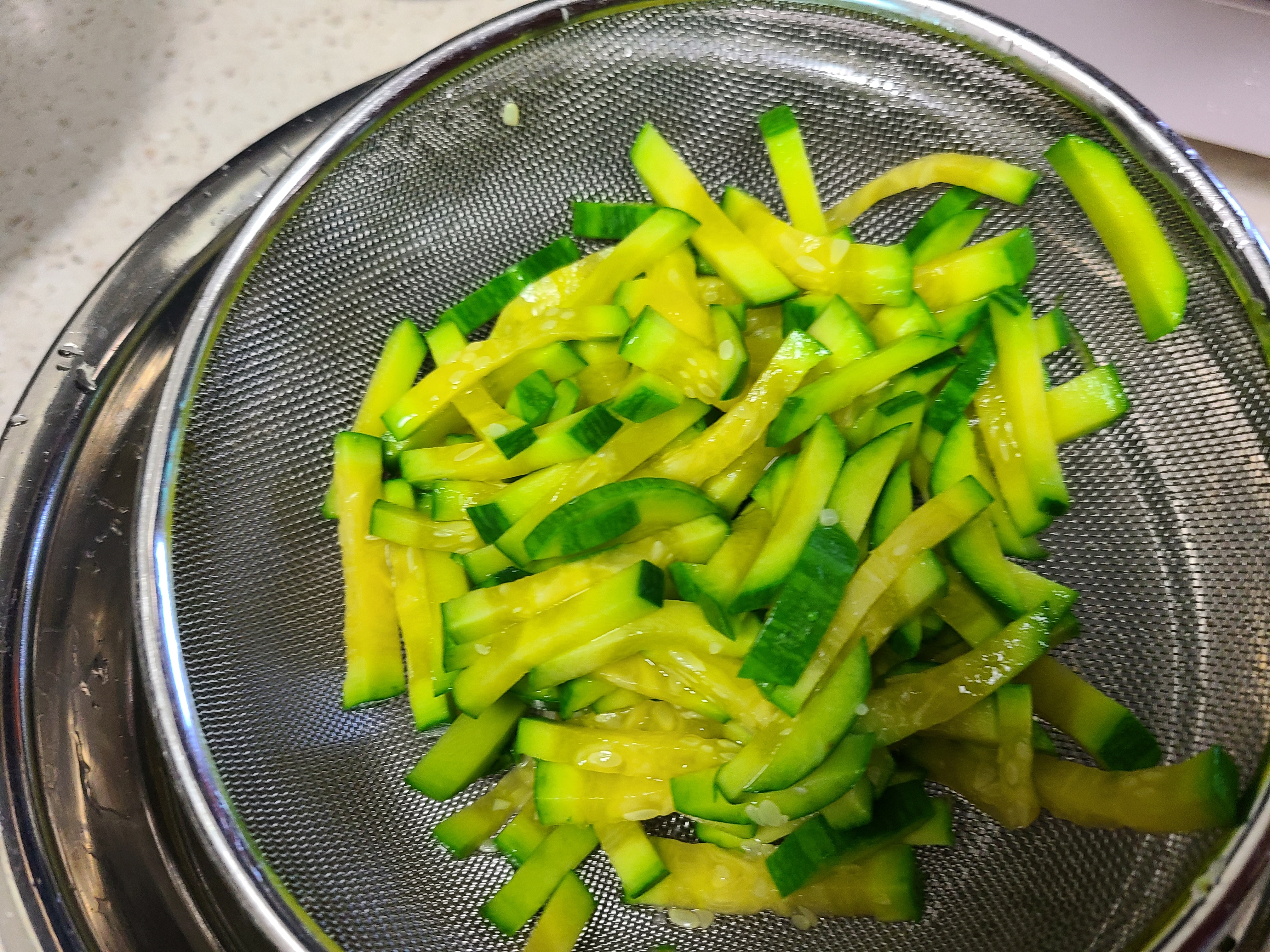 6. 데친 애호박은 찬물에 잠시 담갔다가 체에 바쳐 물기를 뺀 후 넓은 그릇에 담아 식혀준다.