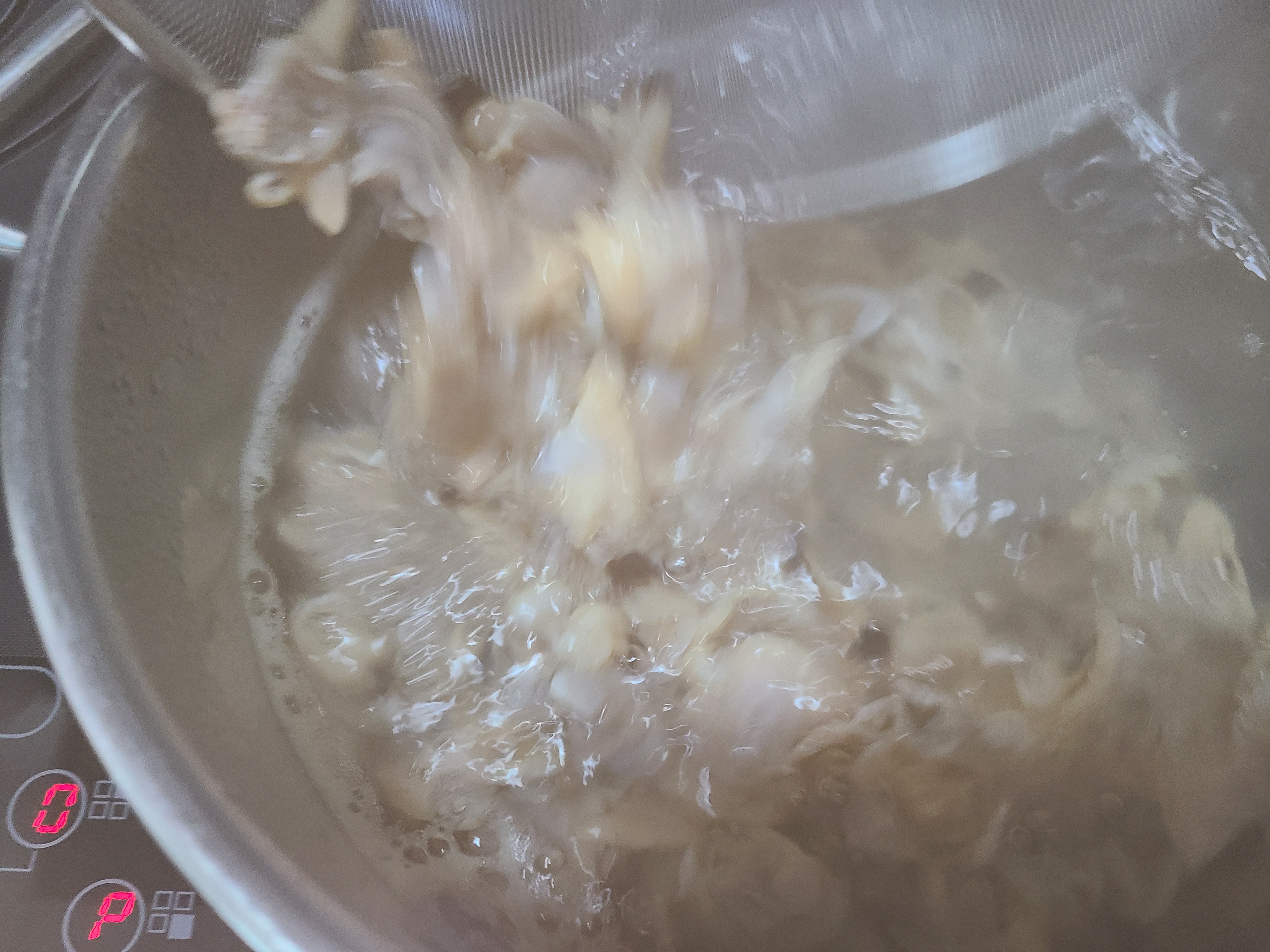 4. 바지락은 너무 오래 삶으면 질겨질 수 있으니 바지락살이 오그라 들면 바로 꺼내 체에 바쳐준다.