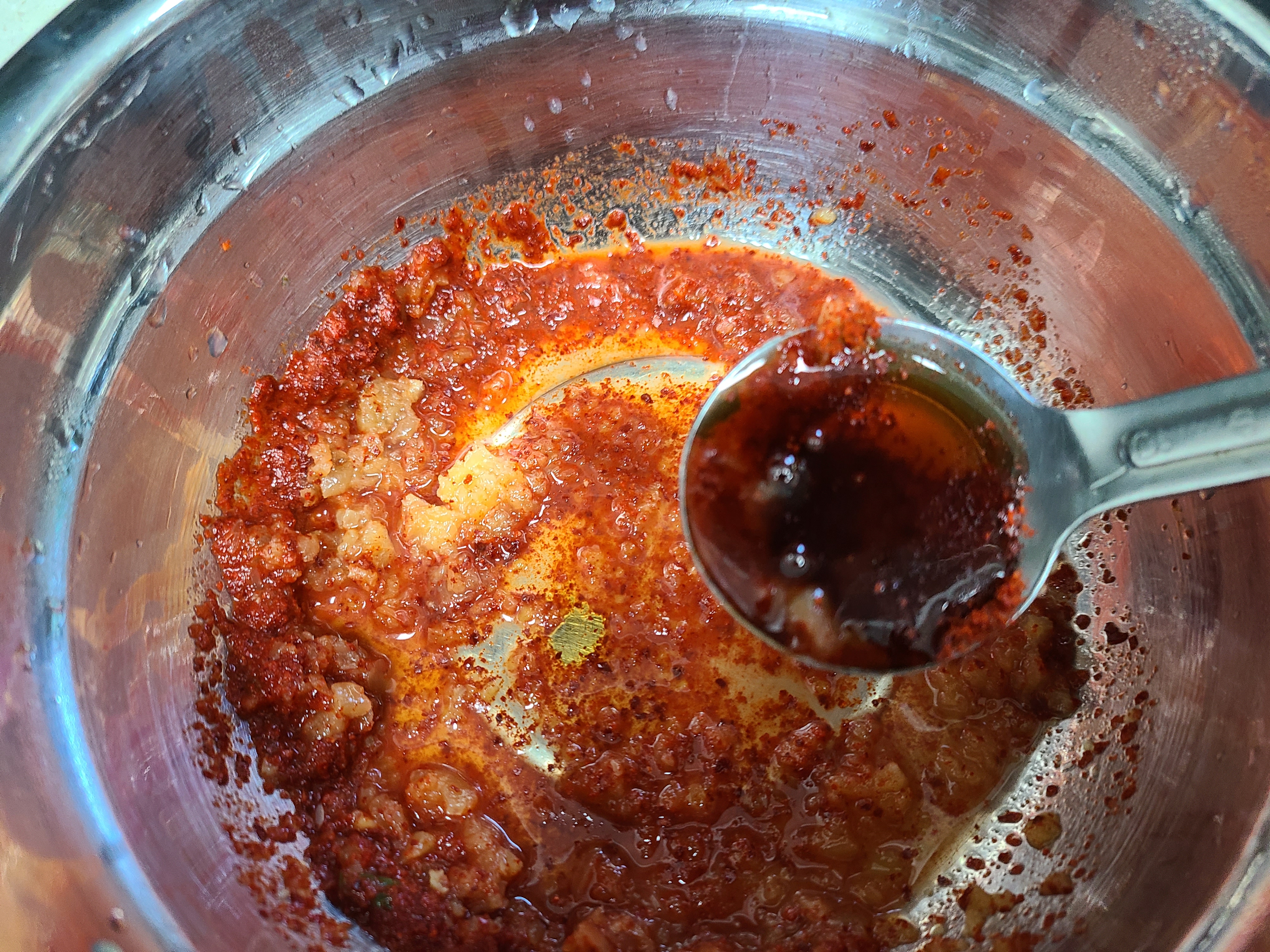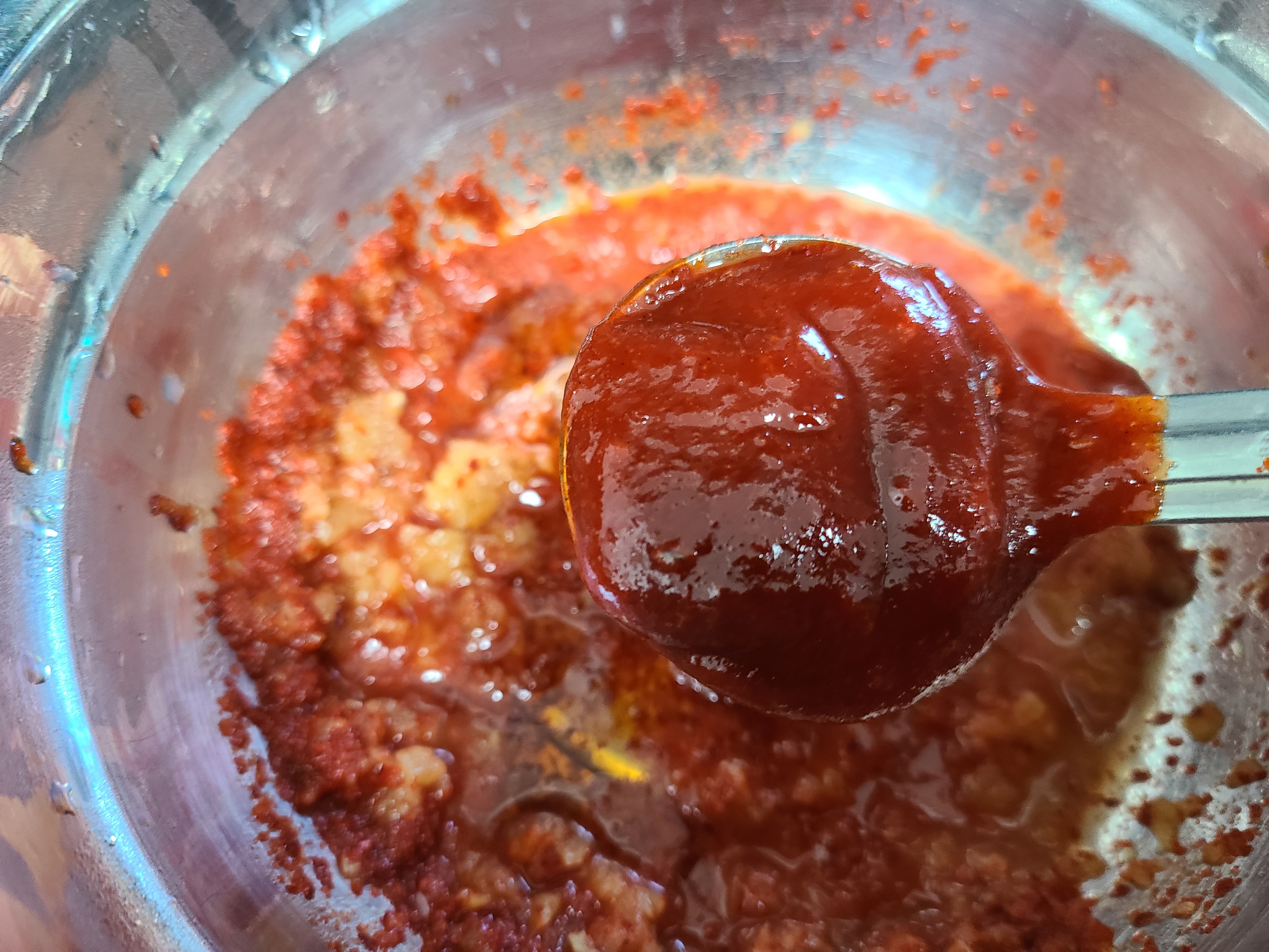 1. 바지락을 바쳐 놓았던 그릇에 남아 있는 바지락 국물에 양념장을 만든다. 마늘 1큰술, 고춧가루 1큰술, 고추장 3큰술을 넣어준다.