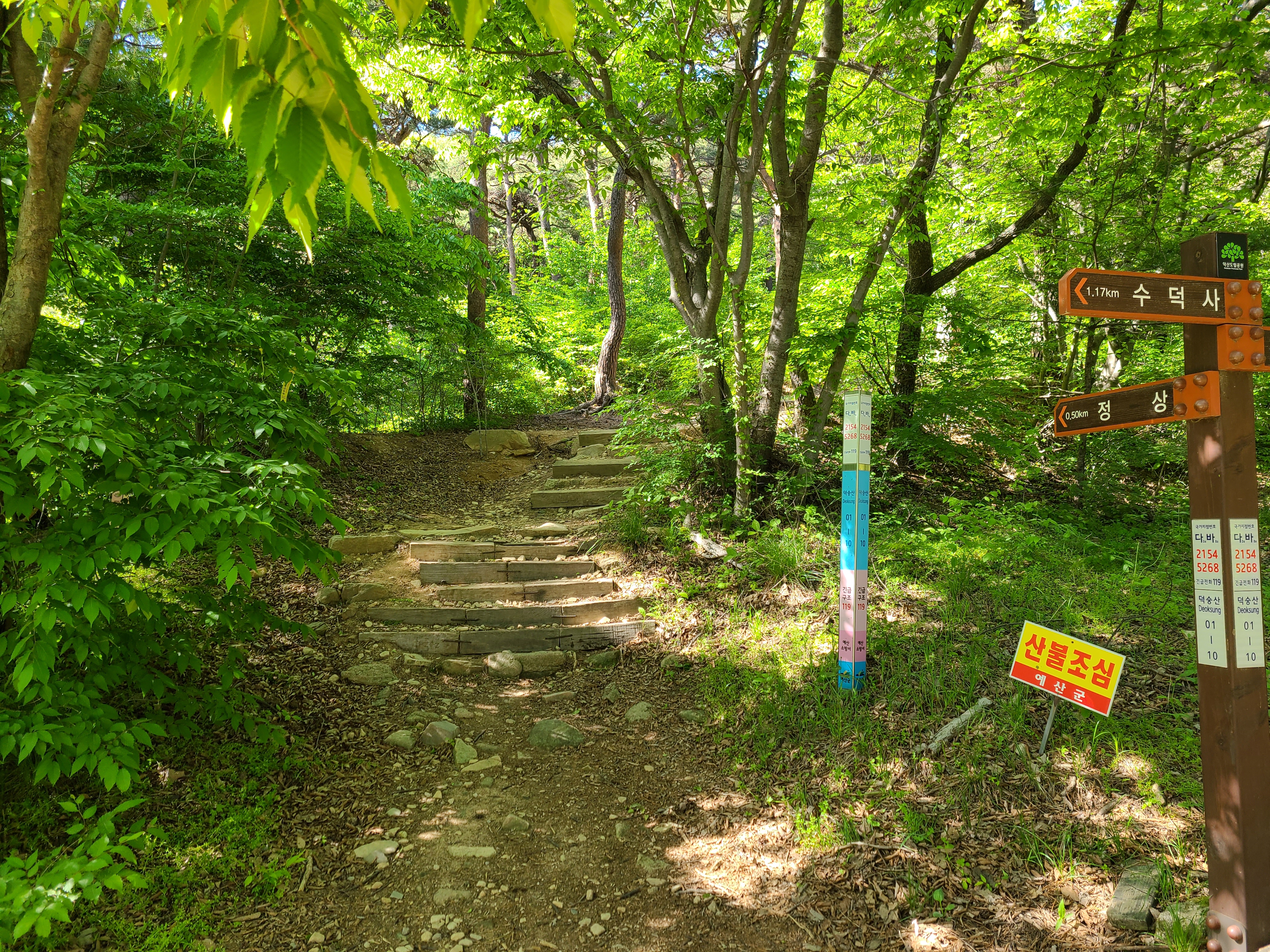왼쪽 정혜사와 만공탑을 거쳐 수덕사로 가는 길이 1.38km, 오른쪽 전월사가 200m, 덕숭산 정상까지는 0.53km가 남아있다. 정상을 500m 정도 남겨놓았기는 하지만 저녁 예약시간이 늦을 듯해서 수덕사 하행길로 발길을 돌렸다.