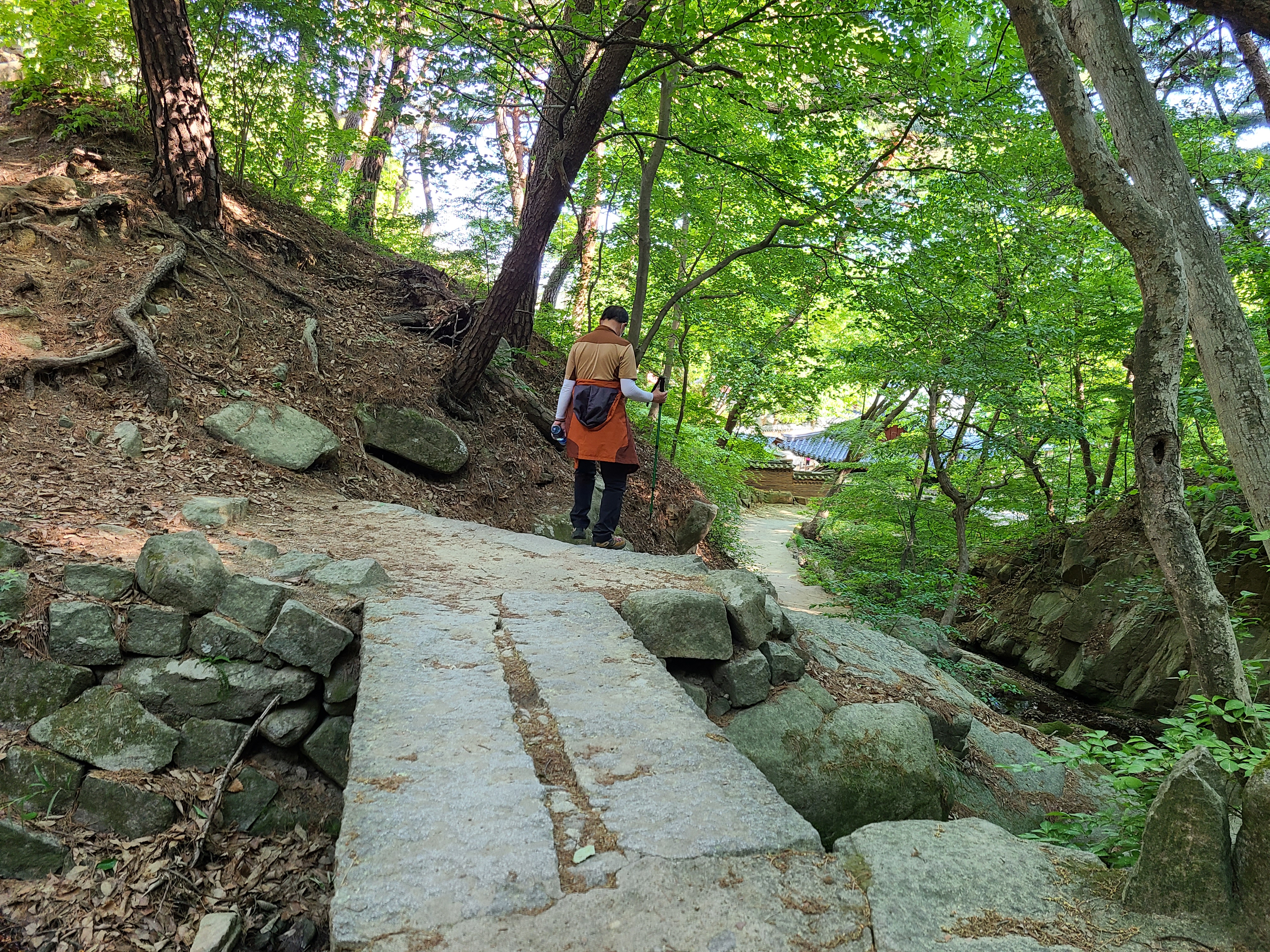 내려오는 길은 계속 가파른 돌계단으로 되어있는데 이 길을 걸어서 올라오려면 무척 힘들었을 것 같았다. 안내문에 보니 '벽초 스님의 1080돌 계단'은 대웅전에서 정혜사까지 올라오는데 40분이 소요된다고 되어있다. 내려오는 길에 젊은 청년 두 명이 숨을 몰아쉬며 땀을 흘리며 가파른 돌계단을 오르는 모습을 보더니 남편은 자기 덕분에 계단 없는 길로 올라온 거라며 생색을 낸다.
