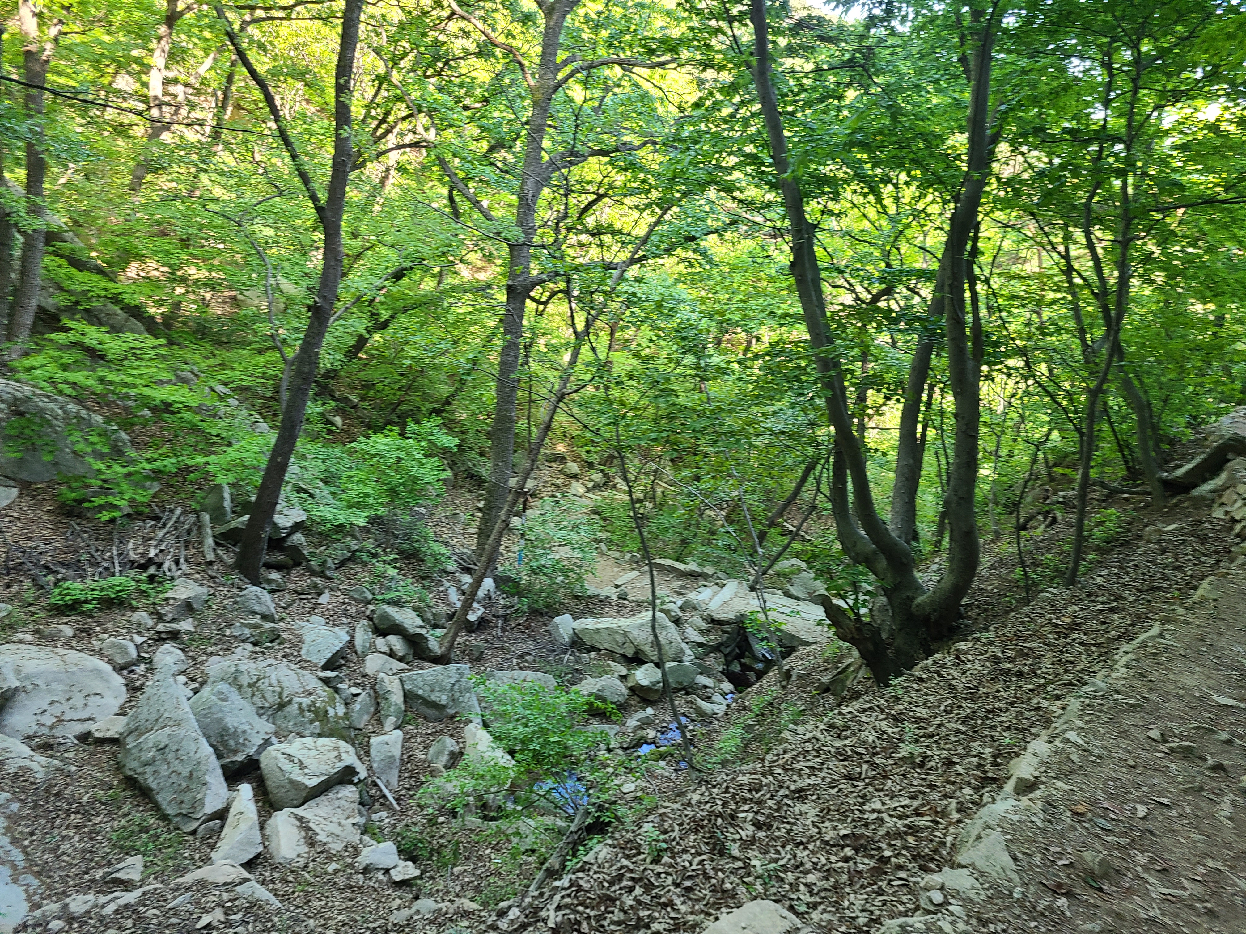 왼쪽으로 길을 접어 내려오다 보니 스님들이 농사를 짓는 듯한 밭이 보인다. 산짐승들 때문에 밭에 높은 담을 만든 듯하다.