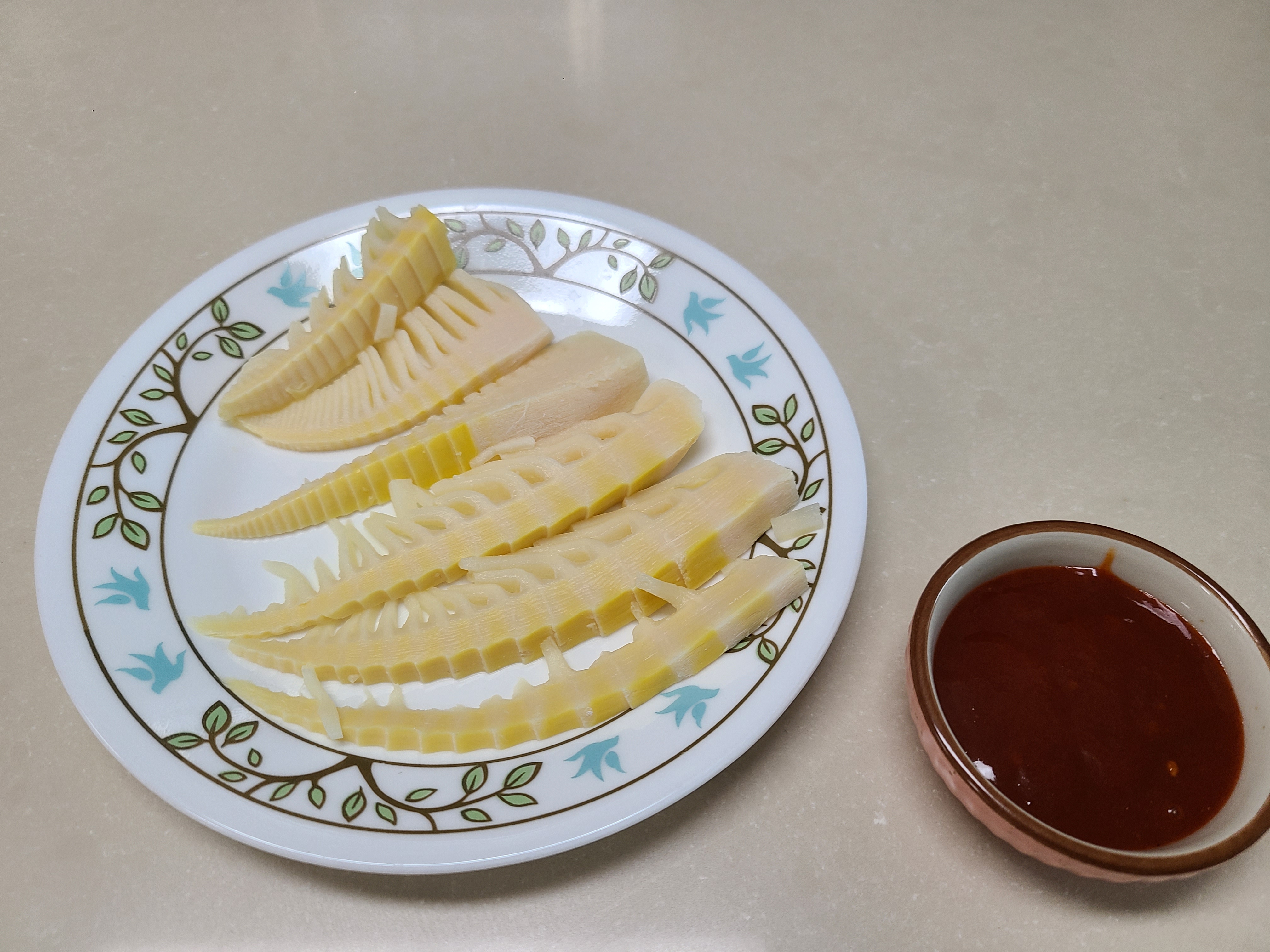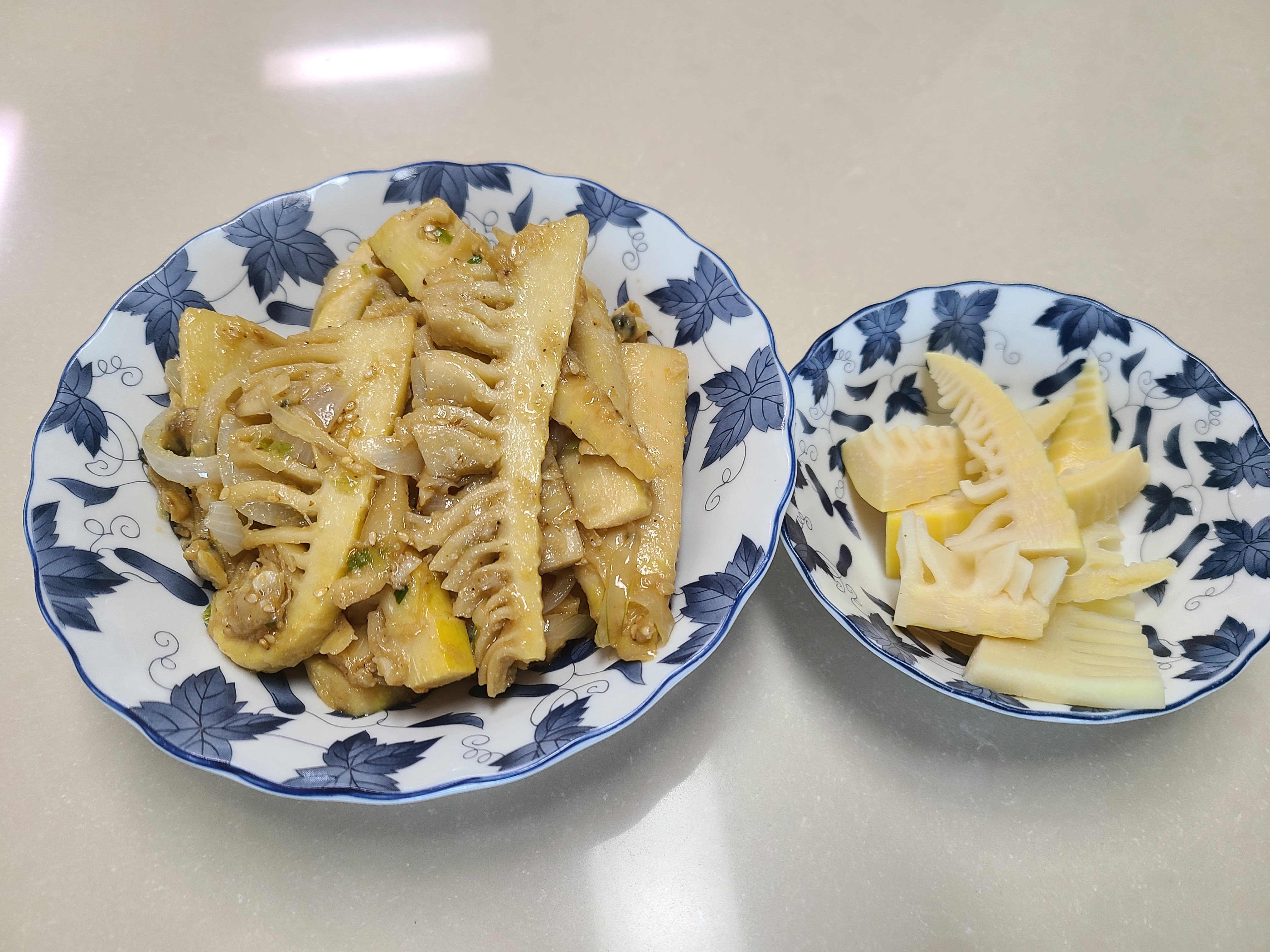 위 사진은 죽순을 구입해 와서 냉동하기 전에 만든 죽순 볶음과 초장에 찍어 먹으려고 담아놓은 죽순이다.