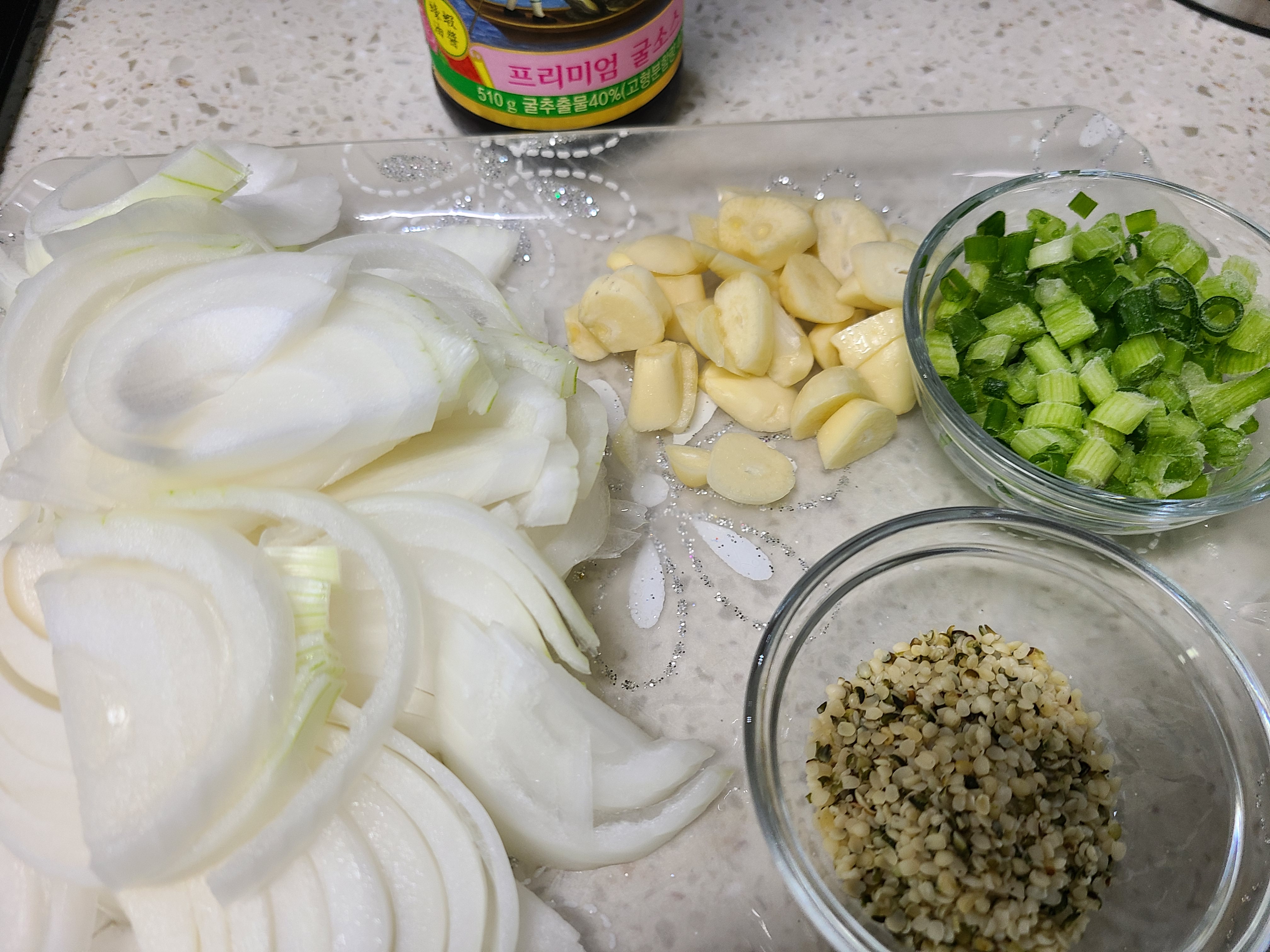 2. 양파 한 개를 채를 썰고 마늘도 얇게 썰어준다. 파는 썰어서 냉동실에 넣었던 것을 꺼내어 준비했다.