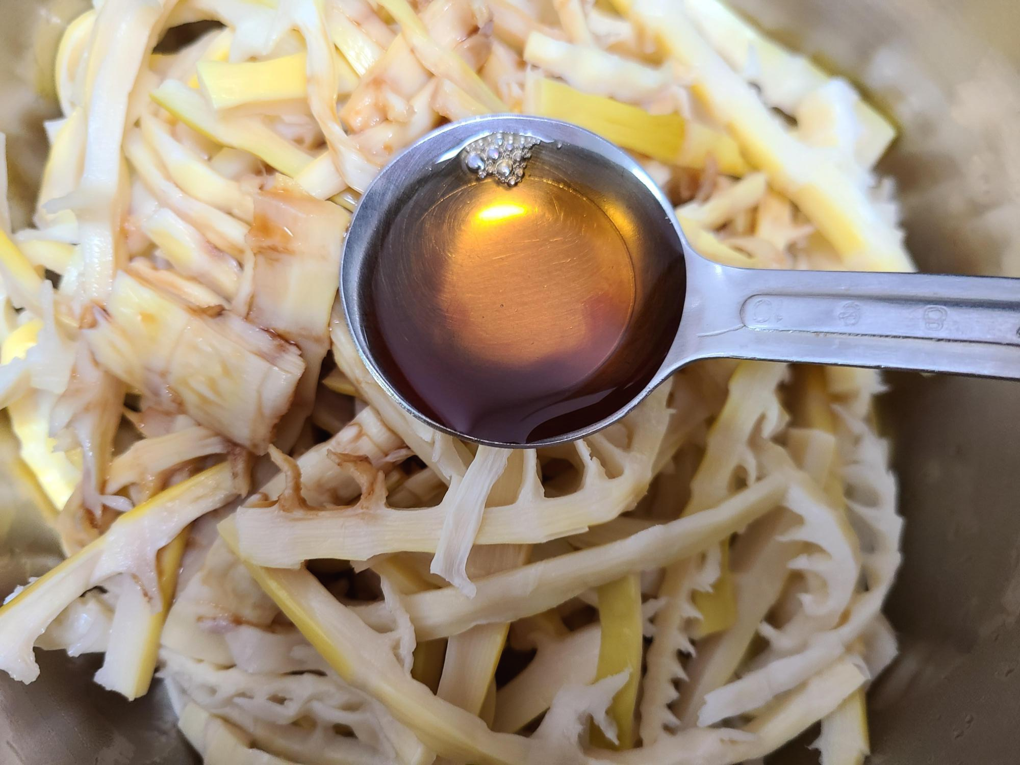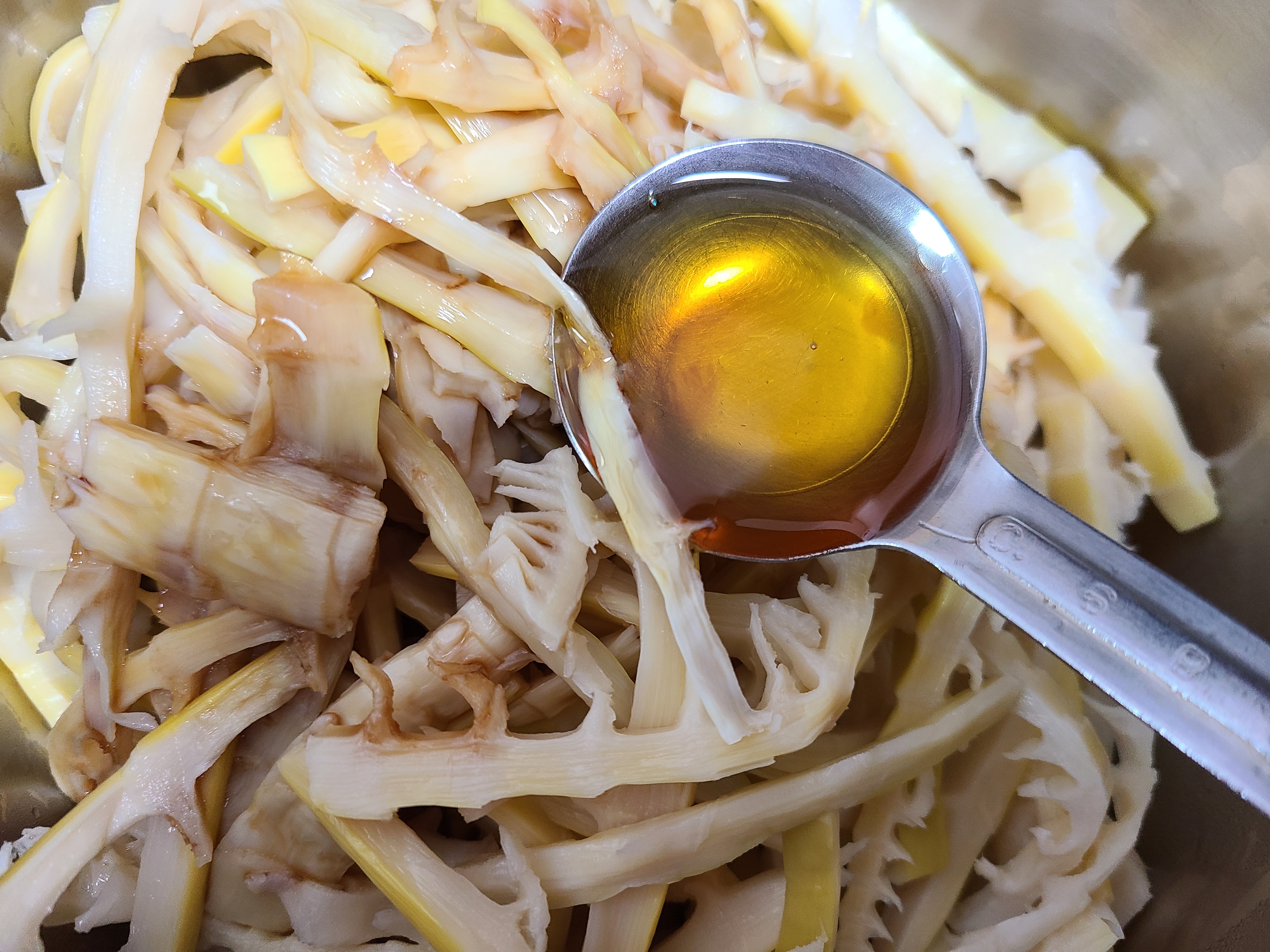 4. 죽순에 간이 배이면 들기름 2큰술을 넣어 버무려 준다.