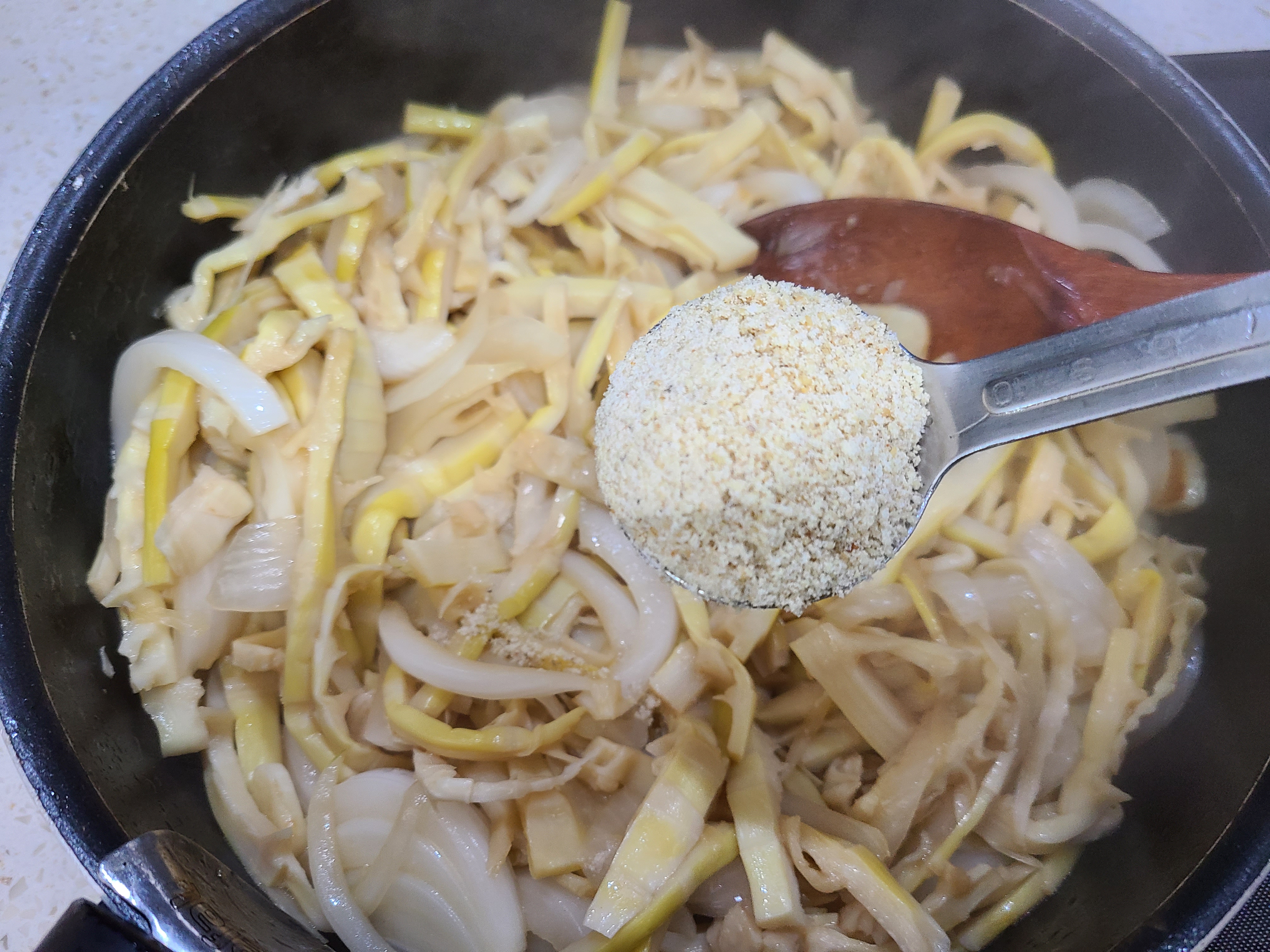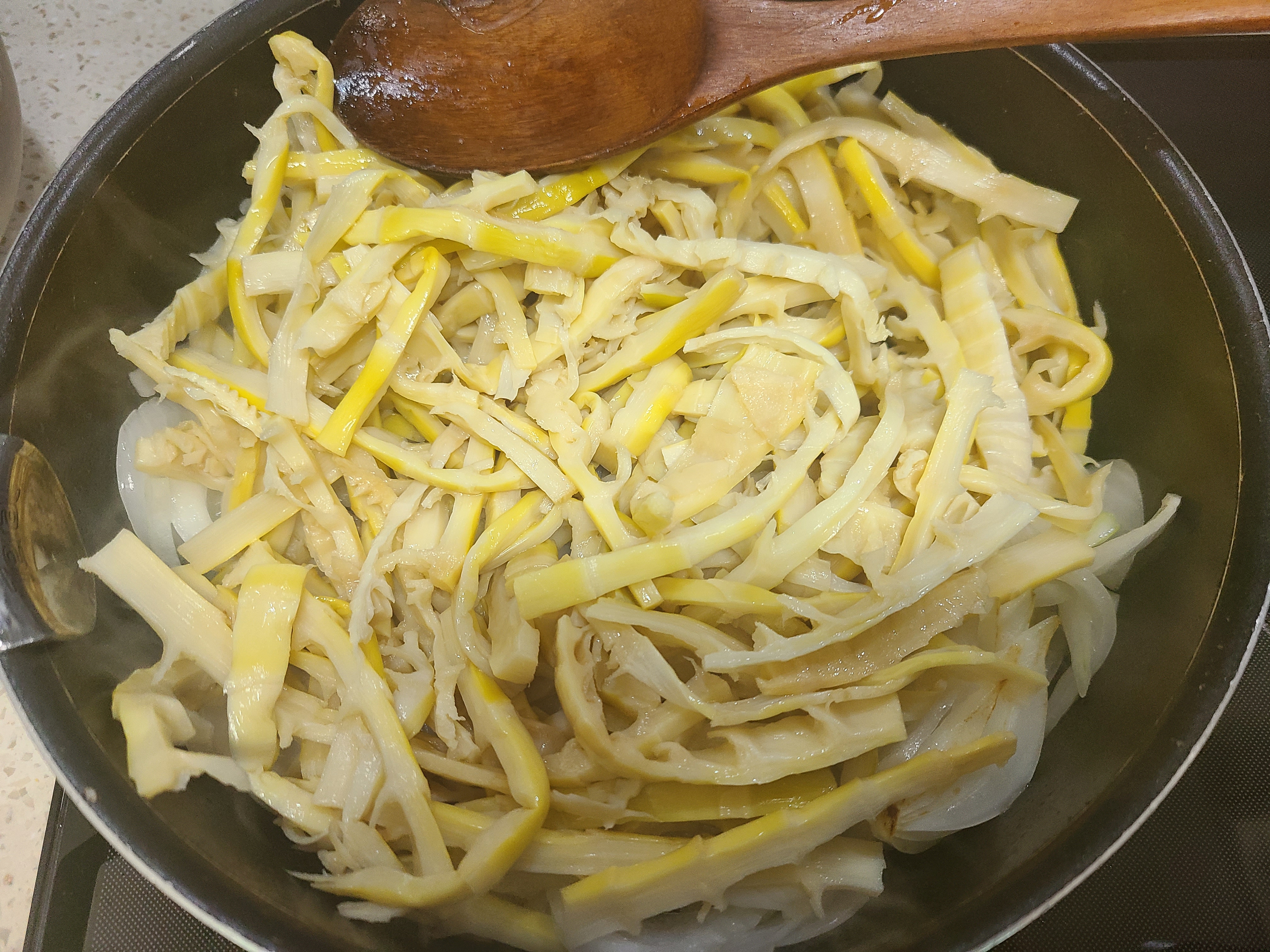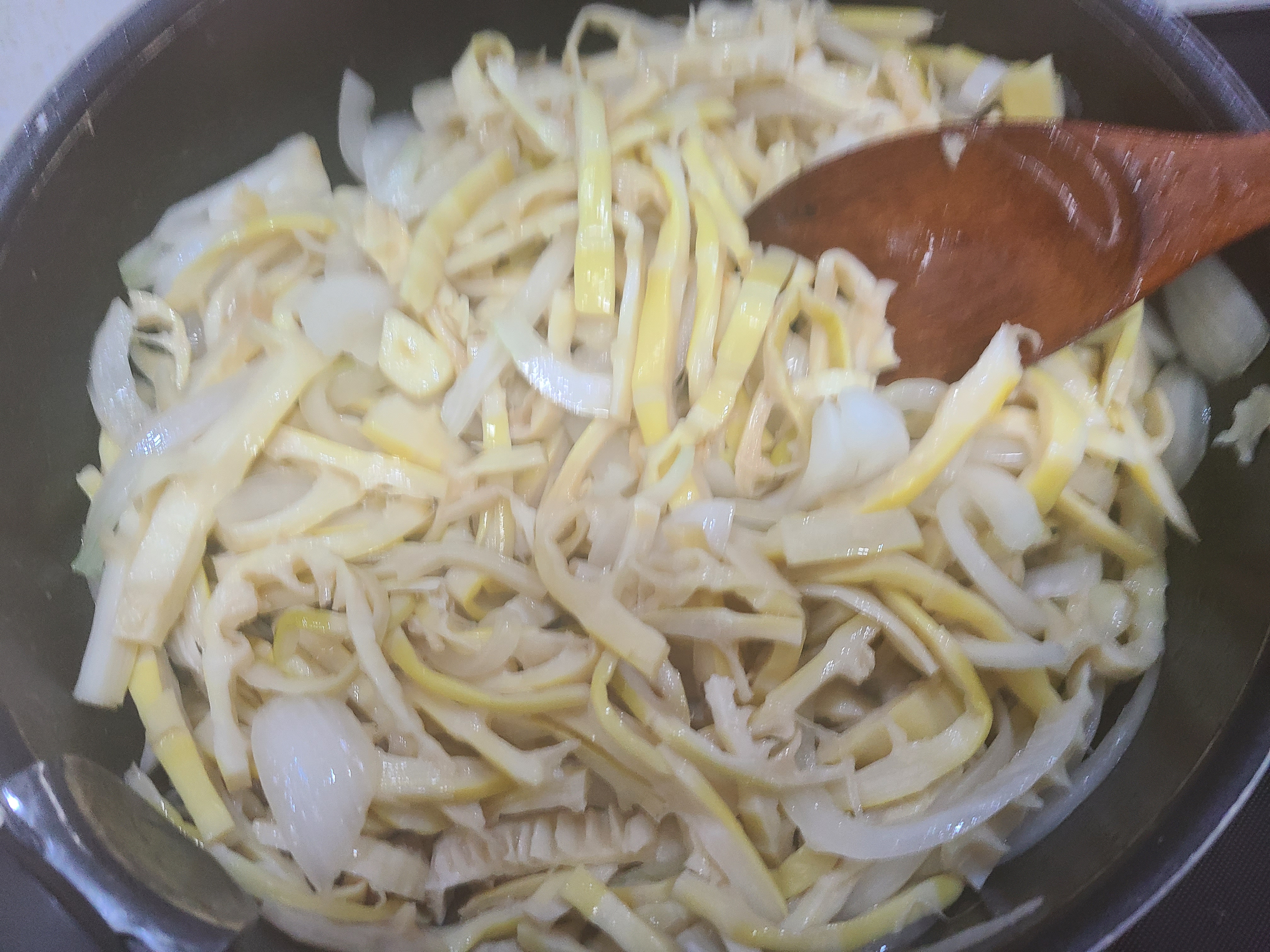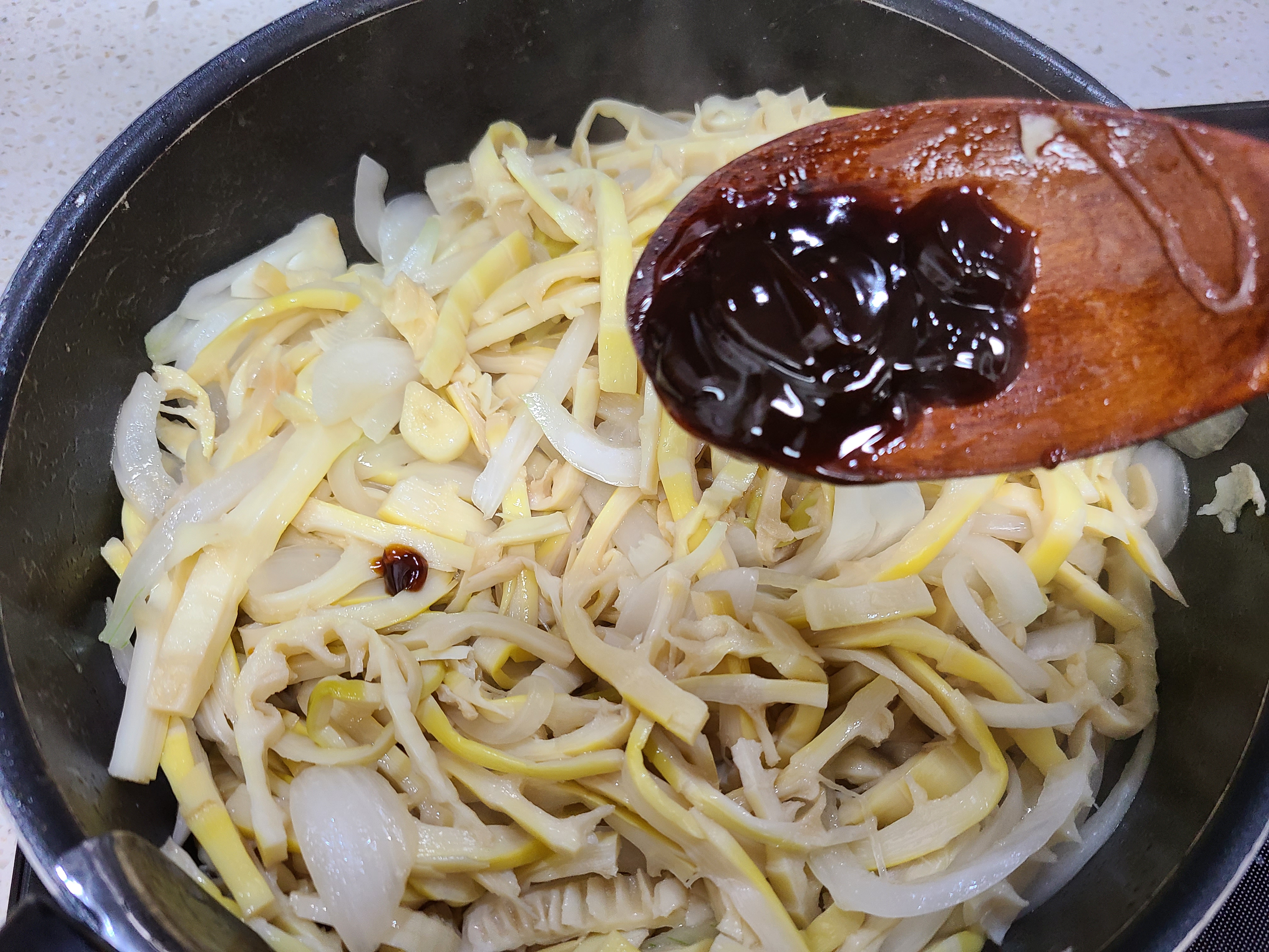7. 양념에 재워놓은 죽순을 넣고 볶는다.