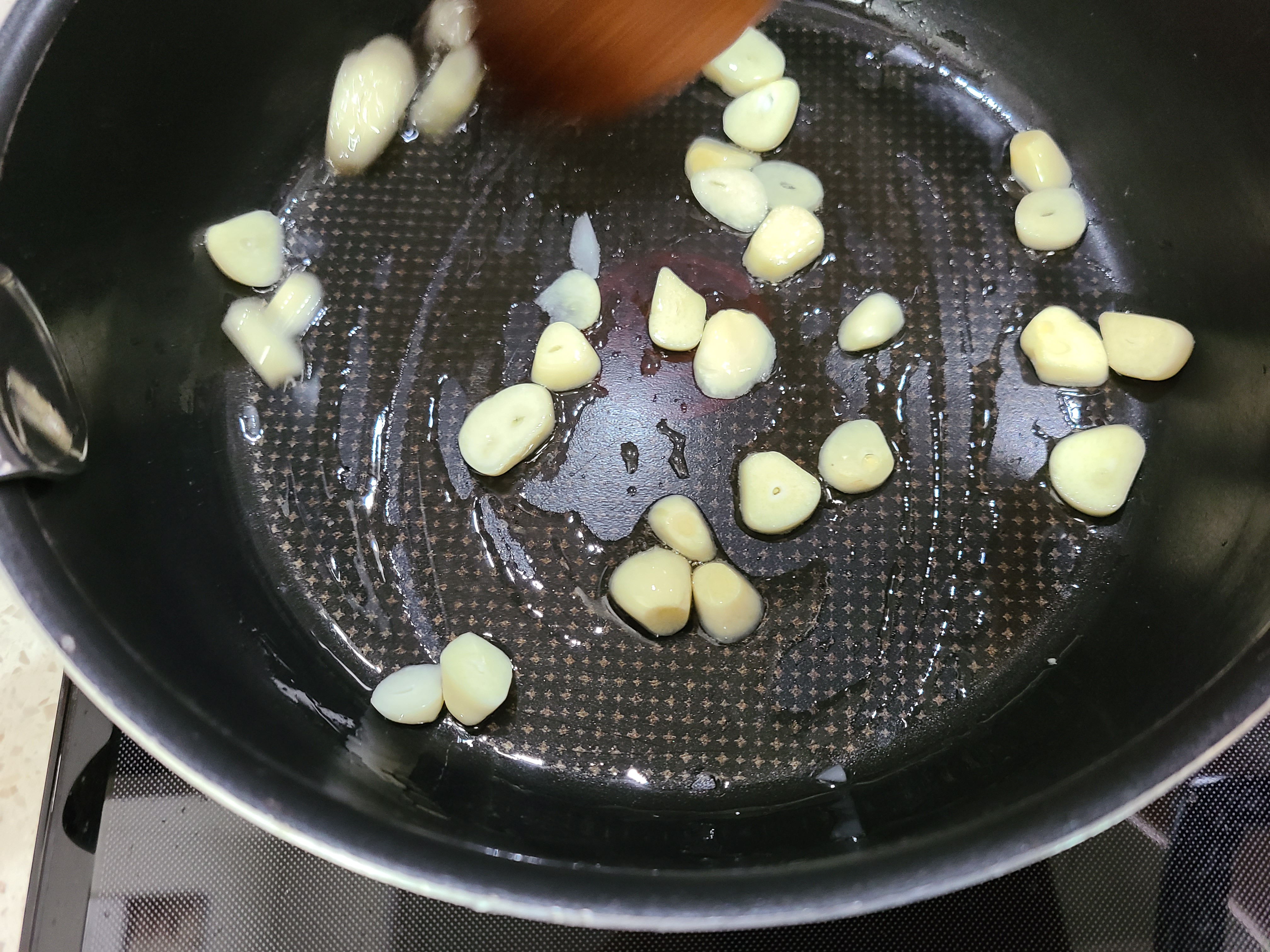 5. 팬에 식용유를 두른 후 마늘을 먼저 볶아준다.