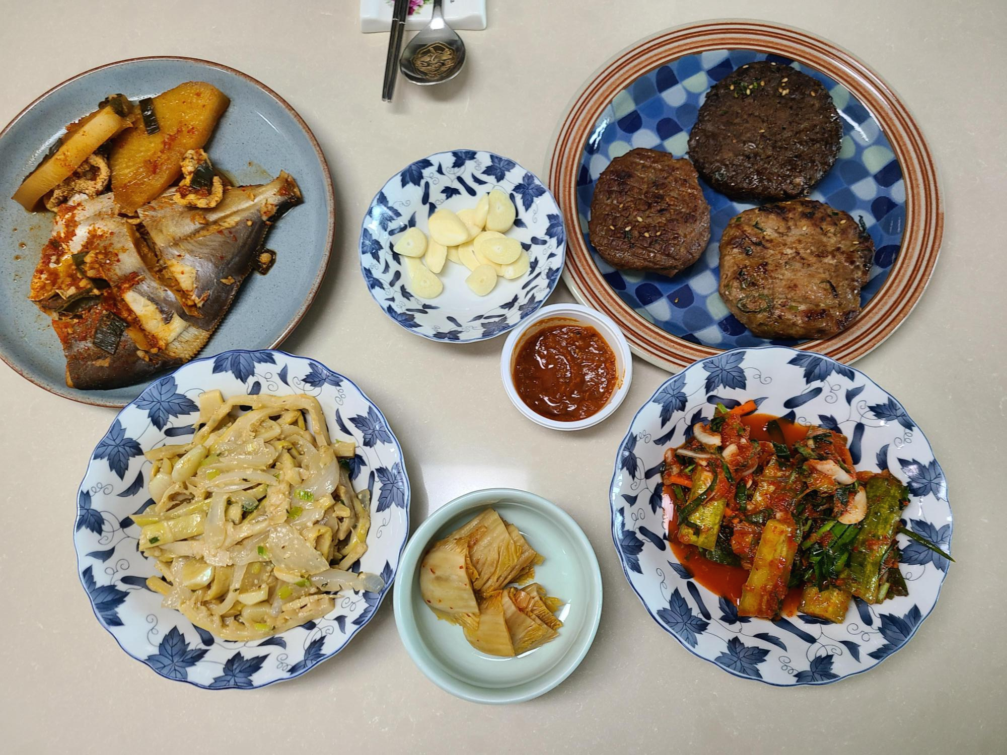 전남 영암장에서 구입한 병어로 만든 병어조림, 집으로 돌아오는 길에 담양 떡갈비 맛집에서 사 온 떡갈비, 2주 전 집에 왔을 때 만들어 놓았던 오이소박이, 그리고 방금 만든 죽순 볶음으로 상을 차렸다.