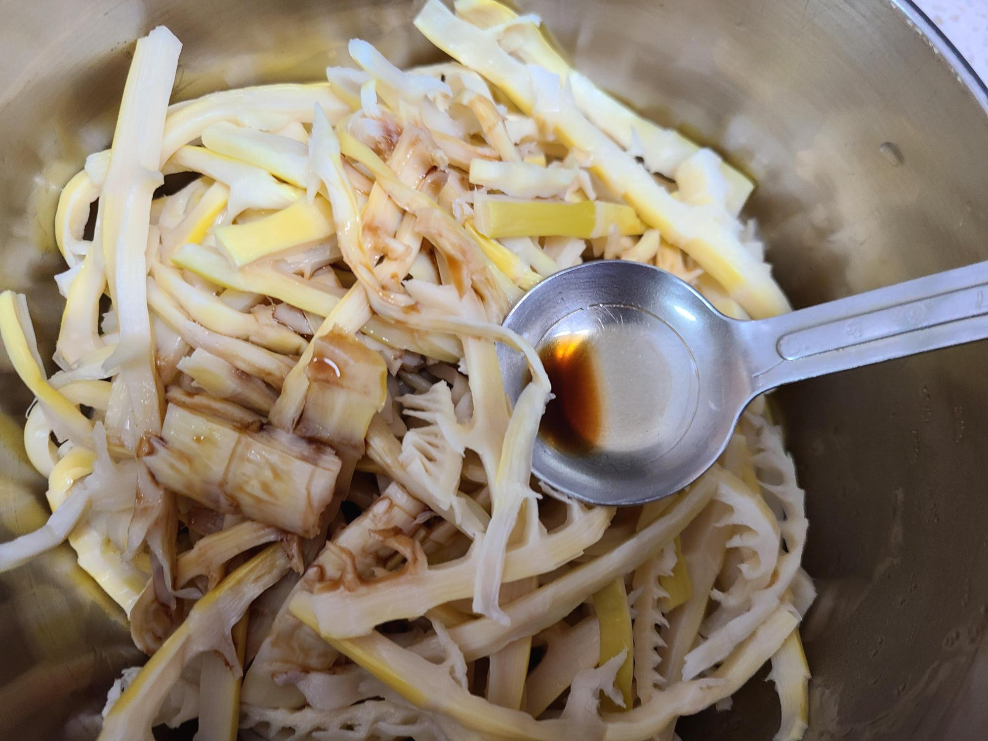 3. 데쳐낸 죽순에 국간장 1큰술과 까나리액젓 1큰술을 넣고 조물조물 버무려준다.