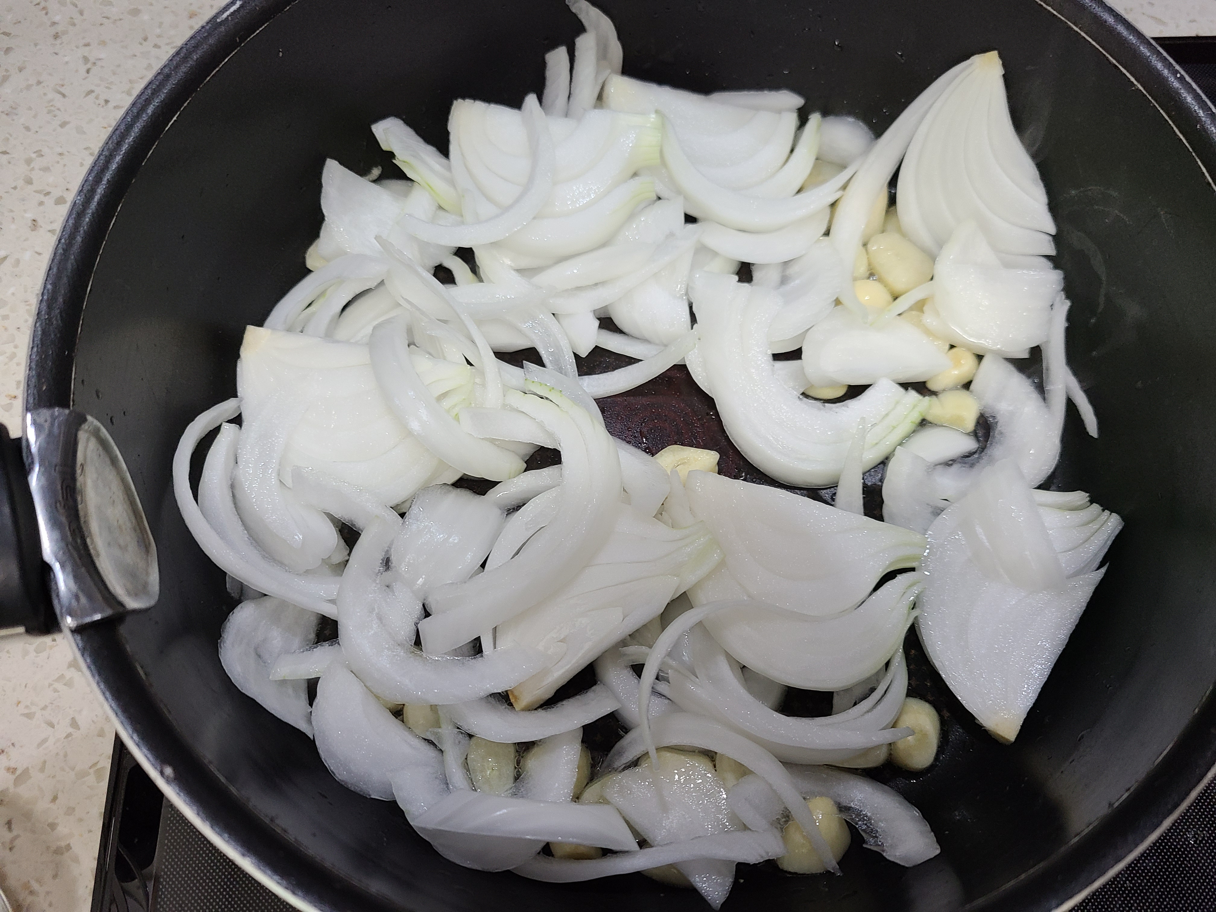 6. 마늘이 익어가면 양파를 넣고 투명해질 때까지 볶아준다.