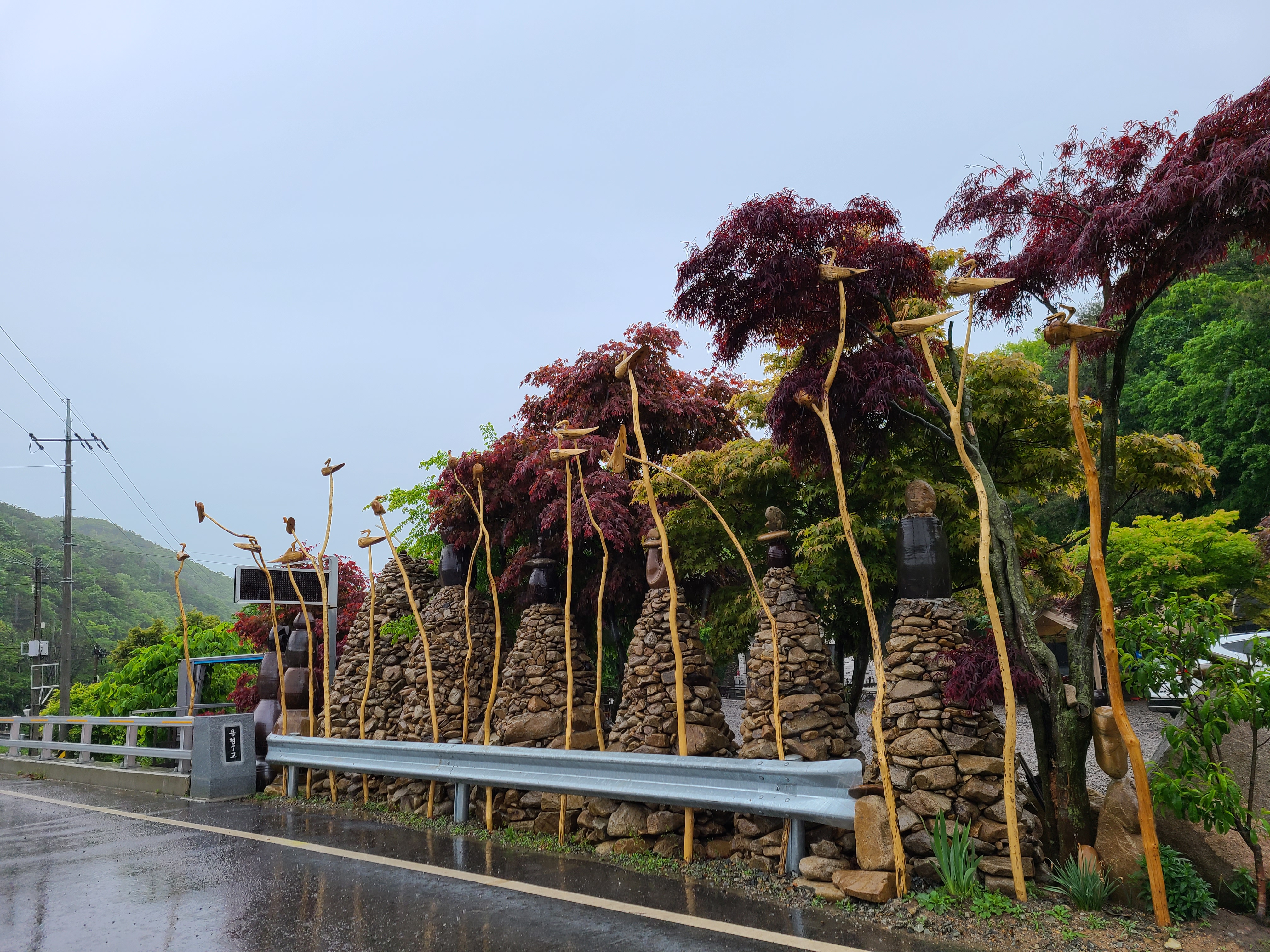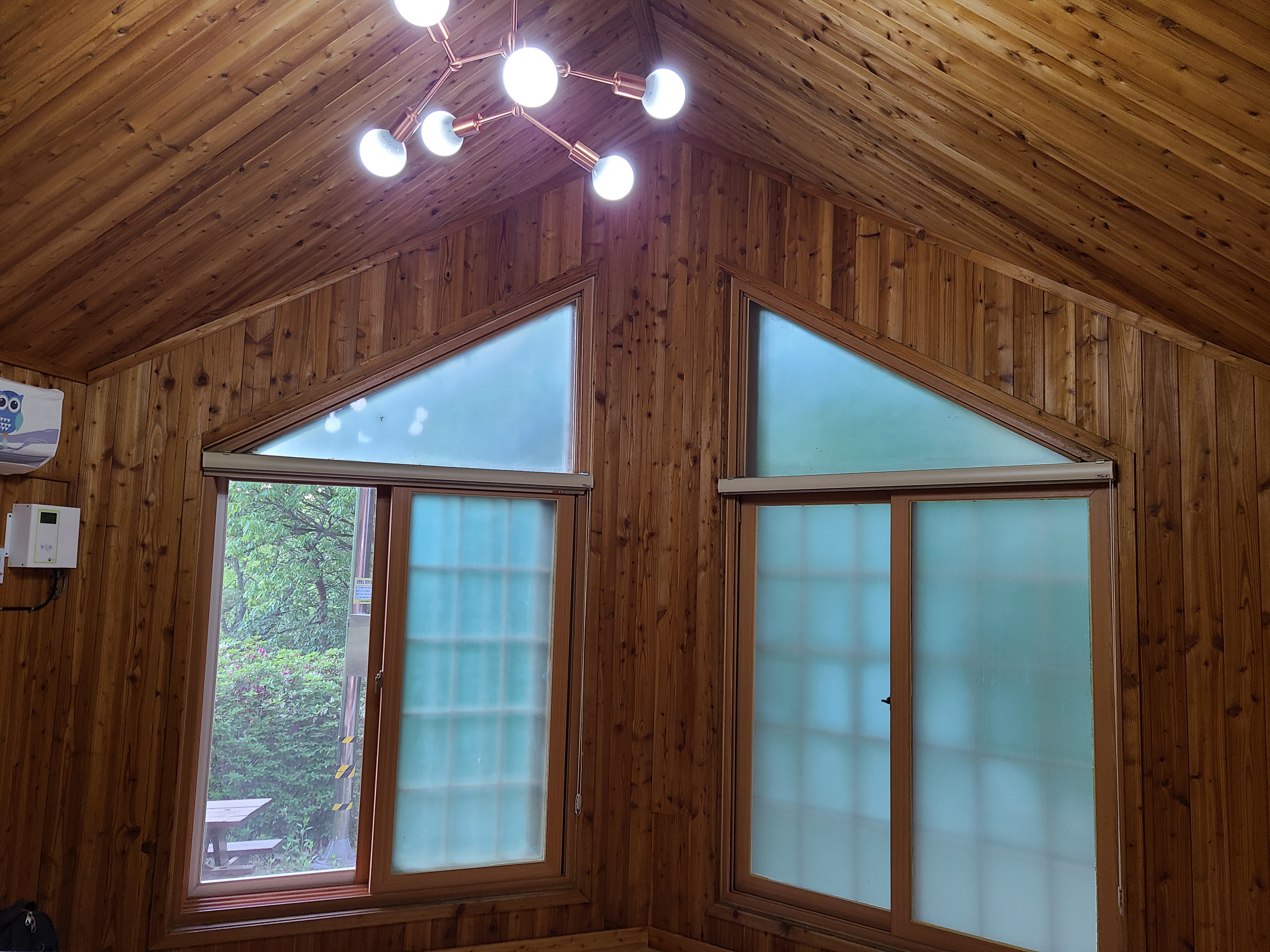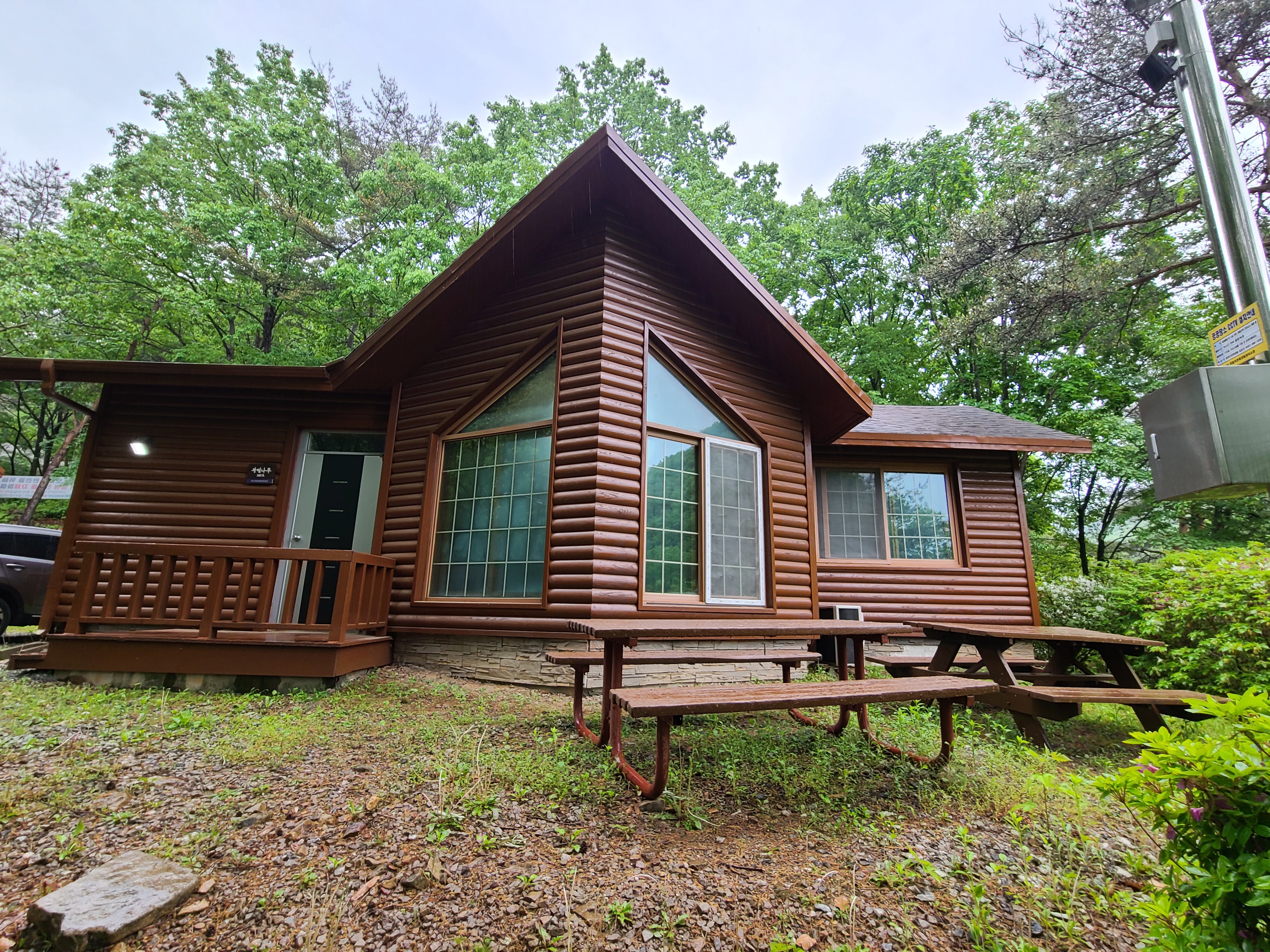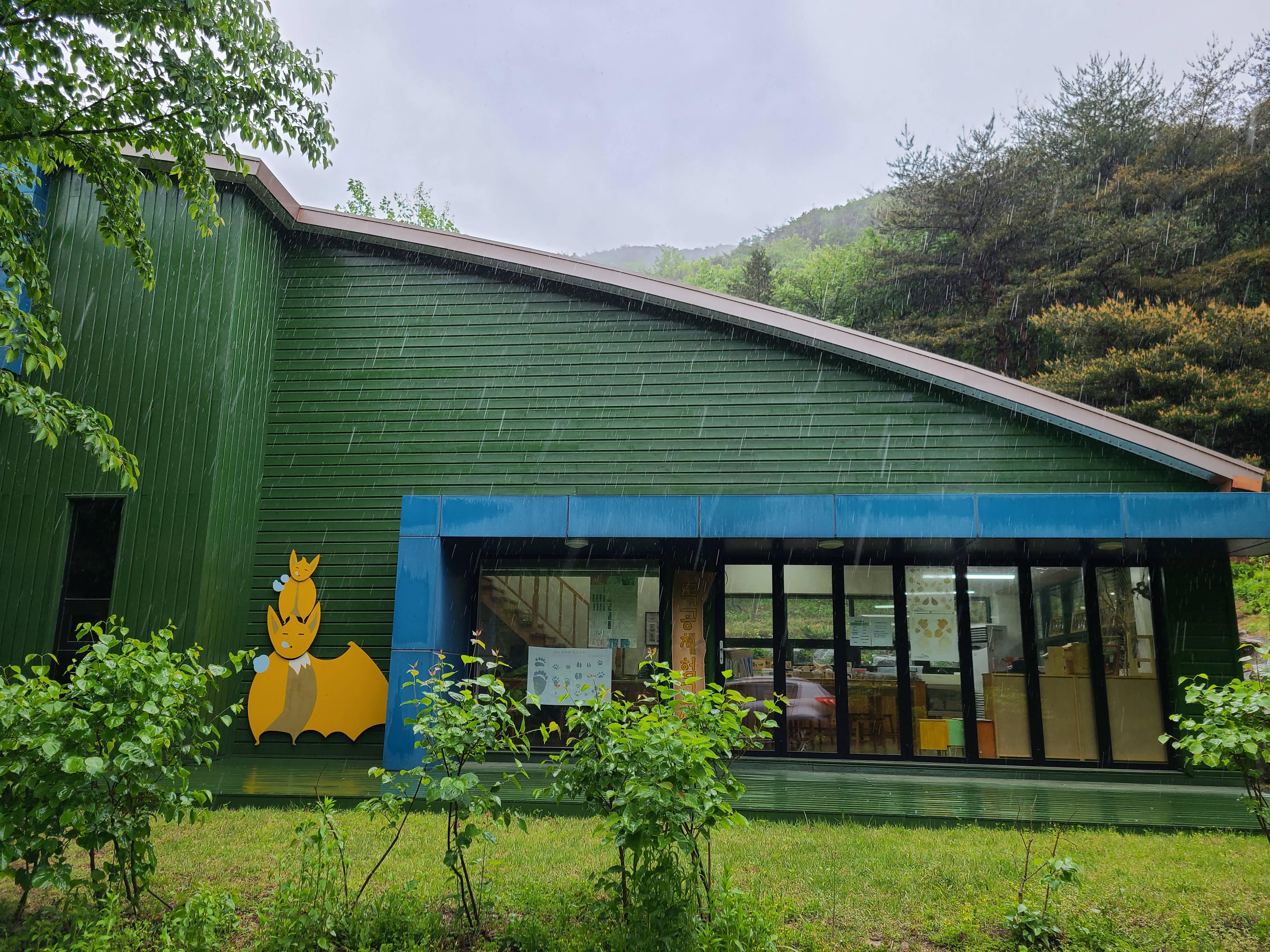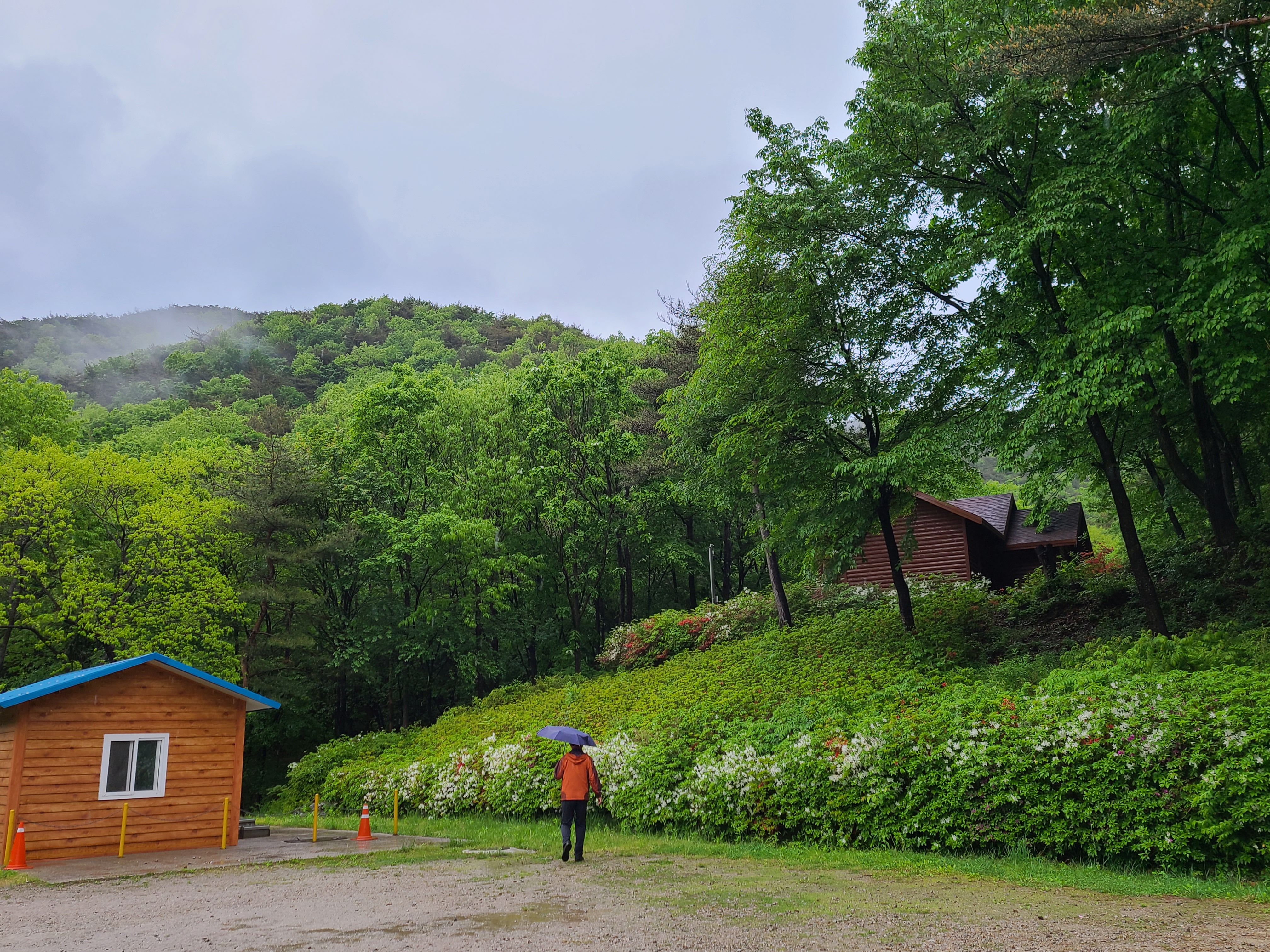 아침에 잠에서 깨었는데 빗소리가 들렸다. 창문을 열어 보니 역시 비가 내리고 있다. 갑자기 휴양림을 예약하다 보니 날씨 확인하는 것을 잊었다.