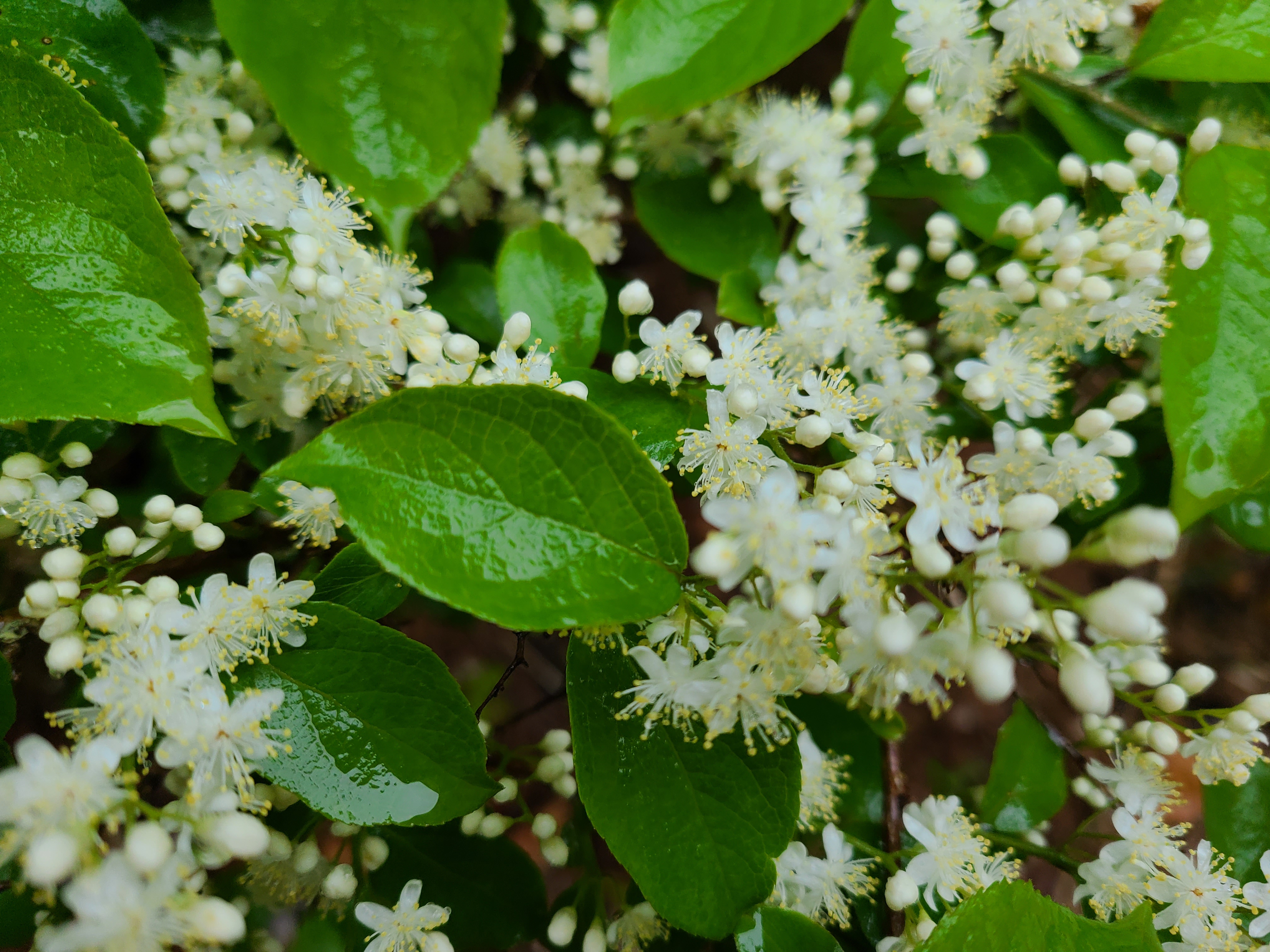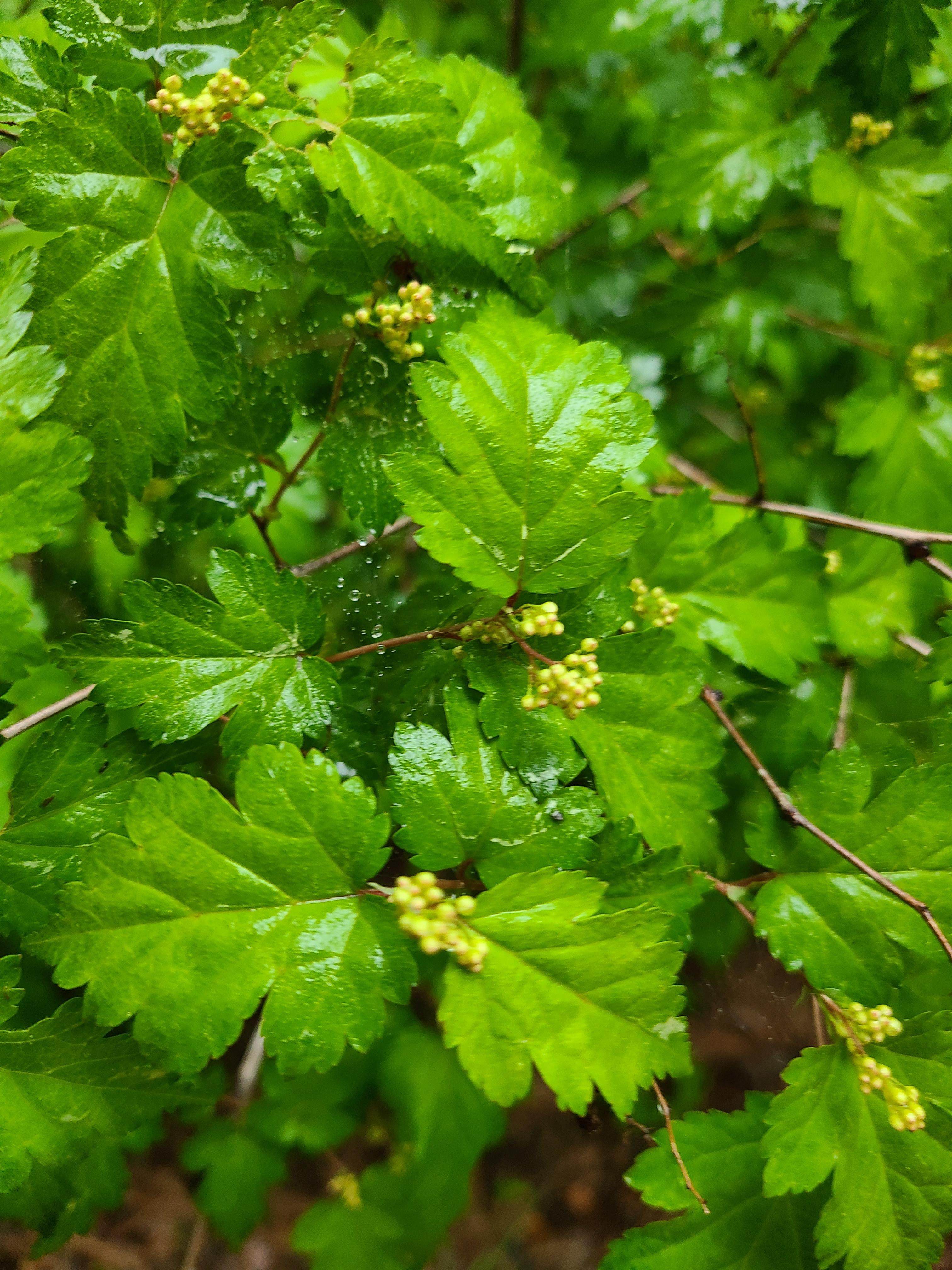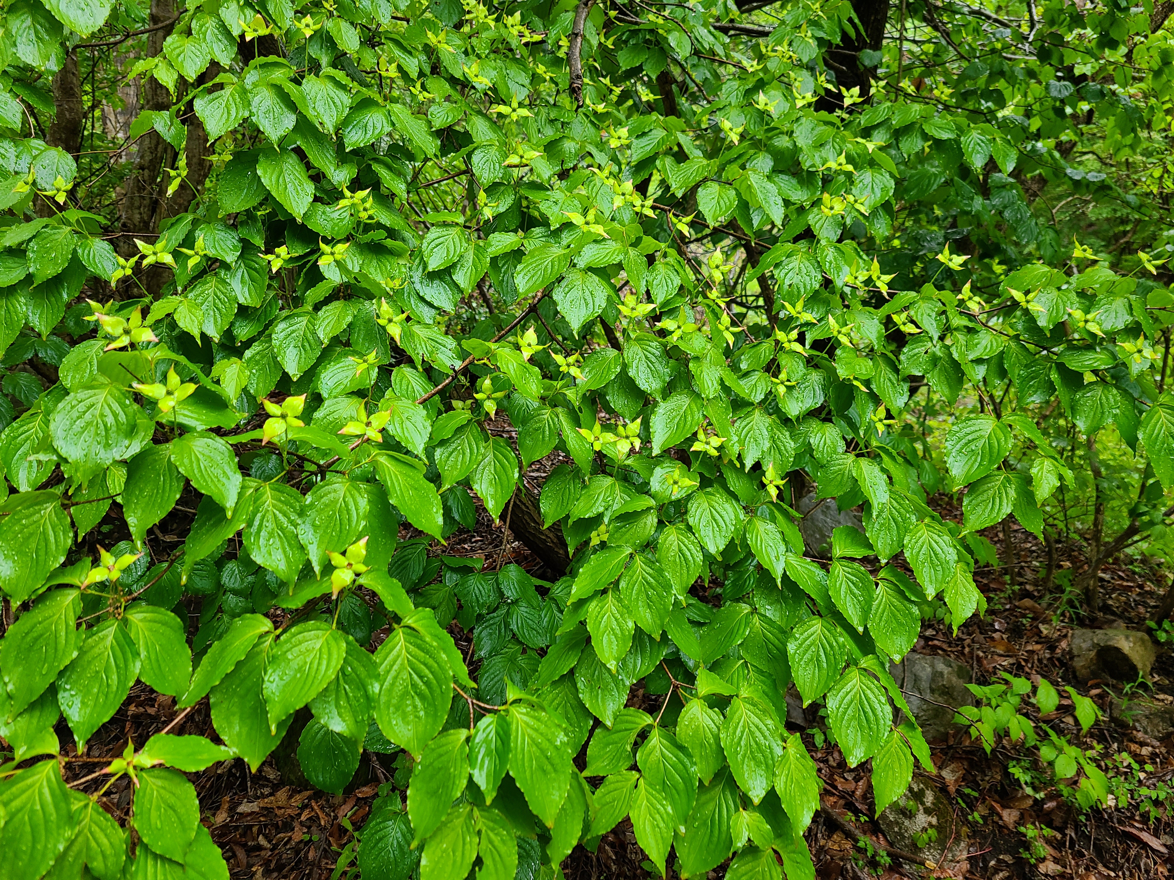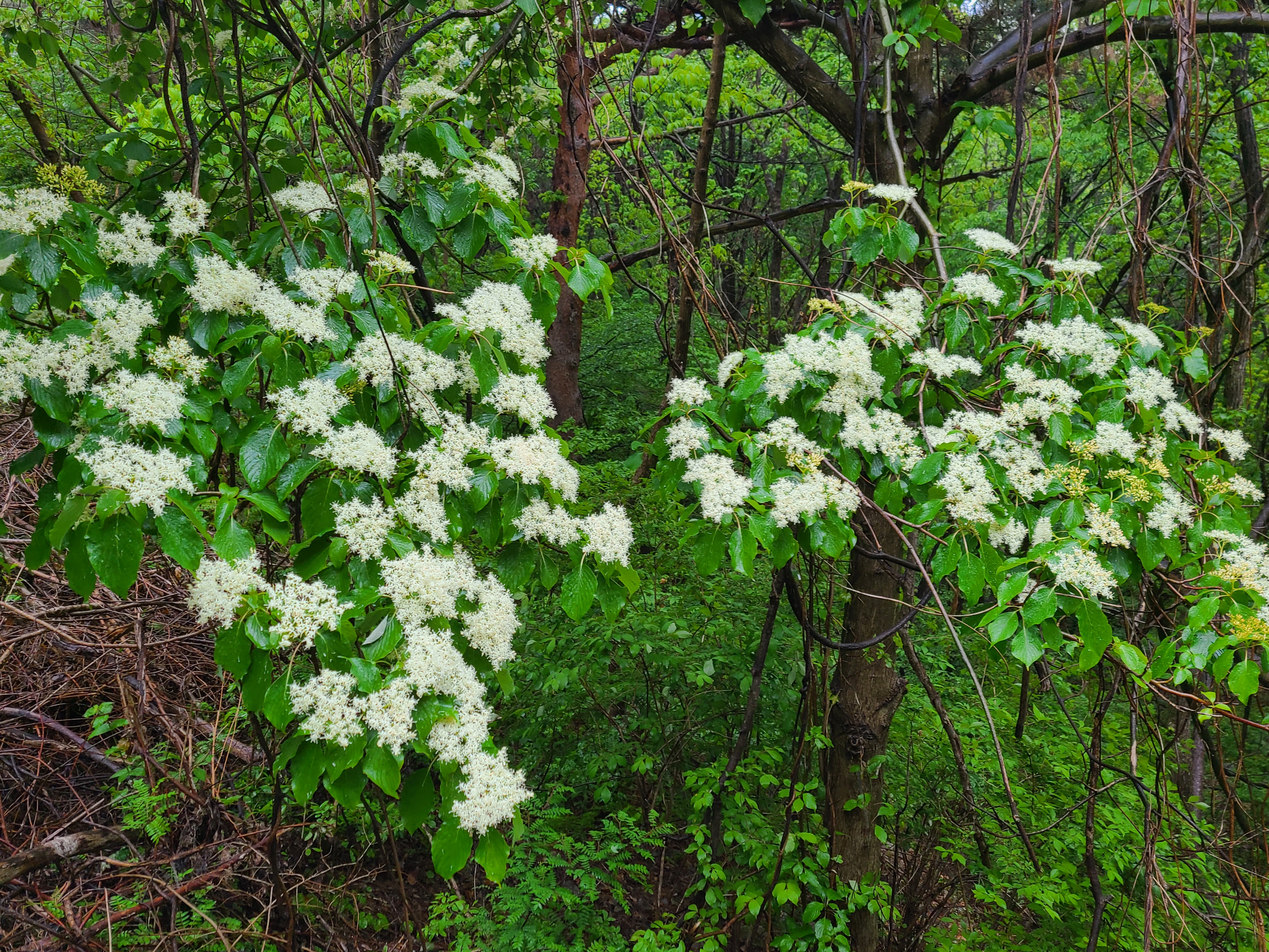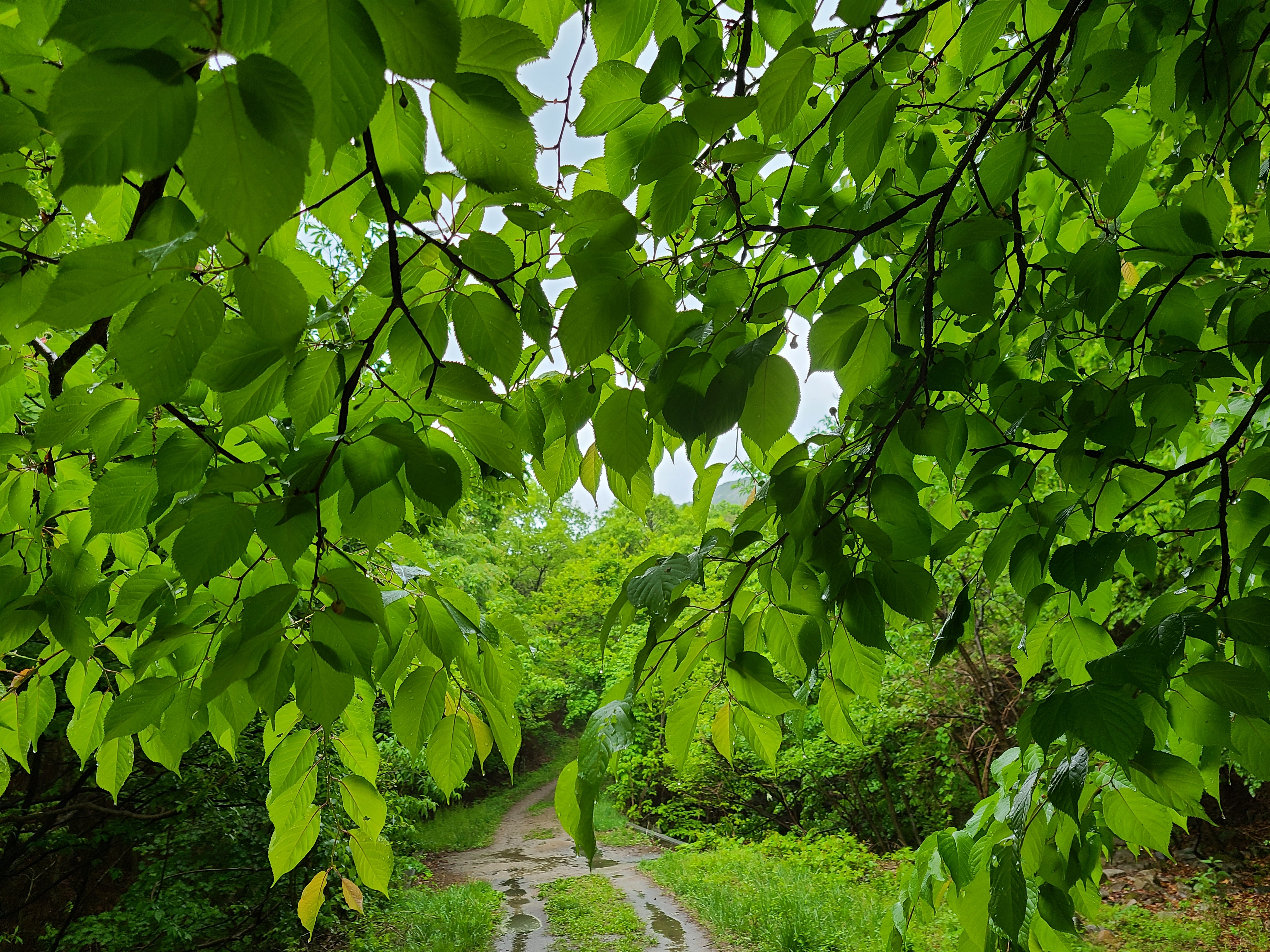 산벚꽃나무에 꽃이 지고 열매가 맺혀있다. 포장도로가 끝나 비포장도로 위에 빗물이 고여있다.