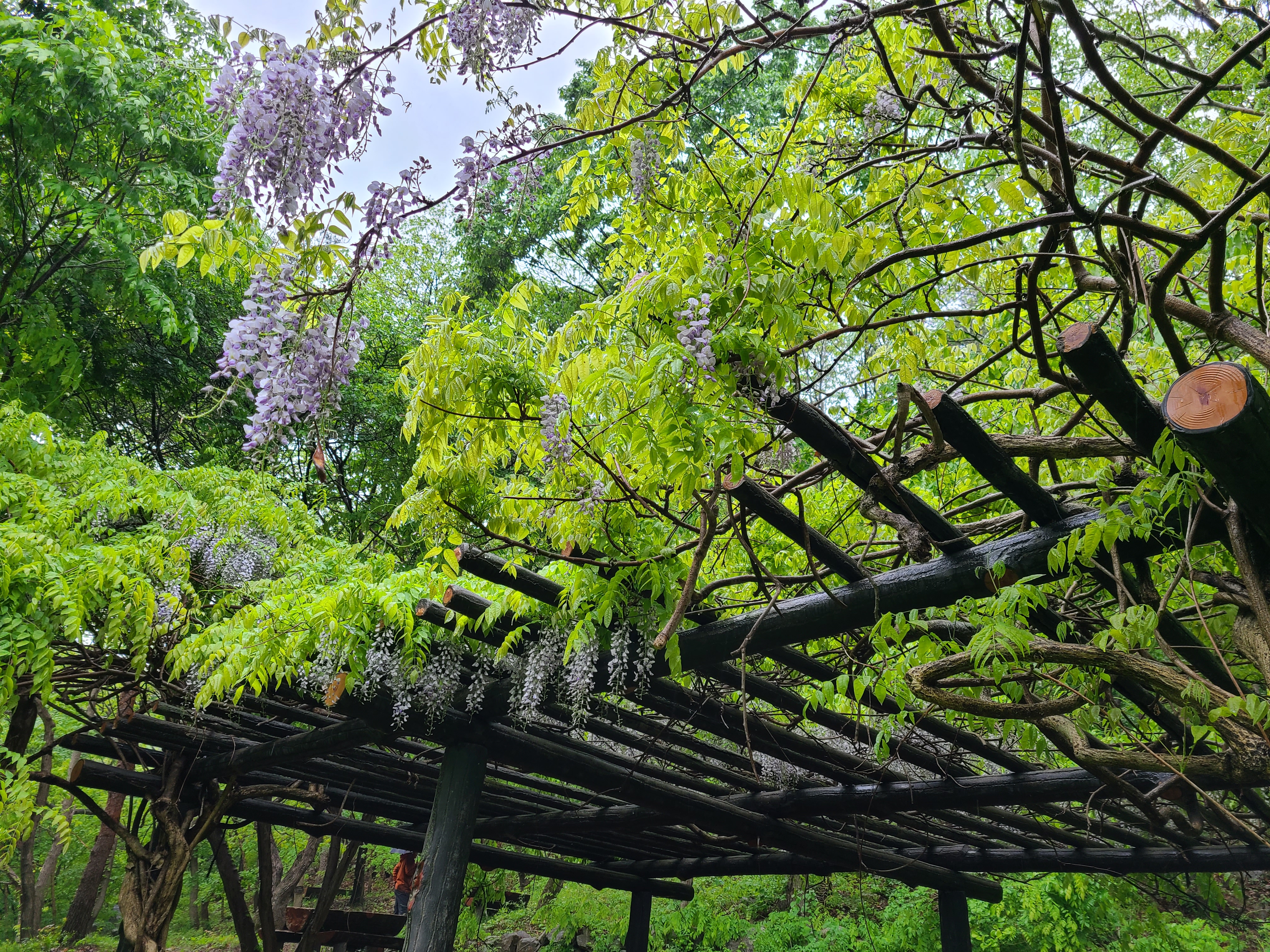 숲 탐방로가 끝나는 지점인 파고라 벤치에 등나무 꽃이 예쁘게 피여 있다. 숙소에서 출발한 지 25분이 경과되었다.