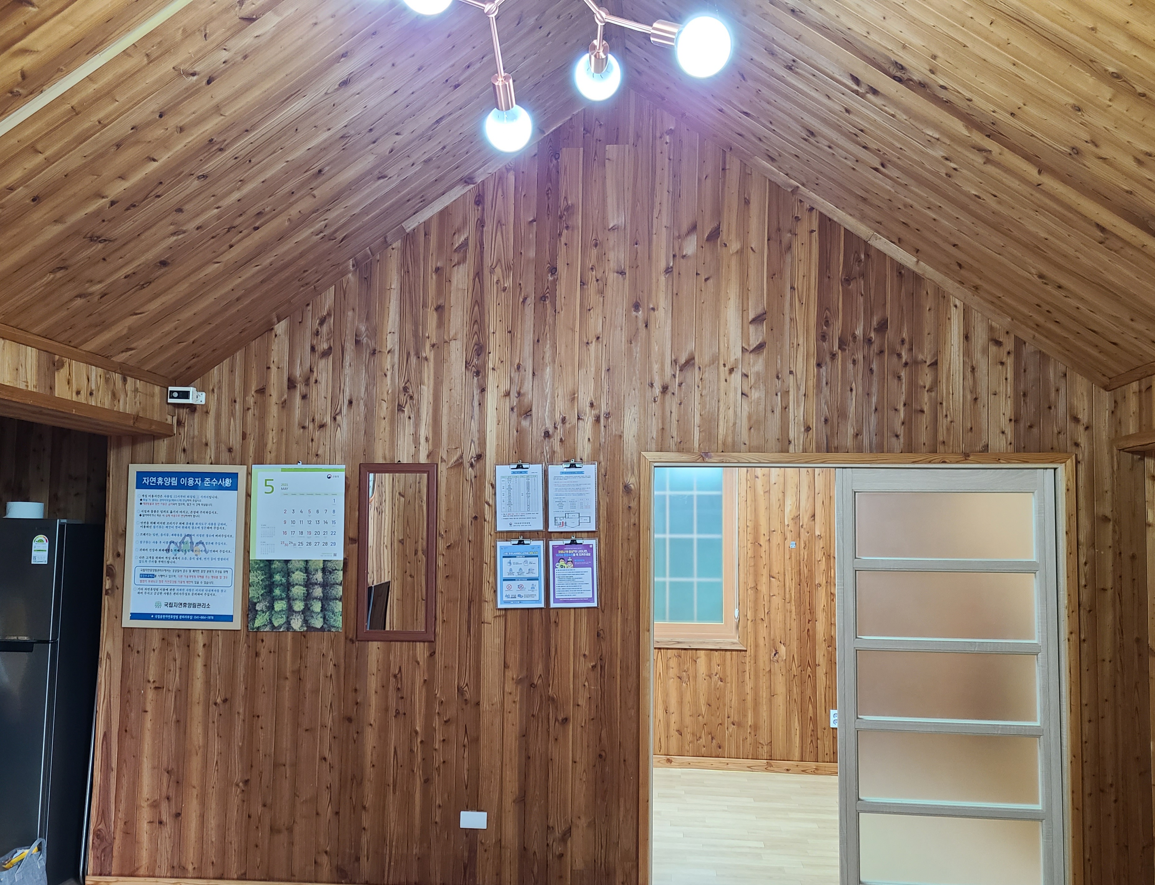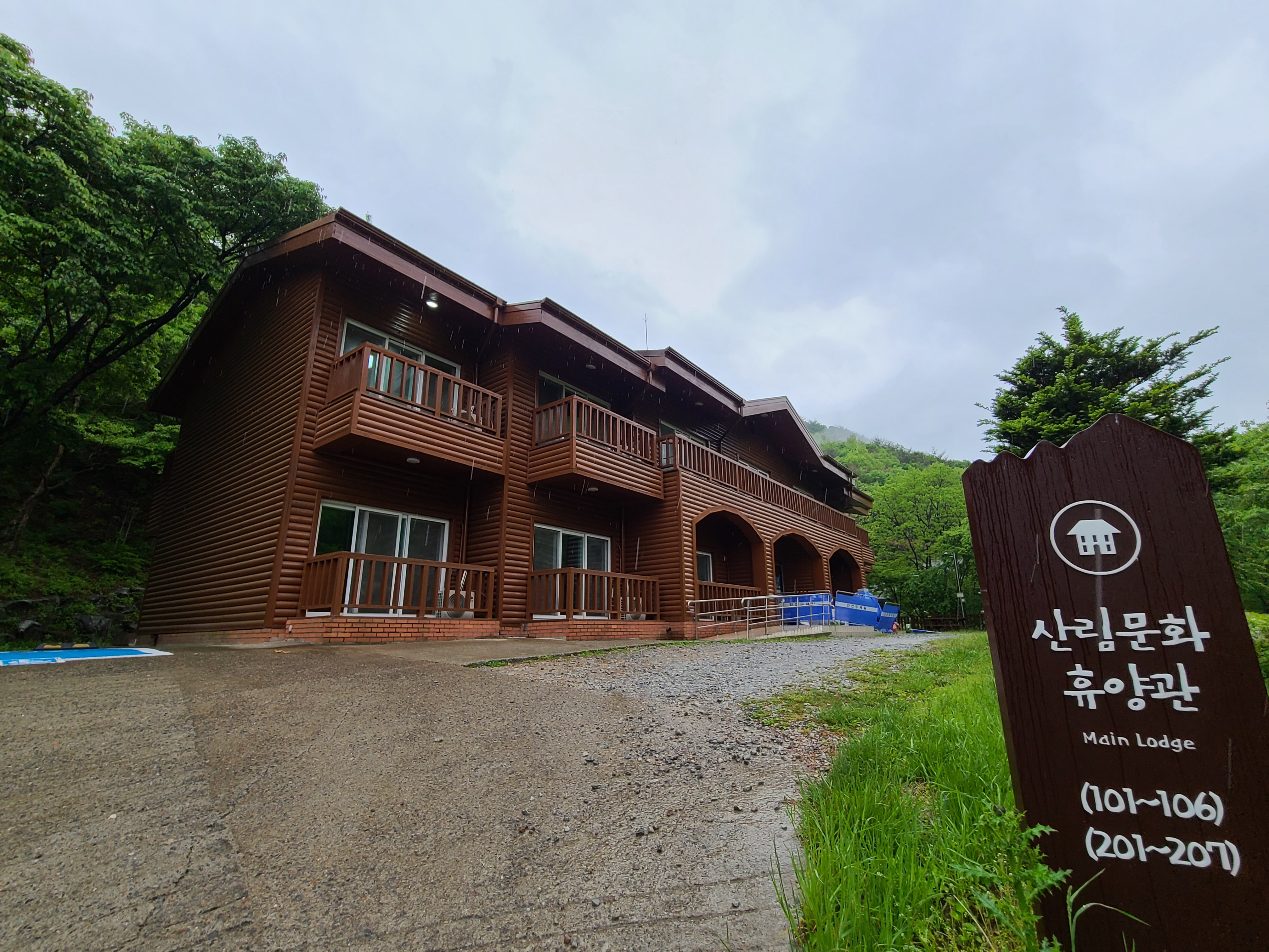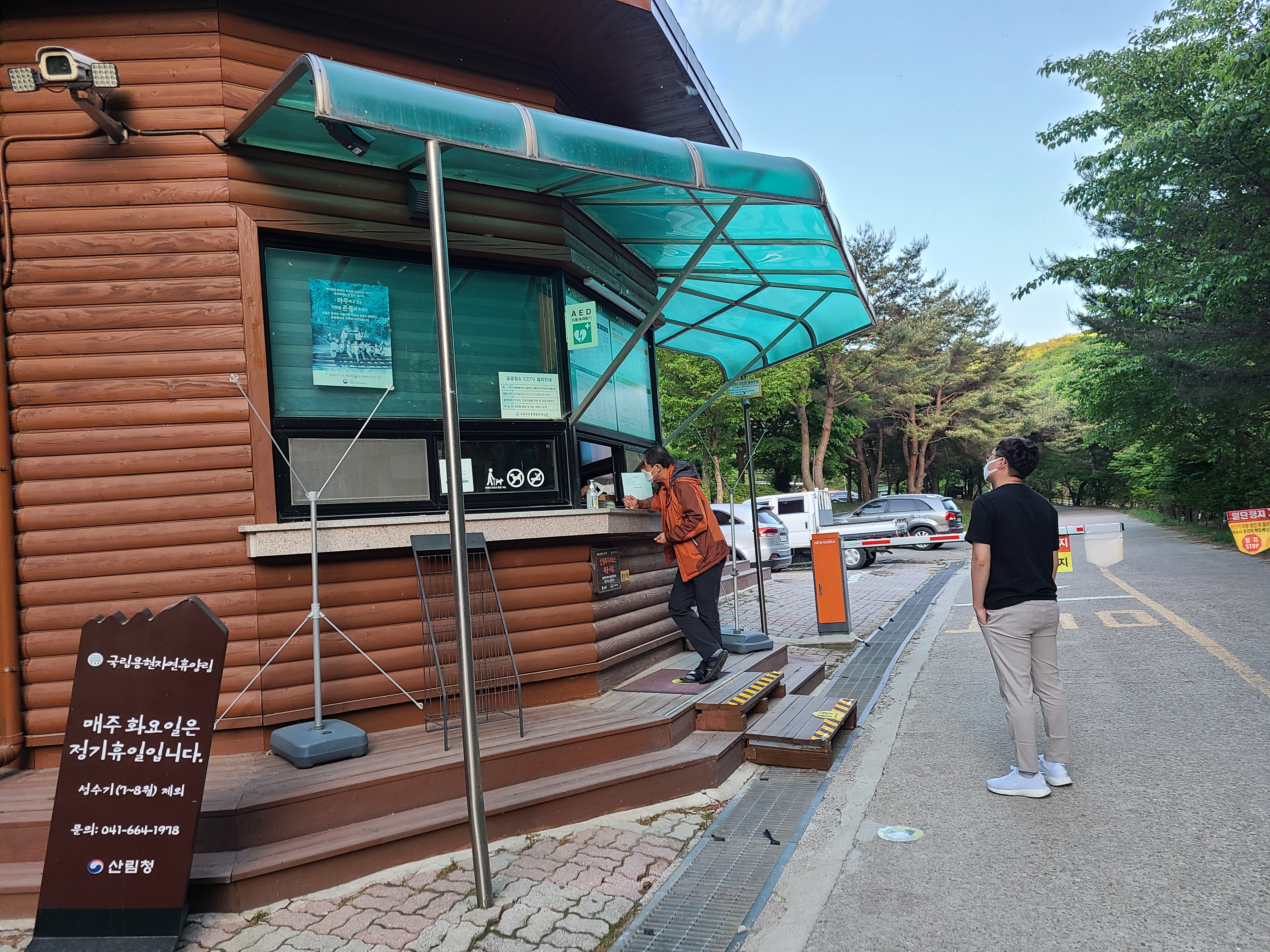 용현 자연휴양림 관리사무소에 도착하자 신분증을 확인한 후 체온을 재고 지정번호로 전화를 걸어서 출입 확인을 한다. 그런데 우리가 예약한 방이 공사를 하게 되었다며, 휴양관 4인실 대신 숲속의 집 10인실에서 지내라고 했다.