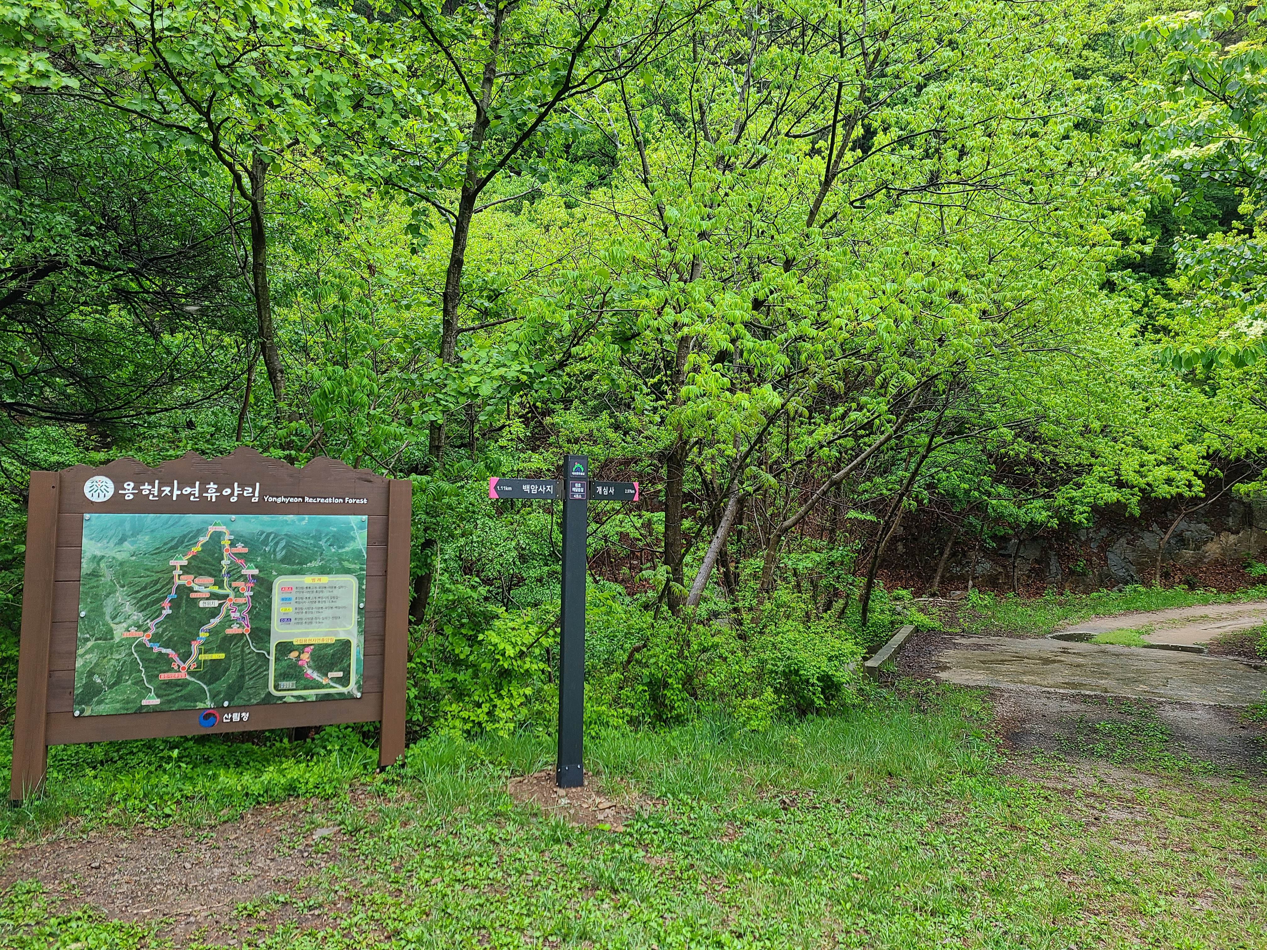 용현 자연휴양림 등산안내도를 보려고 가까이 가보니 이정표에 왼쪽 방향으로 백암 사지 가 1.11km, 오른쪽 개심사가 2.97km 남아있다. 숙소에서 여기까지 꽃구경도 하고 계곡물도 보면서 왔더니 거의 1시간이 걸렸다. 출발할 때는 이곳까지만 올 계획이었는데 오른쪽 개심사 방향으로 전망대 표시가 있는 것을 보니 마음이 바뀌었다. 오른쪽 개심사 방향으로 다시 걷기 시작했다.