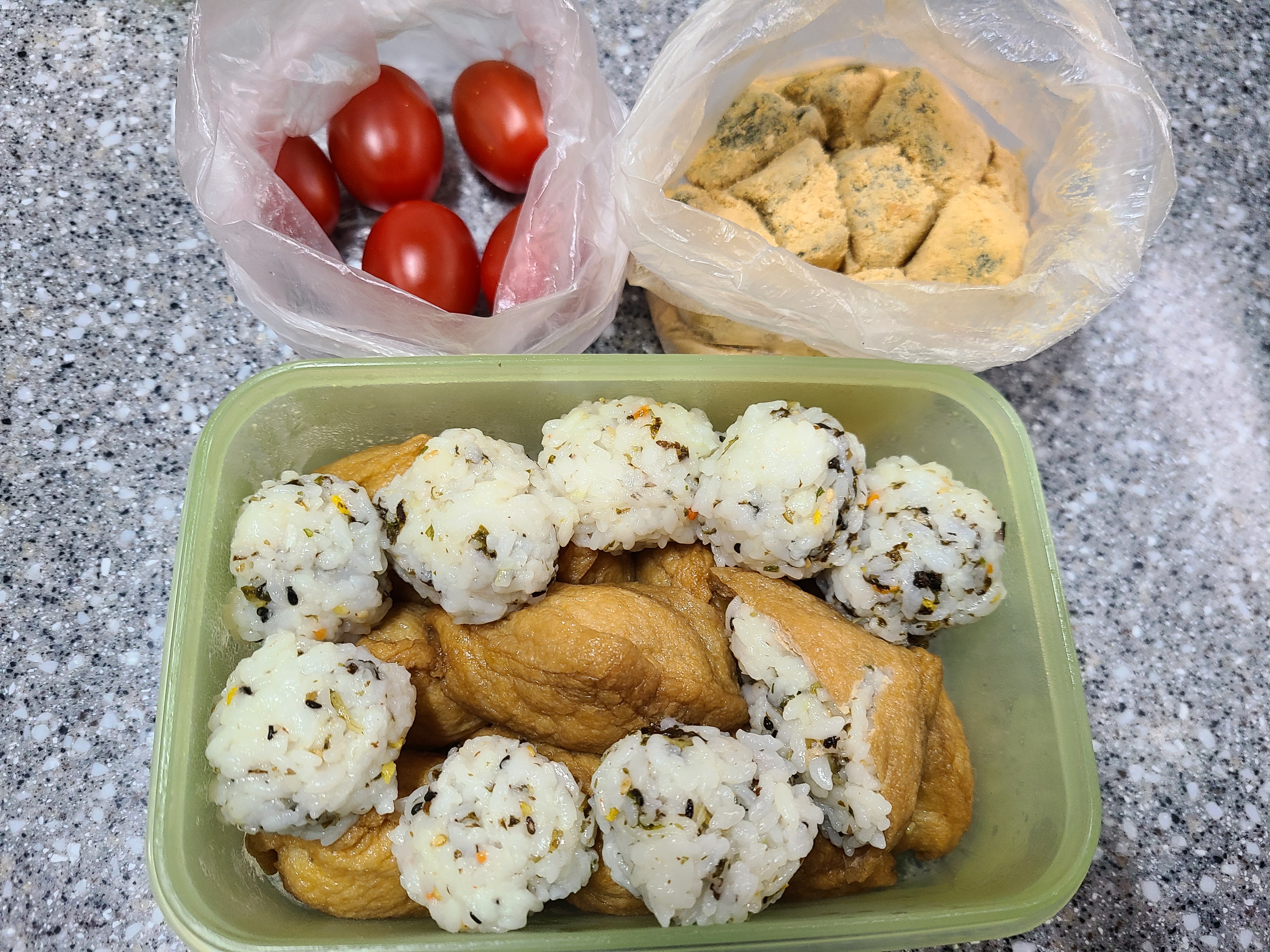 국립 자연휴양림을 다닐 때면 산행을 하거나 이동시에 먹기 위해 아침에 유부초밥과 주먹밥을 만들어서 다닌다. 비가 와서 도시락이 필요는 없지만 재료를 준비해 왔으니 아침에 밥을 해서 유부초밥과 주먹밥을 만들었다.