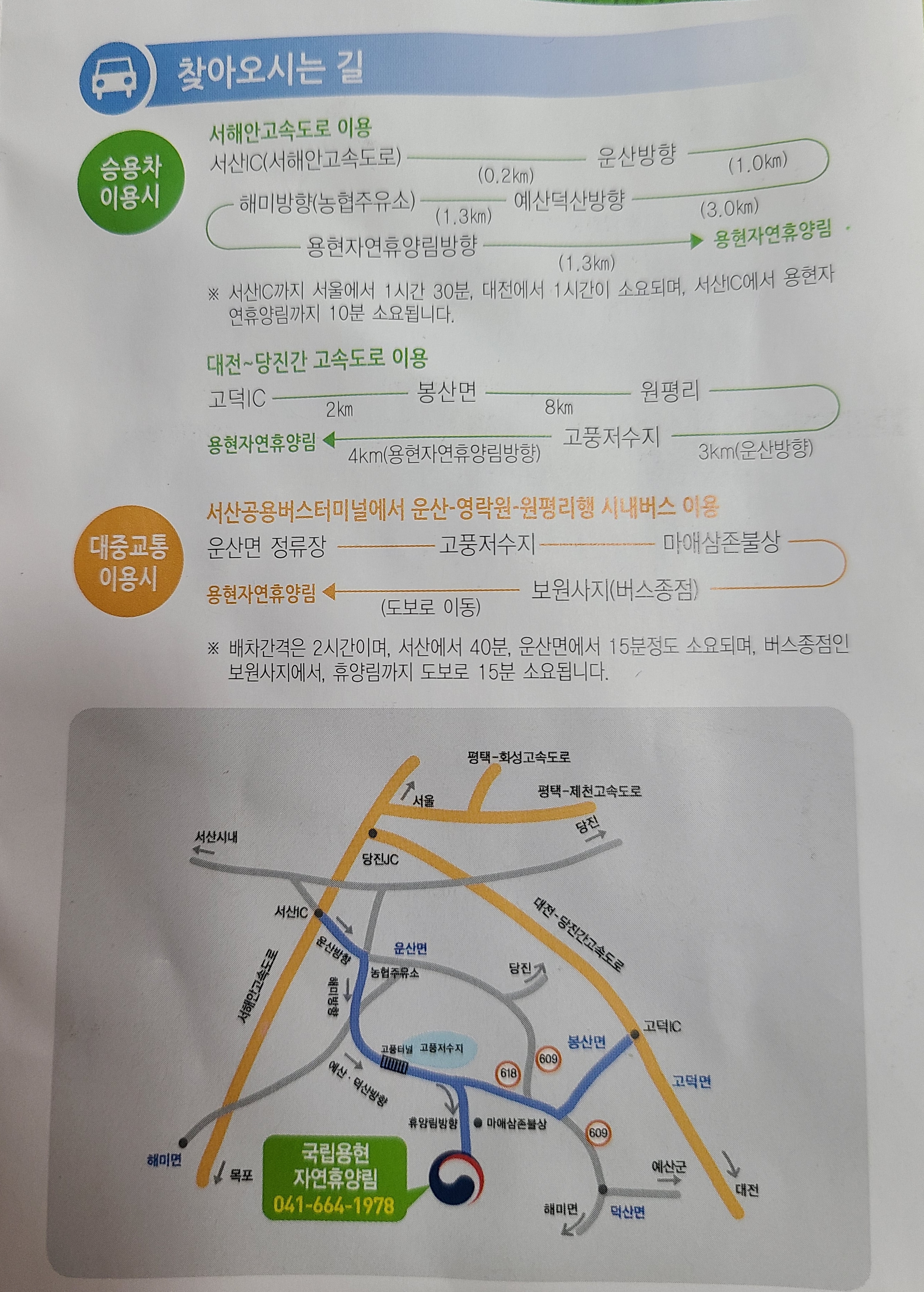 용현 자연휴양림은 수도권에서 서해안고속도로 이용 시 약 1시간 30분, 대전에서는 2시간, 평택에서는 고속도로는 1시간, 일반도로는 1시간 20분 정도 소요된다. 수덕사에서 용현 자연휴양림까지 35분 정도 걸려서 도착했다.