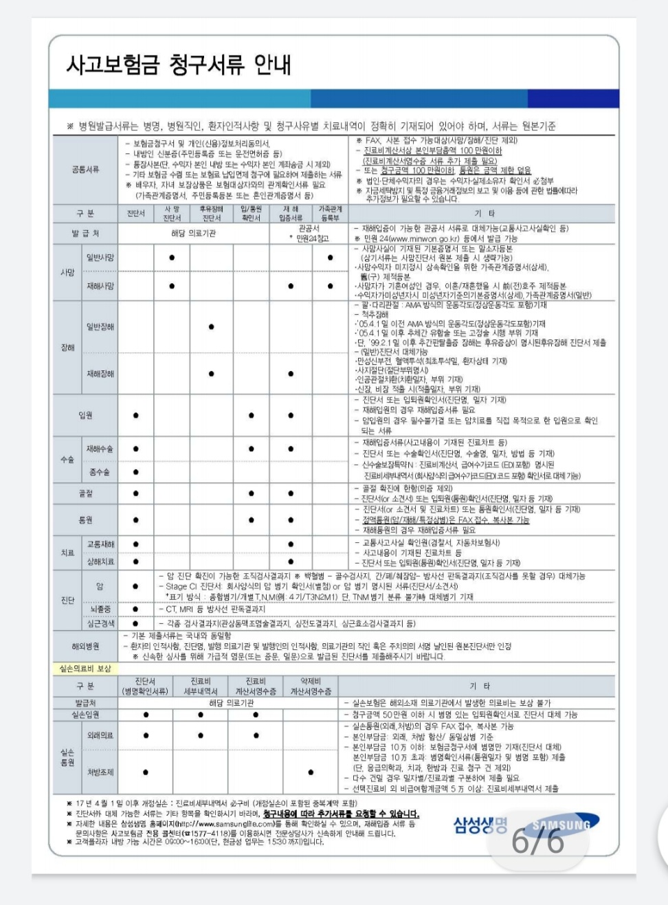 - 질병이나 재해로 병원에 갔을 때 원무과에 병원비를 결재하기 전에 해당 보험사 고객센터에 전화를 해서 필요한 서류를 확인한 후 발급받아야 한다.(삼성생명 사고보험금 전용 콜센터 1577- 4118)
