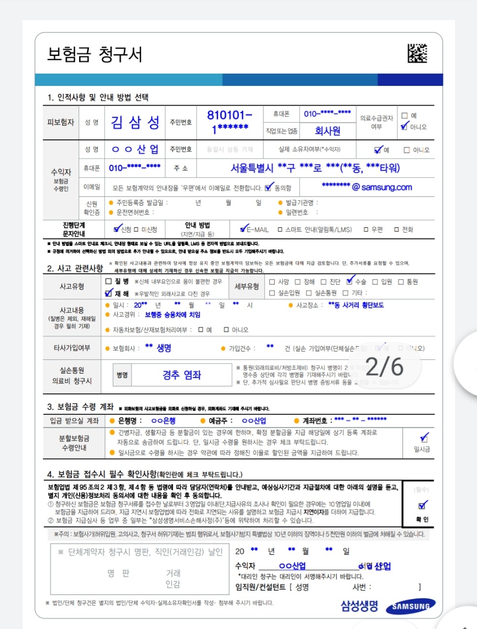 - 우편으로 청구하기-금액 상관없음, 반드시 등기우편으로 접수해야 함(보험금 청구서 양식 필요) 우편접수처 주소: 부산우체국 사서함 189호 삼성생명 사고보험금 접수담당(우편번호 없음)