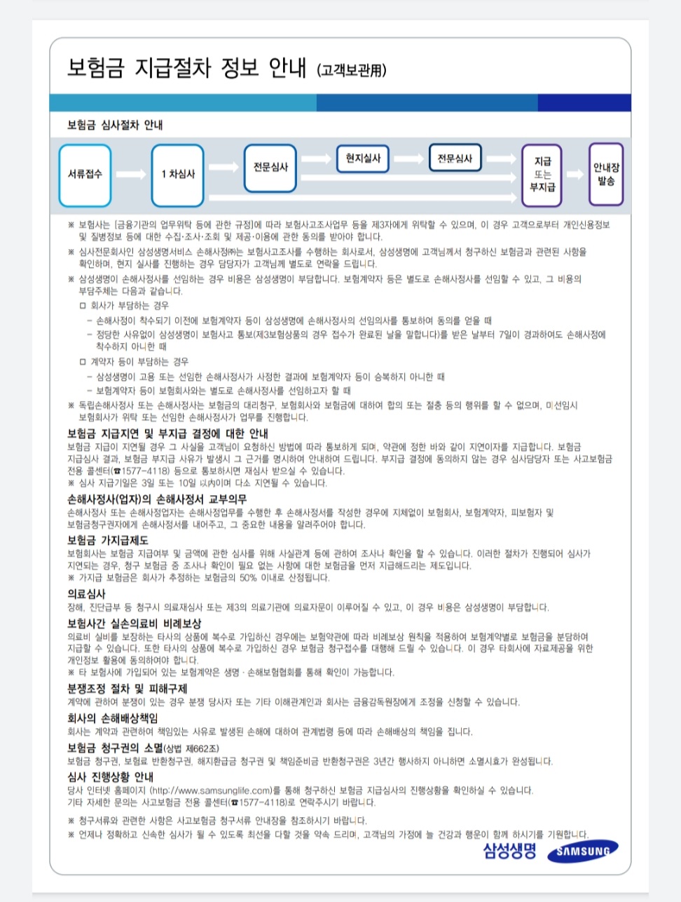 자세한 내용은 삼성생명 홈페이지(http://www.samsunglife.com)를 통해 확인하시거나 문의사항은 사고보험금 전용 콜센터) 1577- 4118를 이용하면 된다.