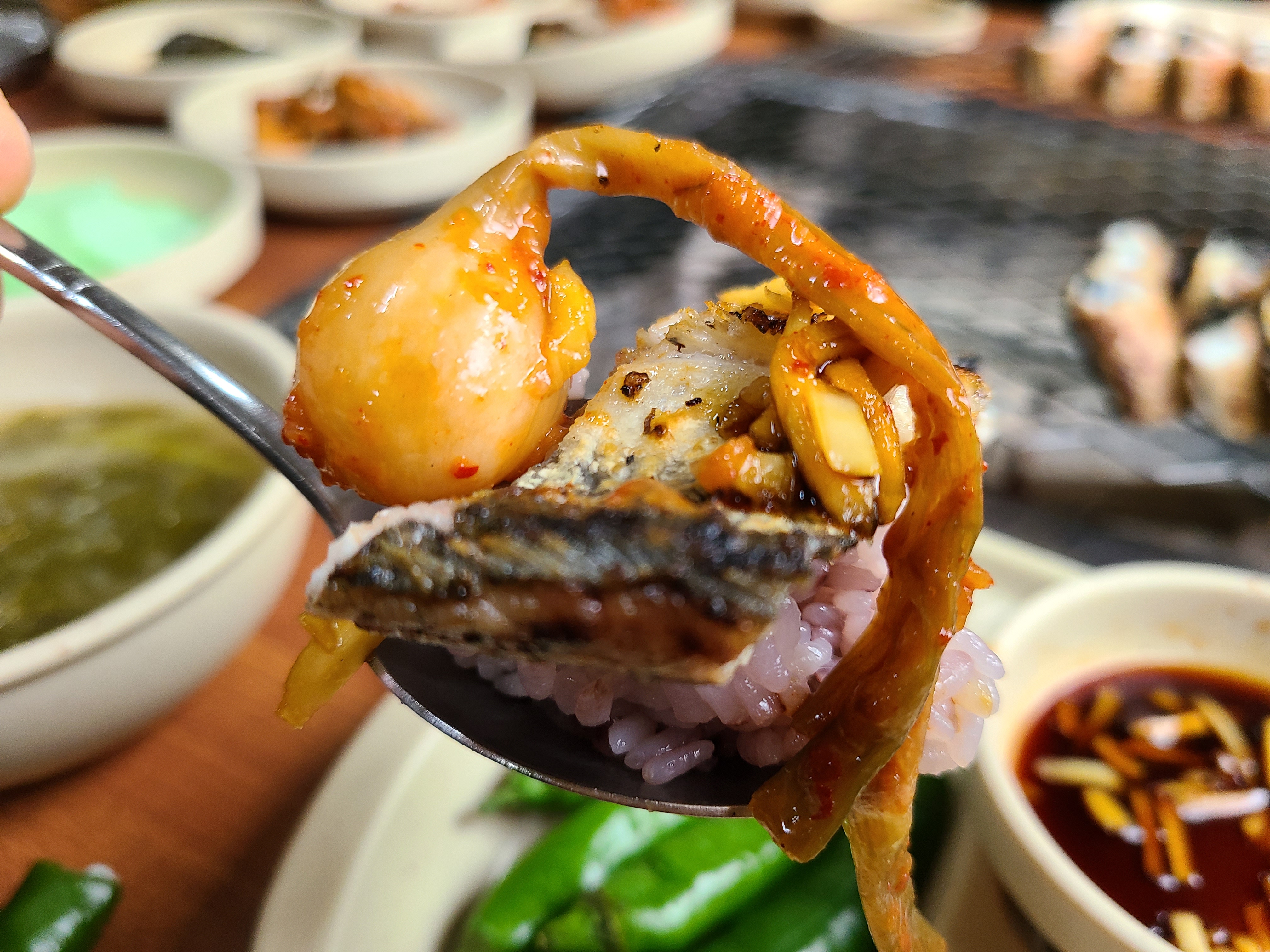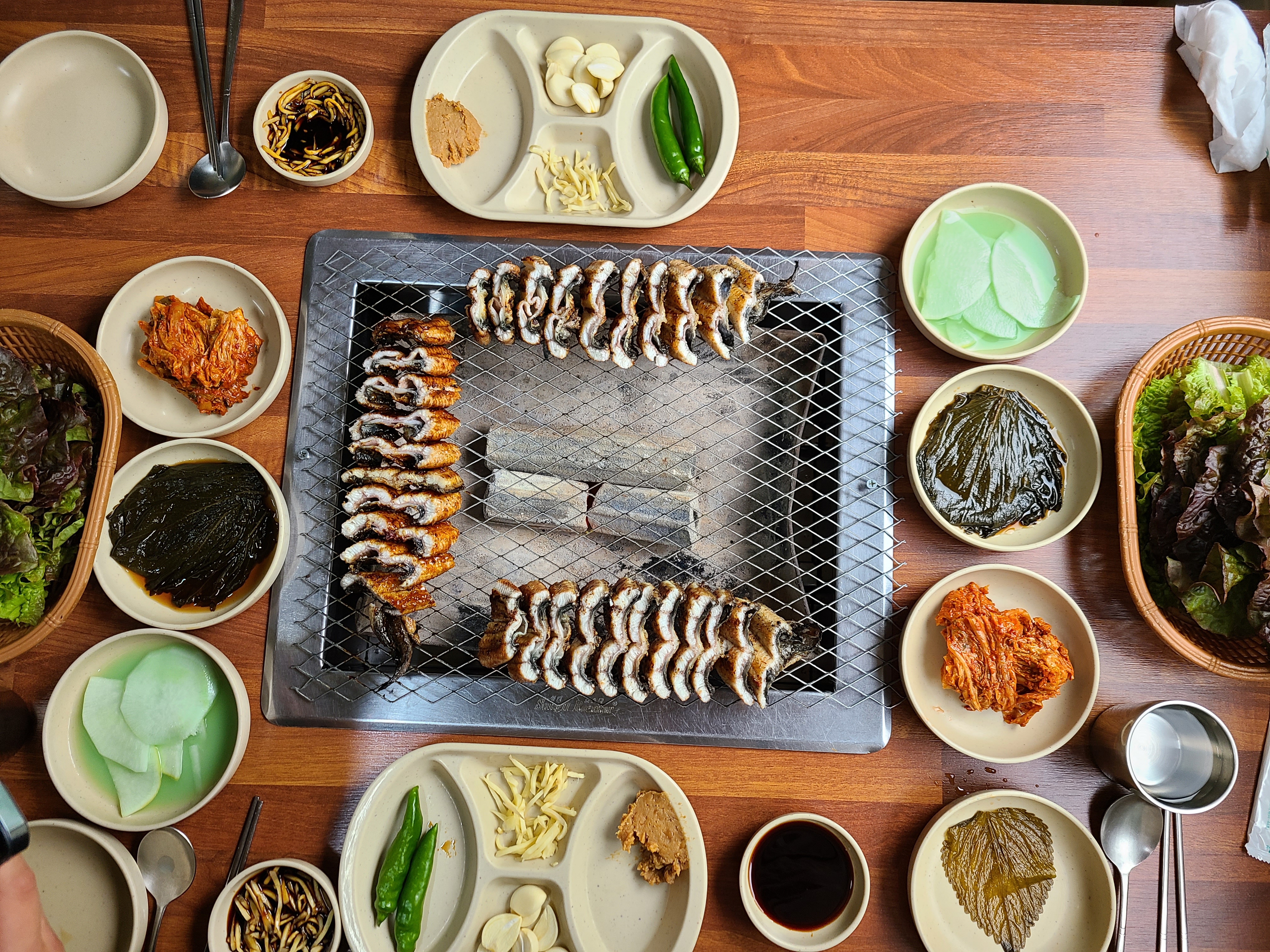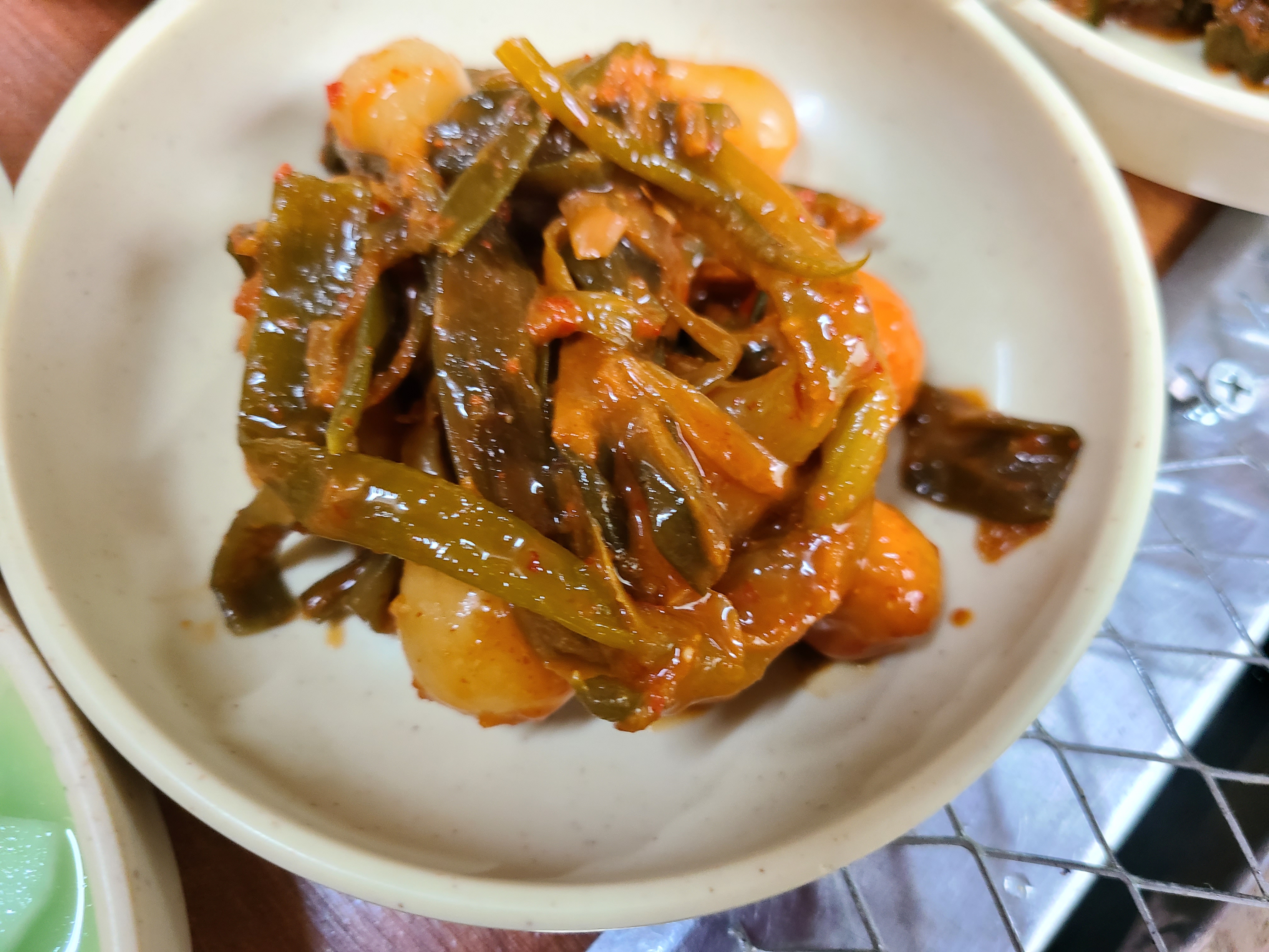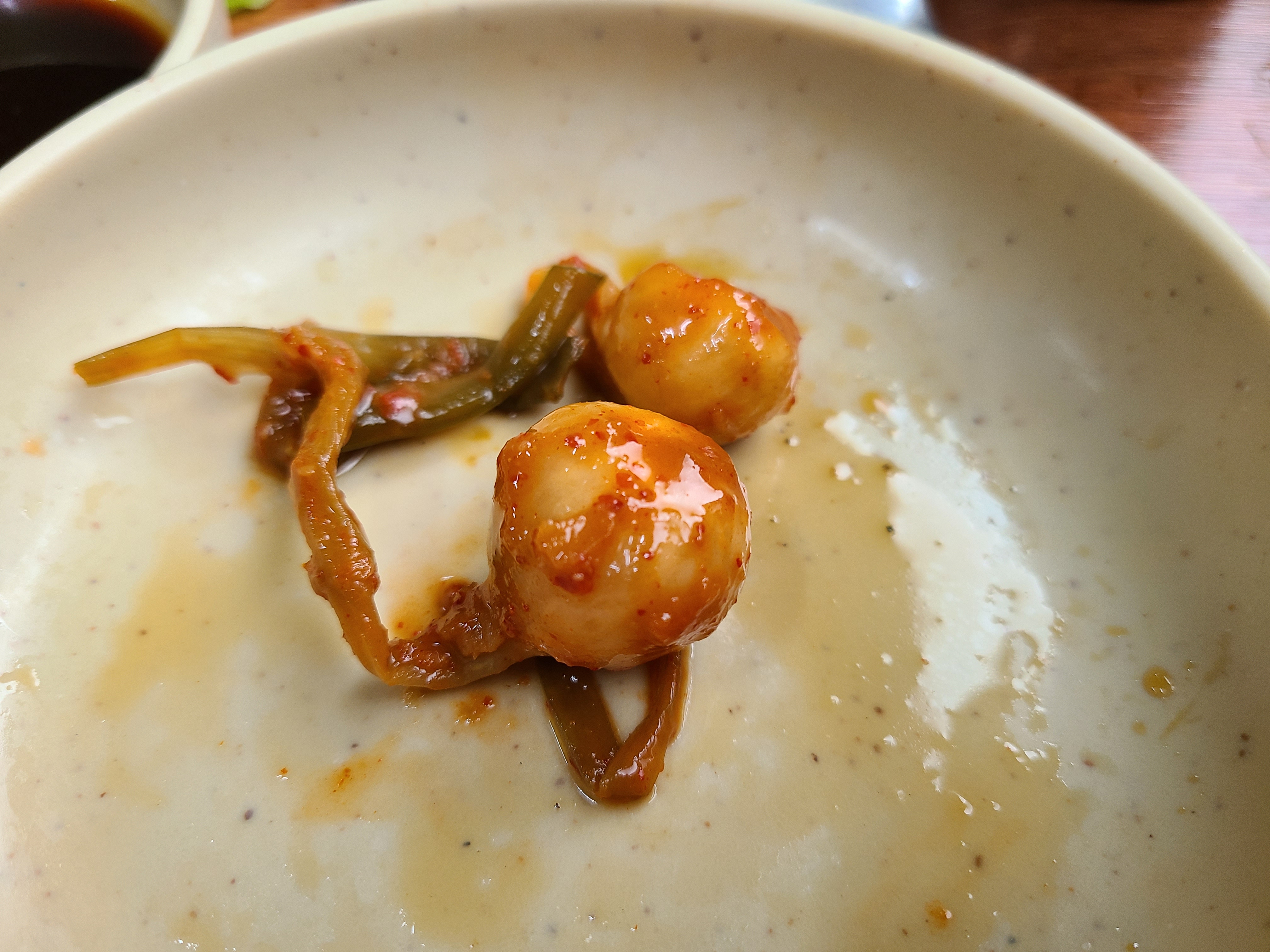 공깃밥과 함께 나온 된장국도 구수하니 맛있지만, 이 양파김치가 정말 별미였다. 전라도에 오기 시작하면서 양파김치가 있다는 것을 알게 되었다. 보통 크기가 작은 양파로 김치를 담은 것은 많이 보았는데 이렇게 작은 양파로 줄기채 파김치처럼 담아놓은 것은 처음이었다. 지금껏 먹어보았던 양파김치 중 최고의 맛이었다. 매년 양파가 어릴 때 일 년 치를 담가서 사용한다고 하니 혹시 이곳 월출산 민물장어에 오시는 분들은 양파김치를 꼭 챙겨 드시길 추천한다.