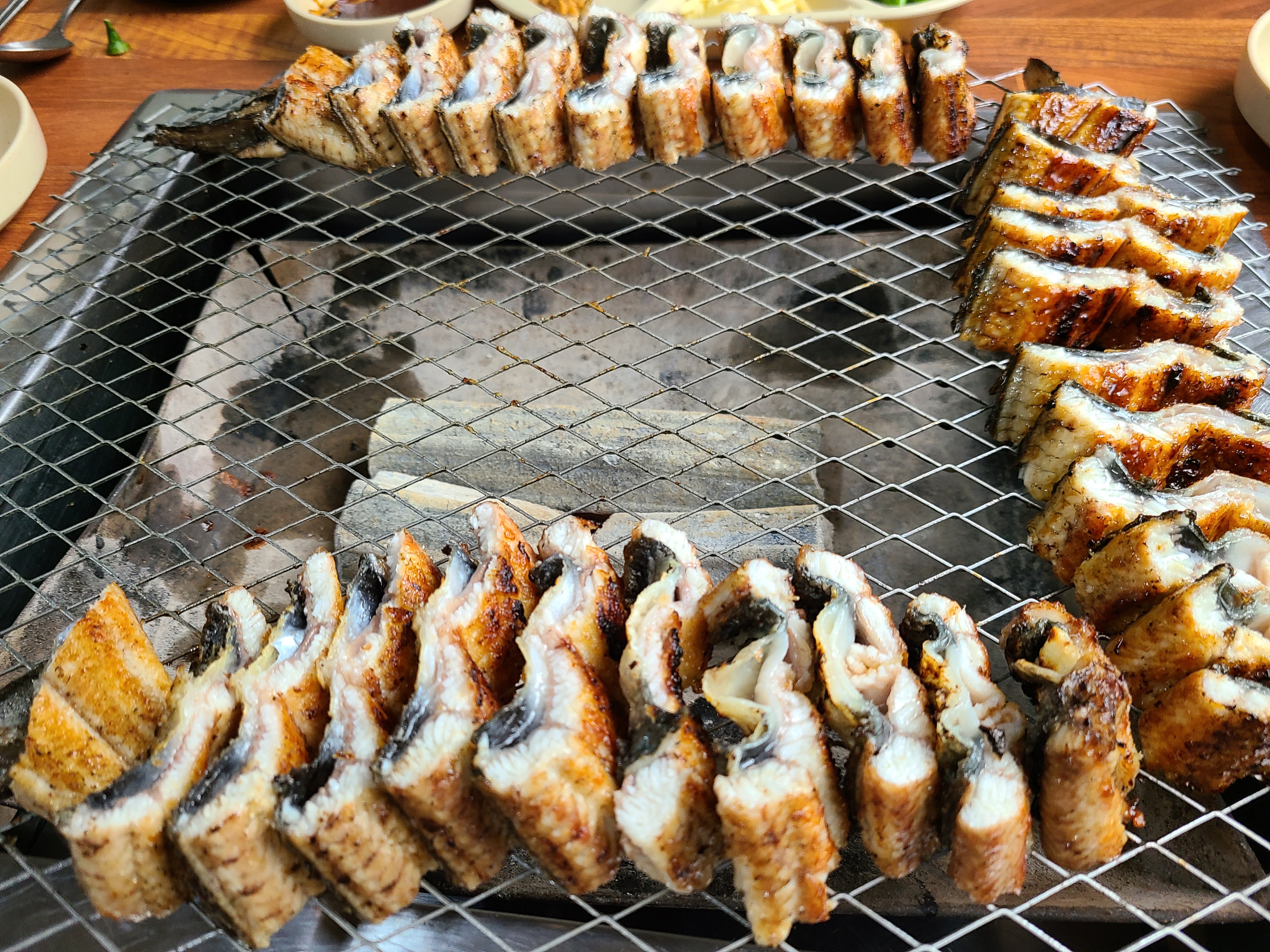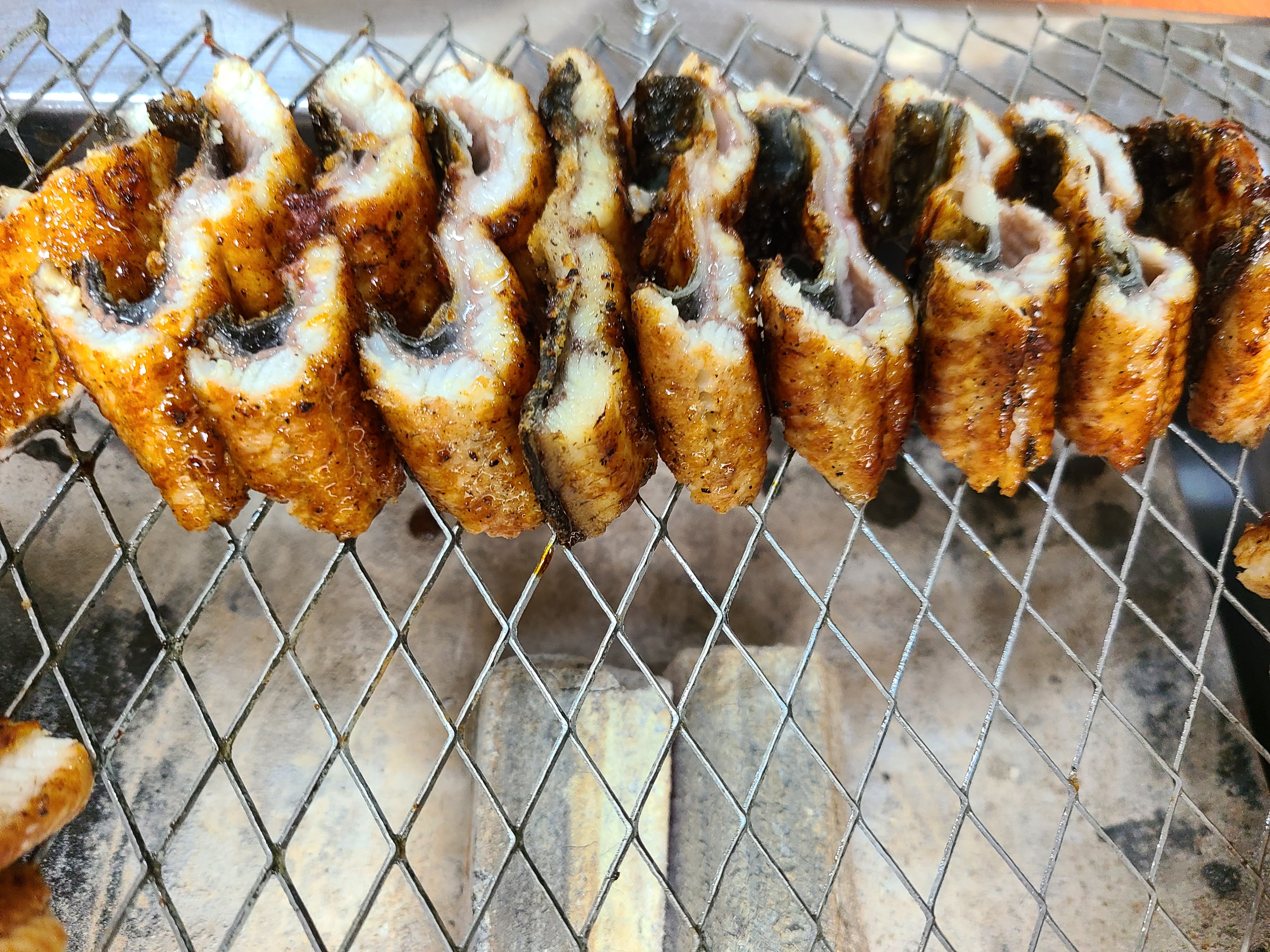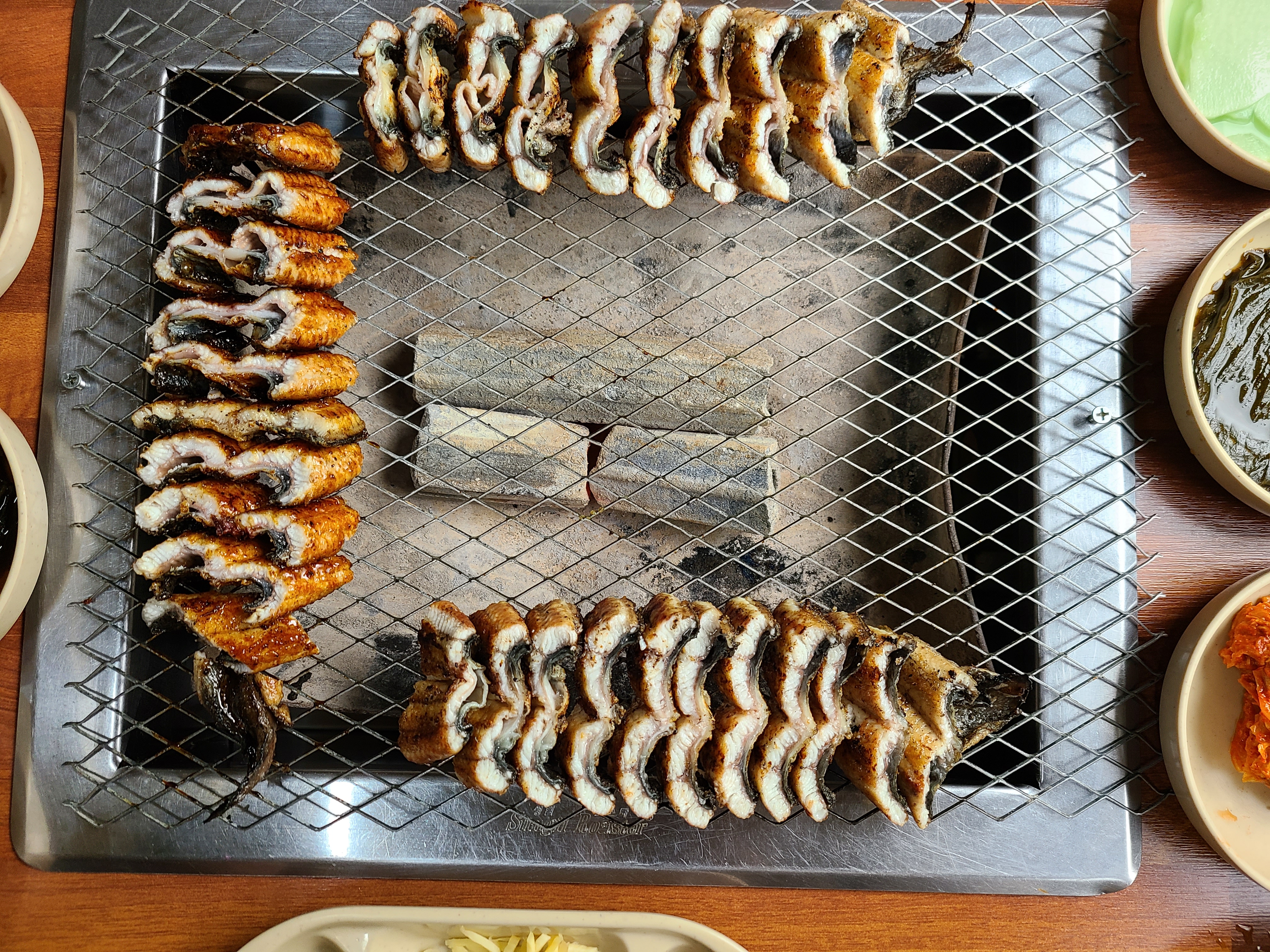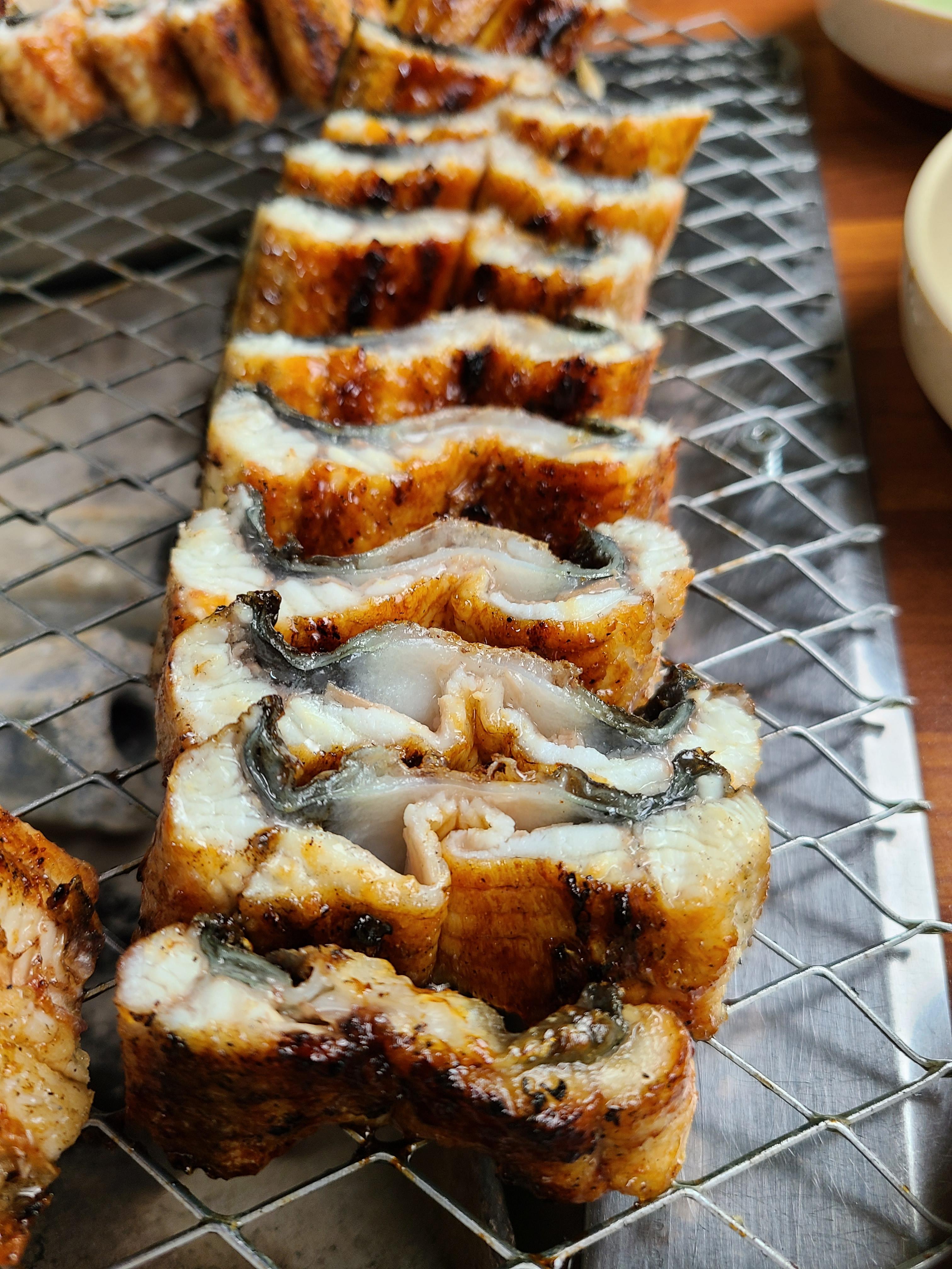 이곳 민물장어는 식당 밖에서 숯불에 구워 나와 바로 먹어도 된다고 한다. 하지만 더 노릇해지게 조금 기다렸다가 먹기 시작했다.