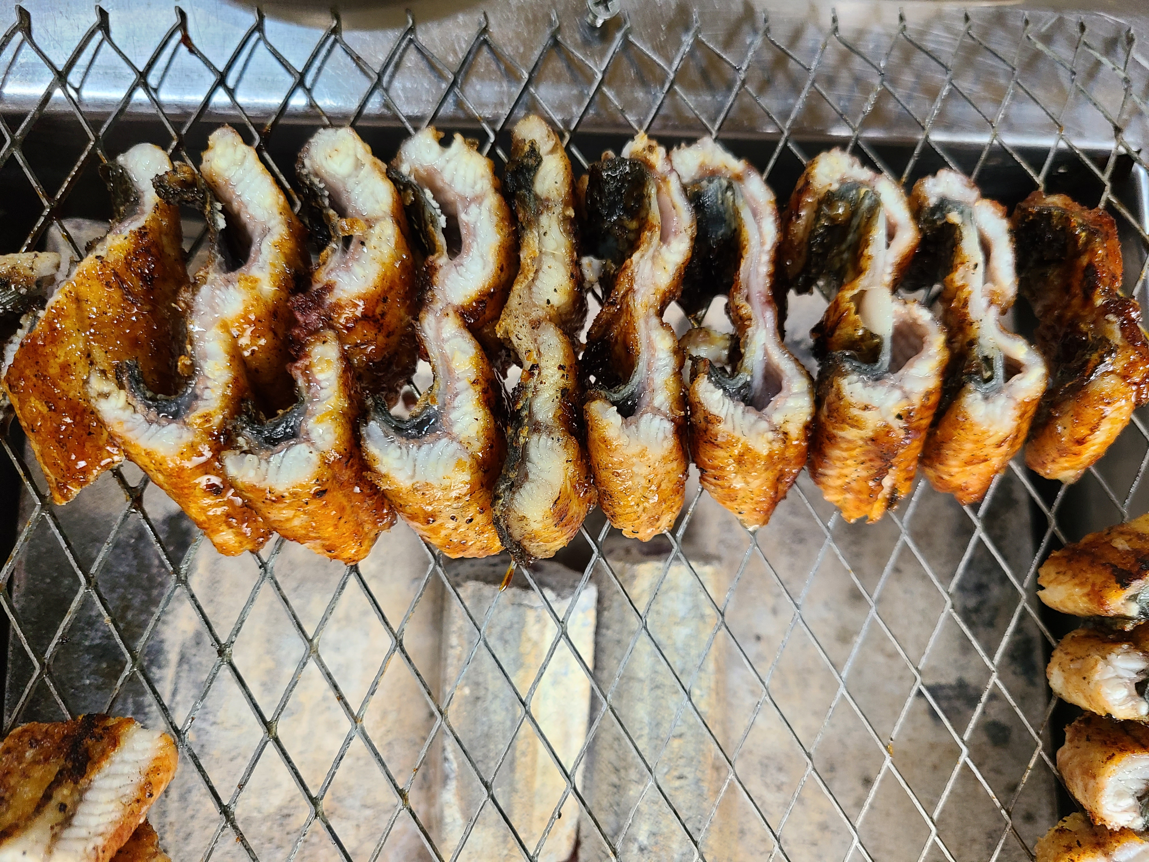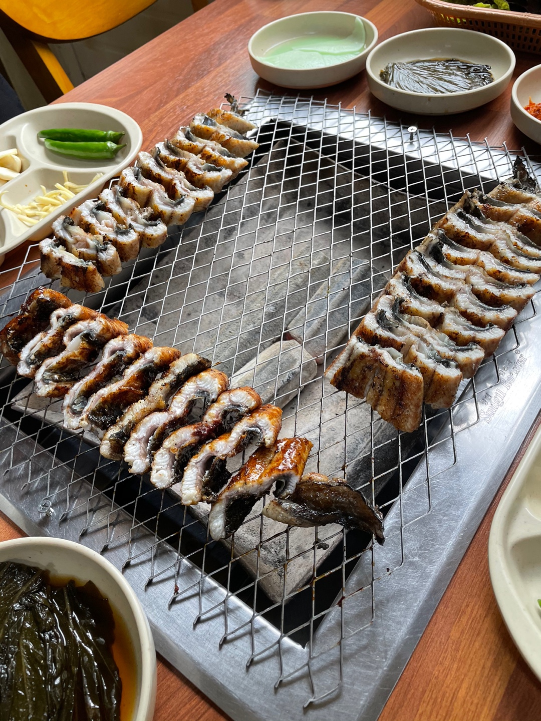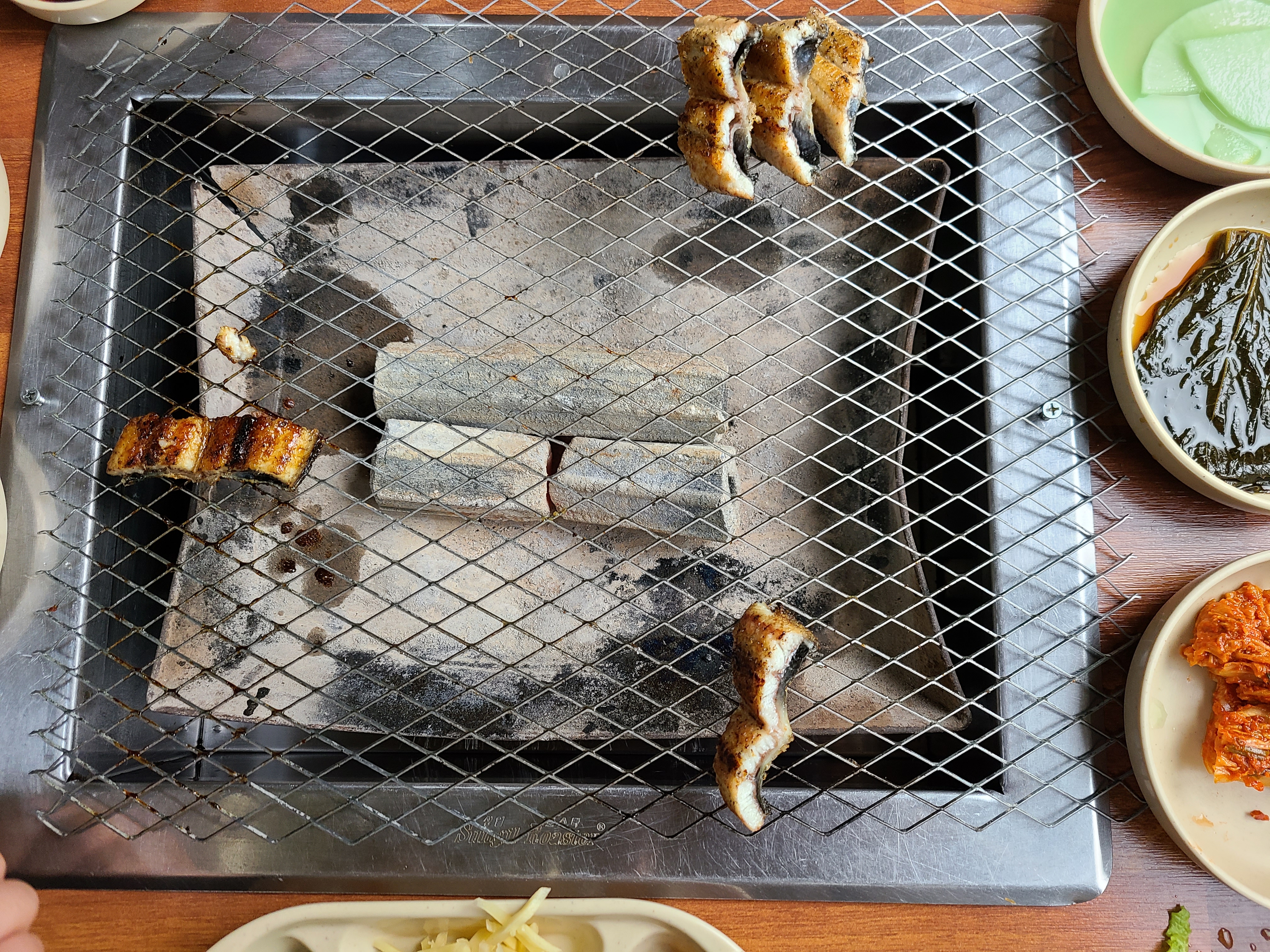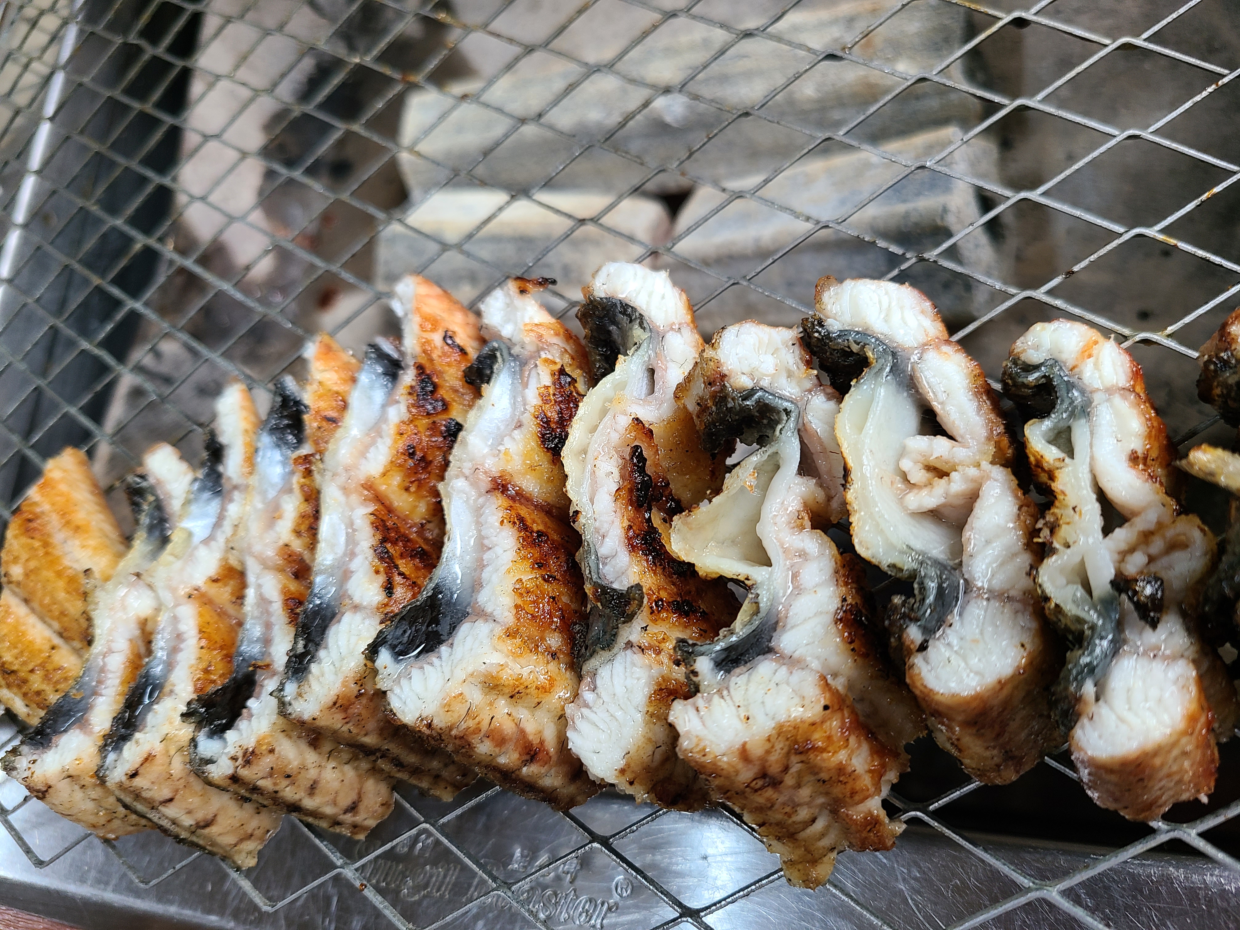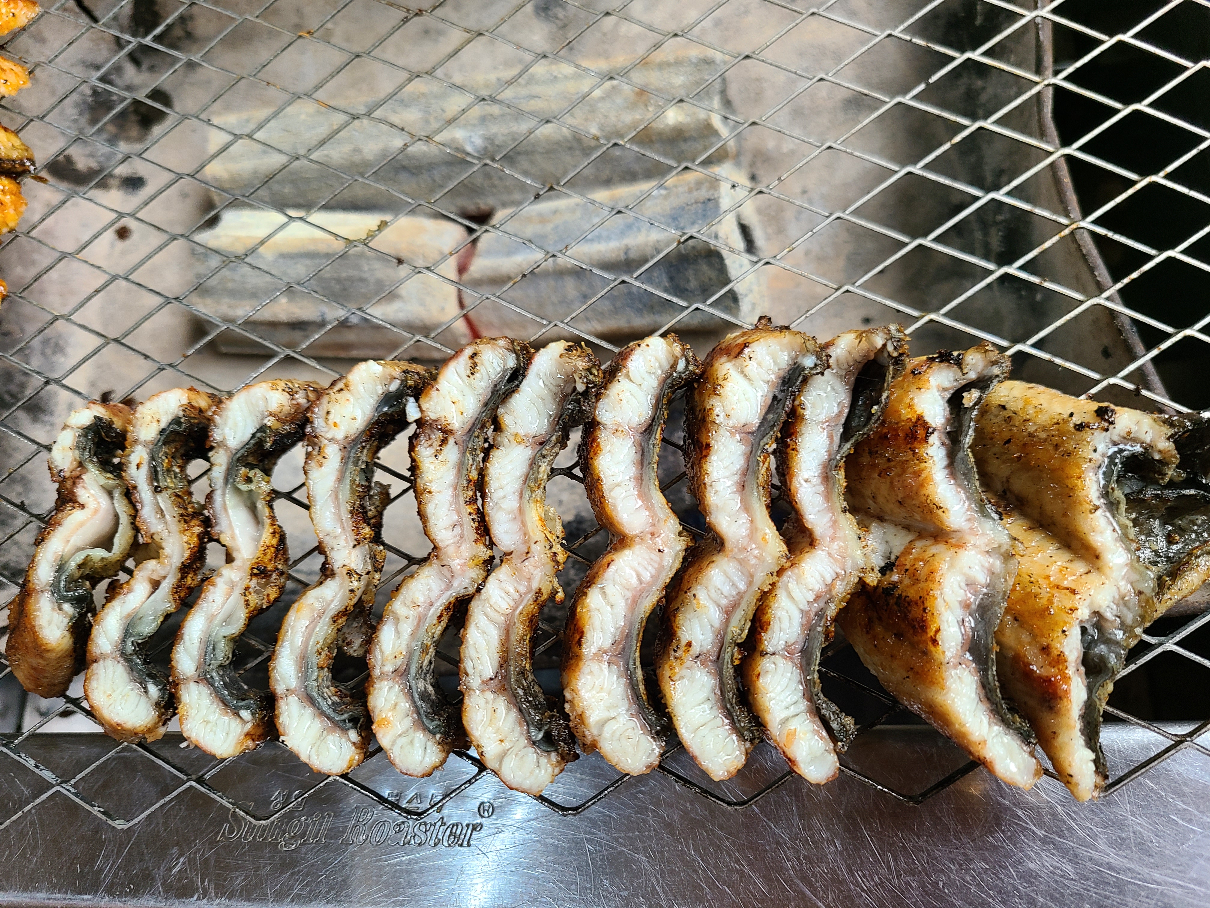 이곳 민물장어는 식당 밖에서 숯불에 구워 나와 바로 먹어도 된다고 한다. 하지만 더 노릇해지게 조금 기다렸다가 먹기 시작했다.