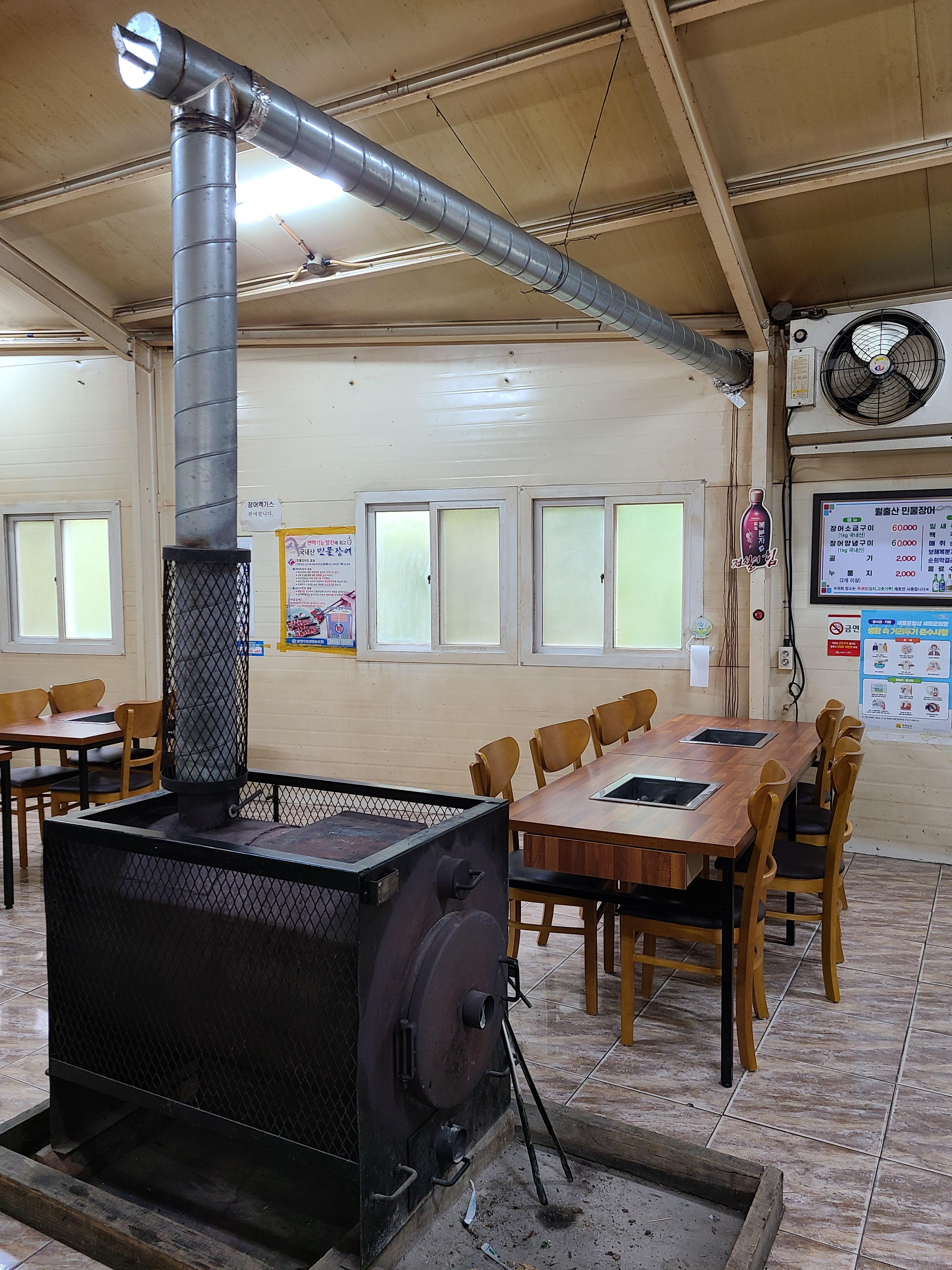 식당에 들어서니 4월 말이 다되어가는데도 화목난로가 그대로 있었다. 식당은 허름해 보였는데 일단 맛집이라고 하니 기대를 해보아야겠다.