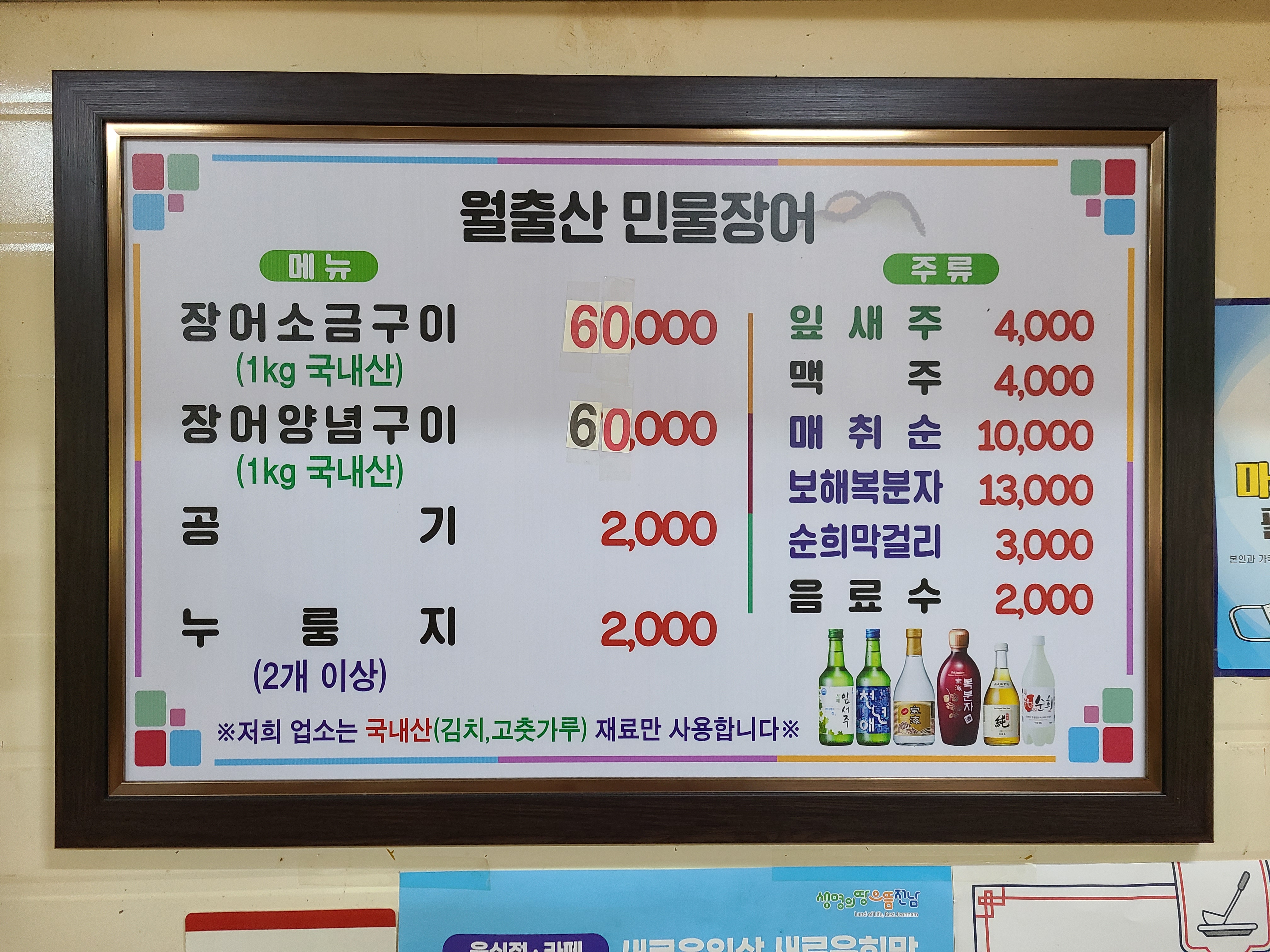 우리가 찾았을 때에는 민물장어 1kg에 60,000원이었는데 판매시기마다 시세가 달라서 보통 60,000원~75,000원까지 한다고 한다.