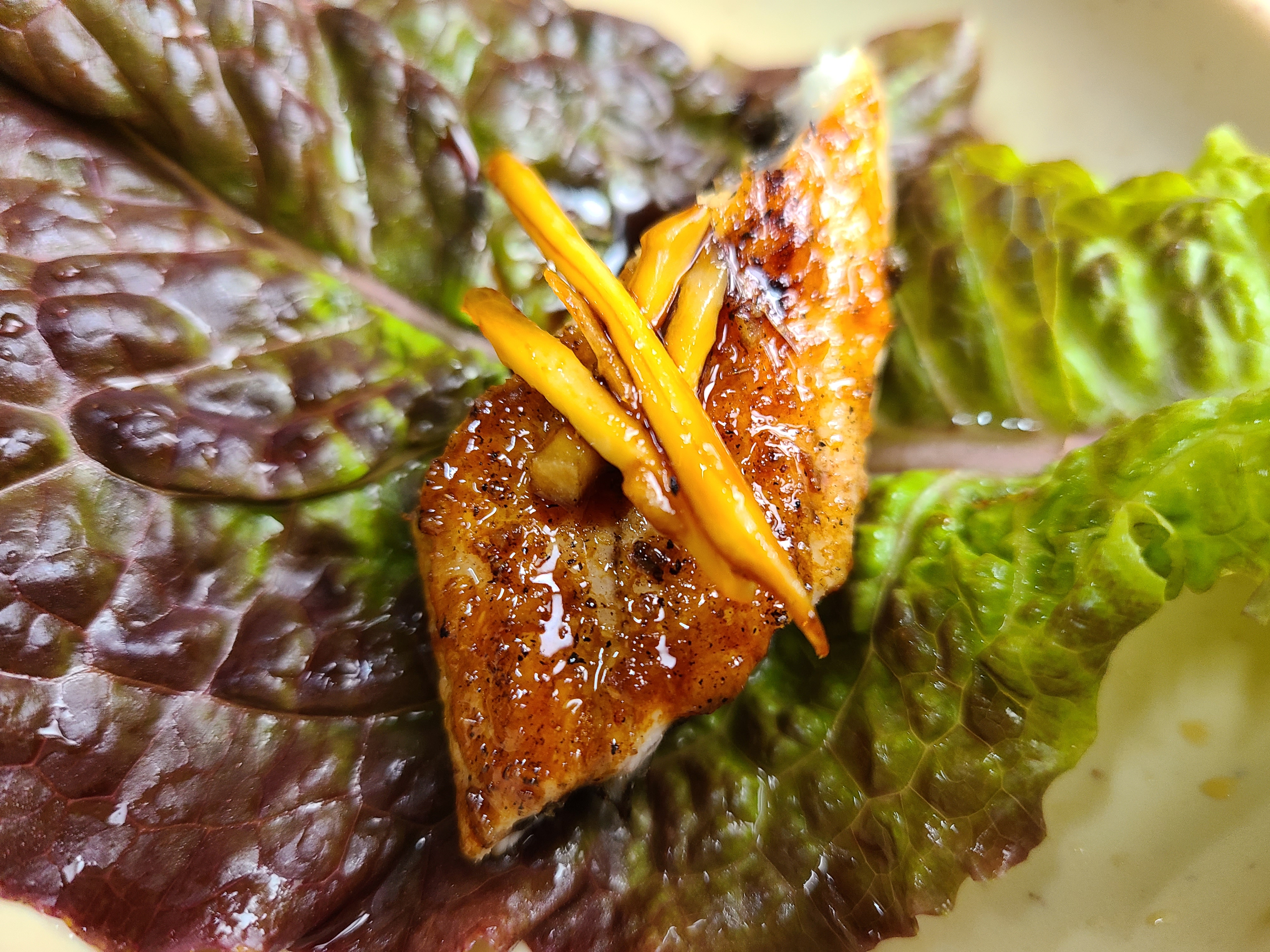 상추 위에 장어를 얹고 소스에 넣었던 생강을 얹어 한 입 먹어 본다. 처음 먹어본다는 부산 청년 눈이 동그랗게 커진다. "민물장어가 엄청 맛있네에"ㅋㅋㅋ