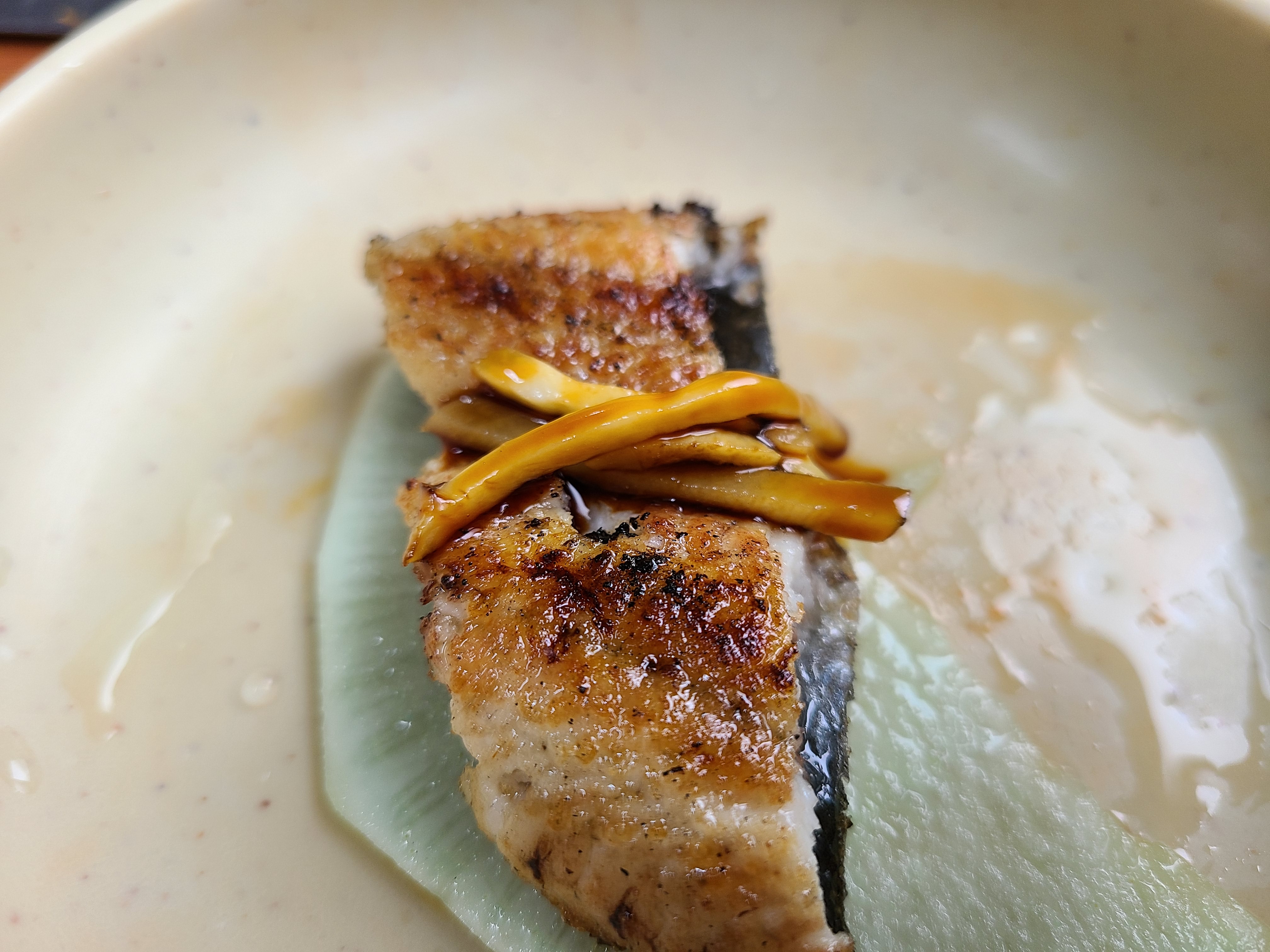 아들이 장어를 추가 주문하는 것을 보고 이번에는 무 초절이에 장어를 얹어 먹기 시작했다.