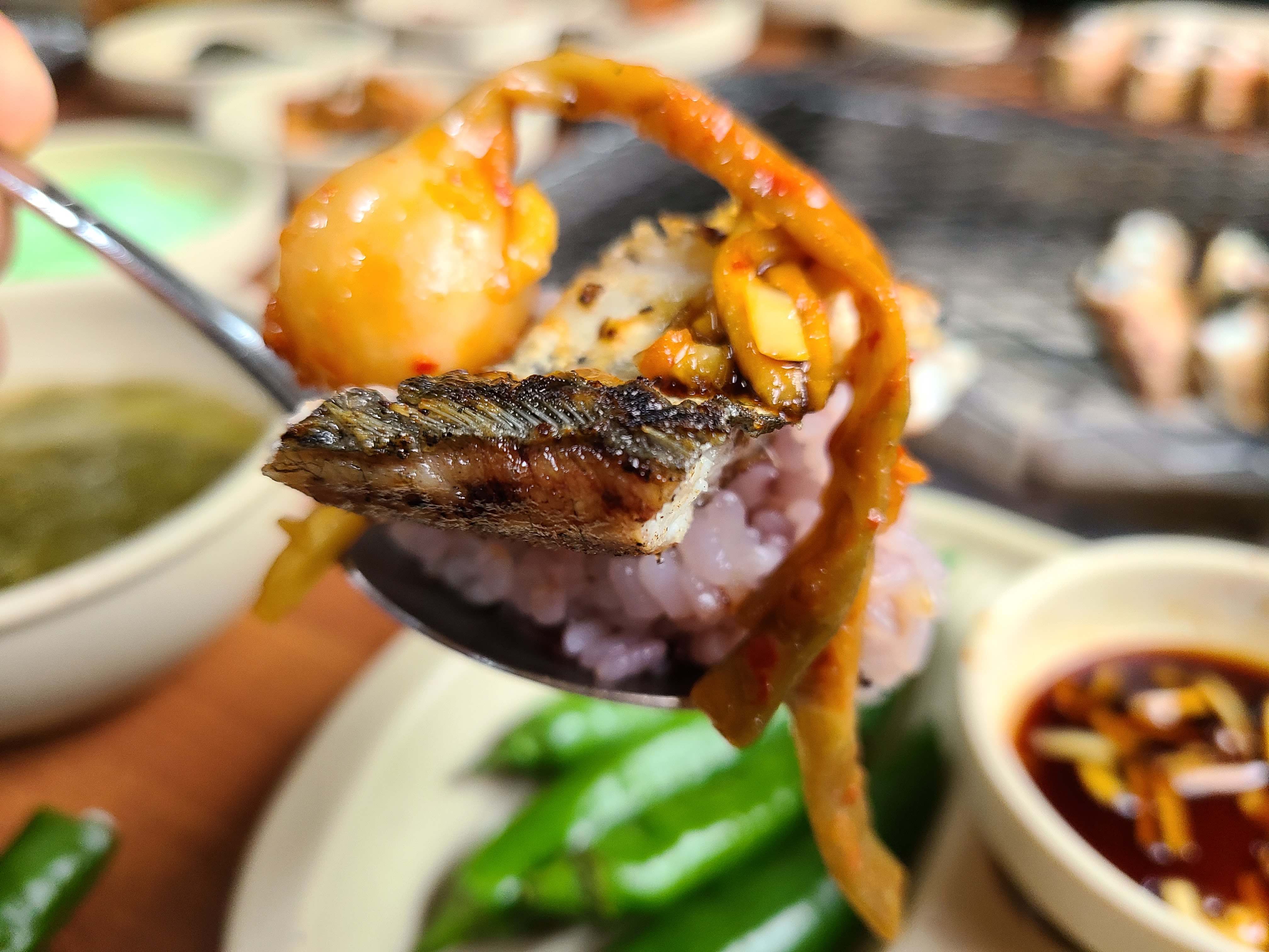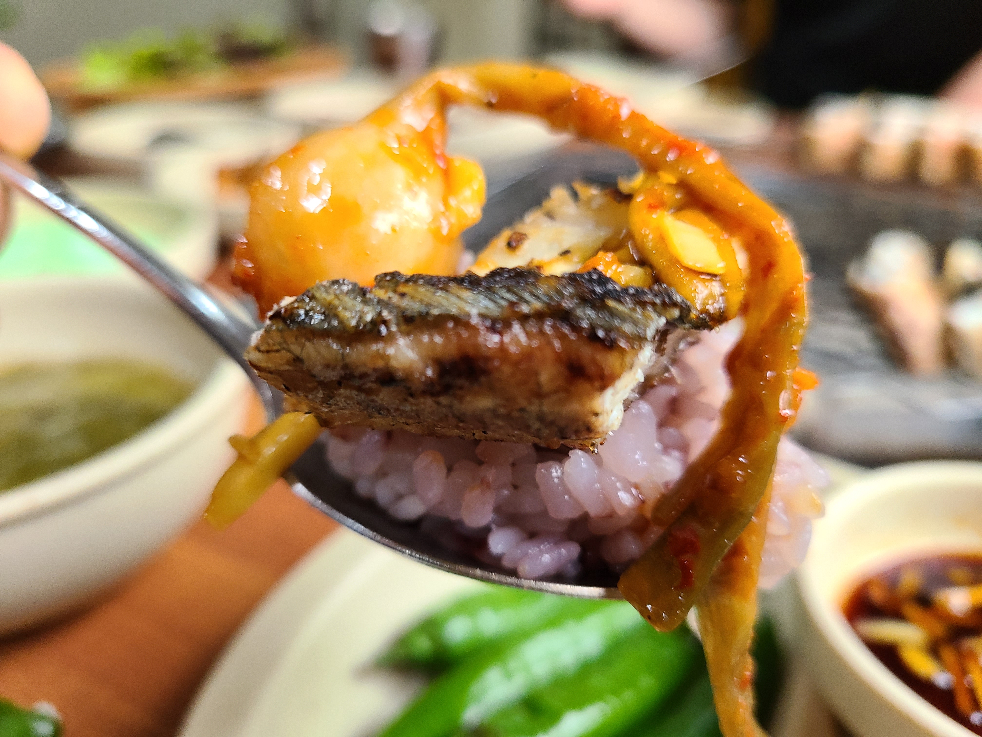 민물장어구이가 숯불에 구워서 불향이 나고 부드럽고 고소한 맛이 정말 맛있었다. 어느 결에 입안에서 장어가 사라져 버렸다. 맛만 보겠다던 나는 아들 얼굴을 쳐다보며 "아들 너무 맛있다~~" 그 순간 아들이" 사장님 여기 1kg 더 구워주세요. 흐름이 끊기면 안 됩니다." "밥 한 공기도 주세요."