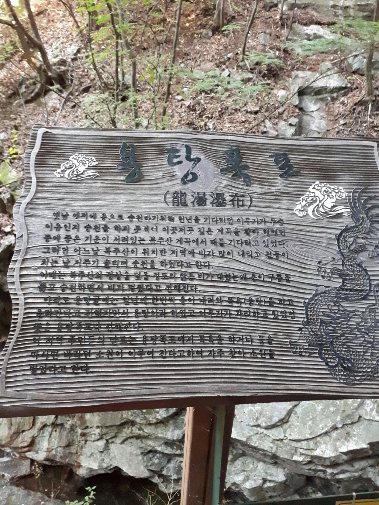 아직도 용탕 골에는 일 년에 한 번씩 용이 내려와 목욕(용탕)을 하고 올라간다고 전해지면서 용탕이라 하였고 이무기가 자리하고 있었던 곳은 용탕 폭포라 전해진다. 이 지역 주민들의 말로는 용탕 폭포에서 목욕을 하거나 물을 마시면 바라던 소원이 이루어진다고 하여 자주 찾아 소원을 빌었다고 한다,