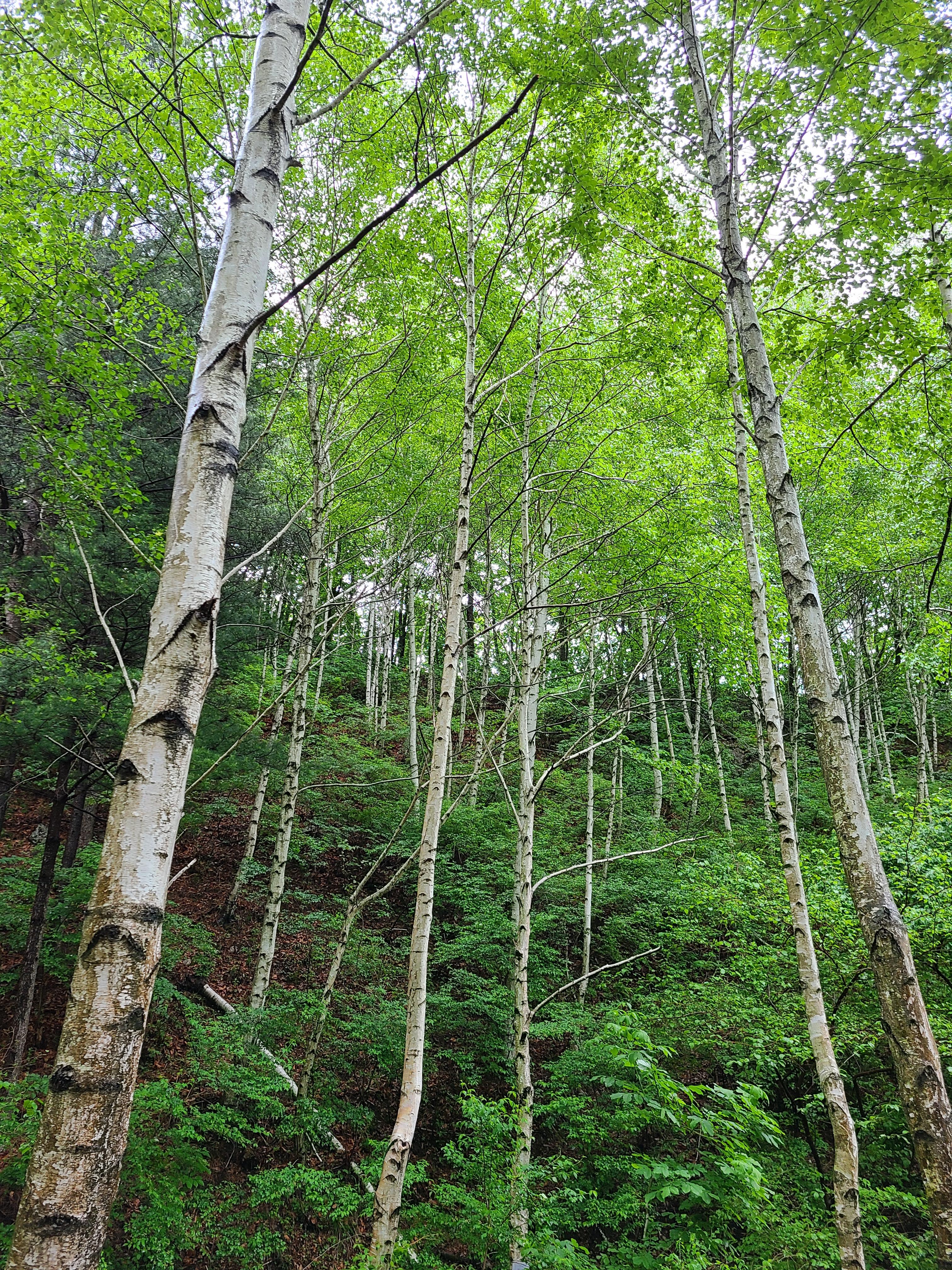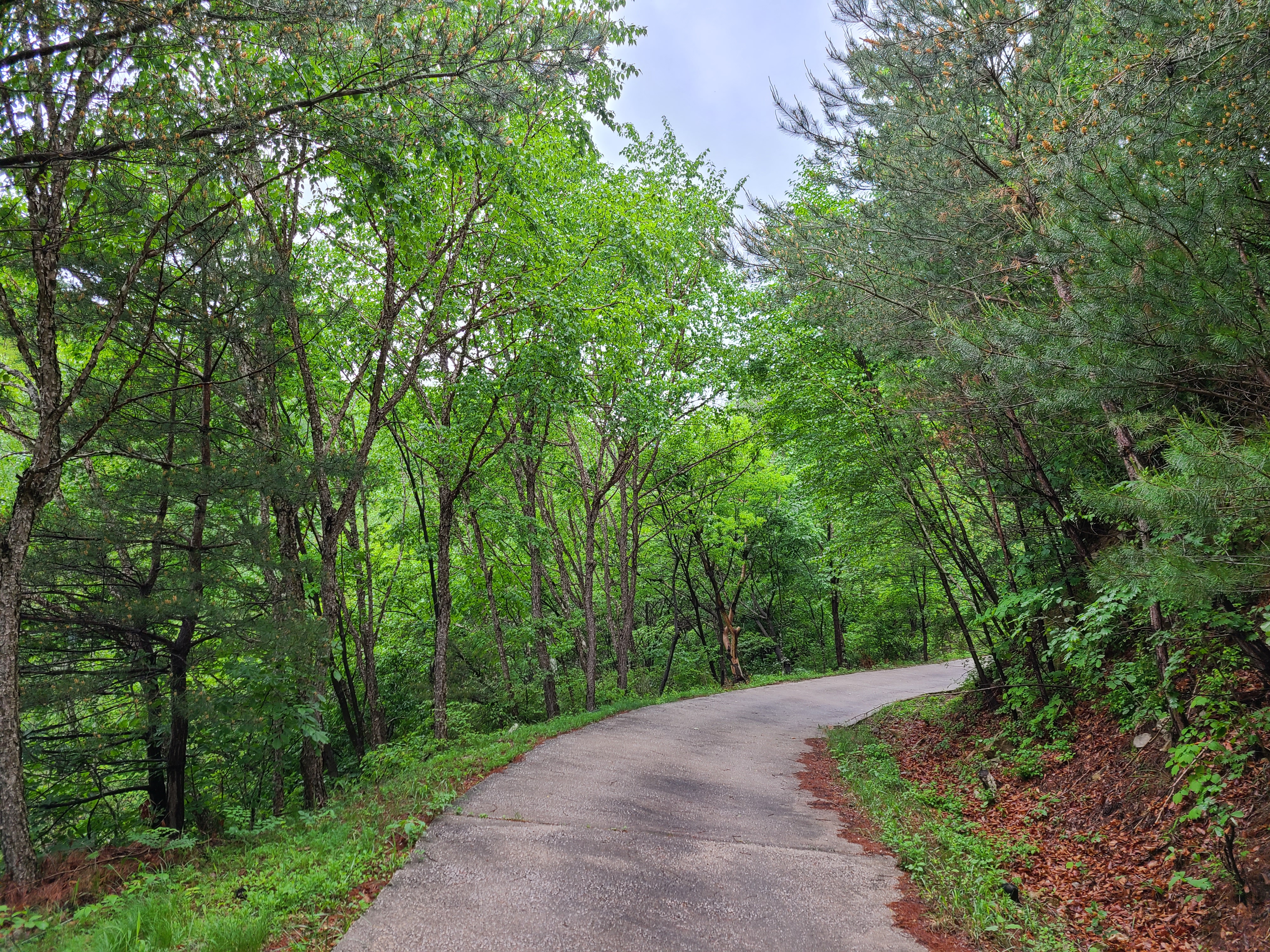 비를 맞은 나뭇잎들이 아직 연둣빛을 띄고 있다. 강원도 쪽이 가을과 겨울은 빨리 오지만 봄과 여름은 늦게 온다.