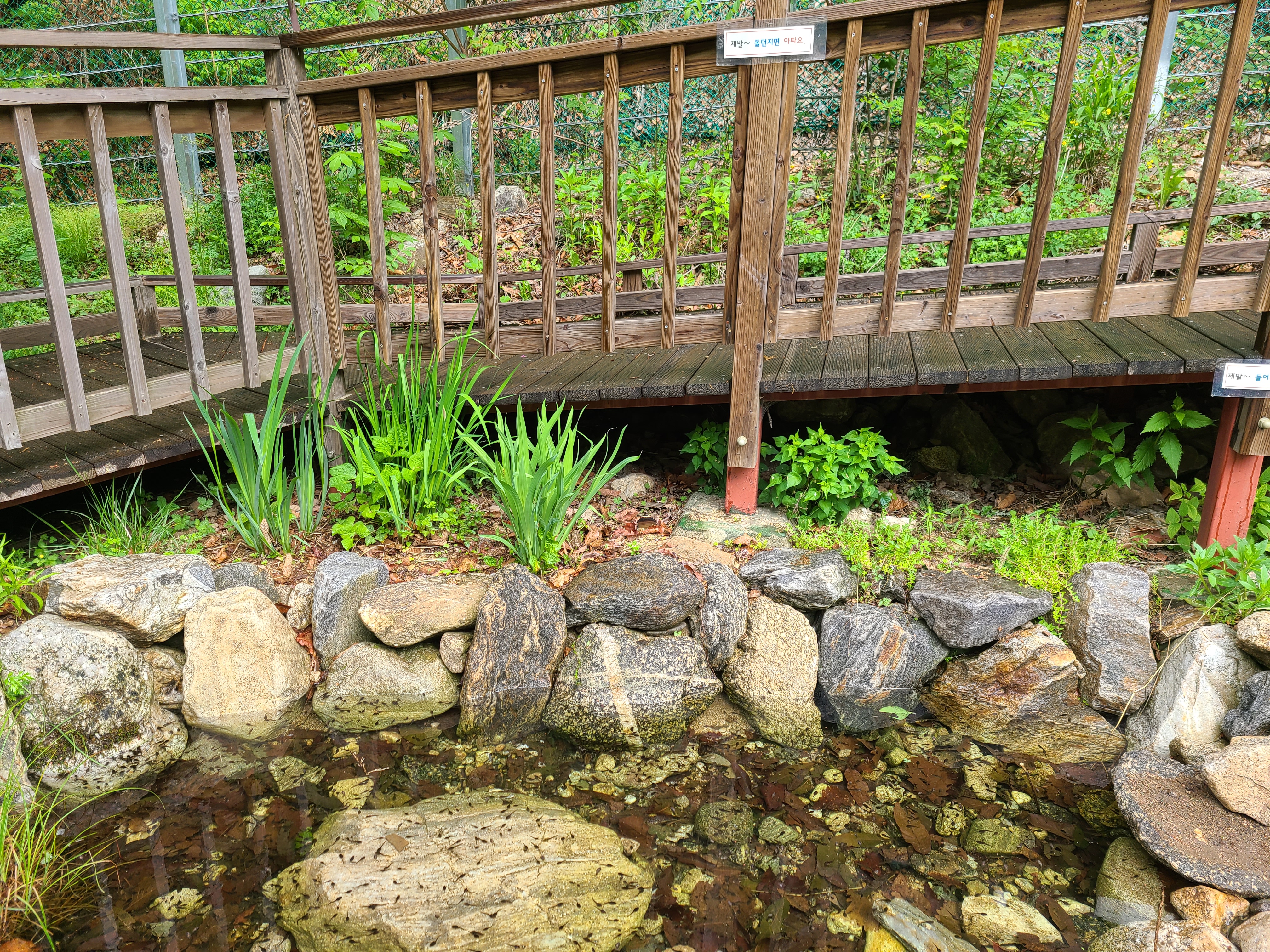 계곡 옆 테크로드 아래 조그만 연못이 있는데 올챙이가 가득하게 있다. "제발~~ 돌 던지면 아파요."라는 문구가 테크에 붙어있다. 장난으로 돌을 던지는 사람들이 있나?