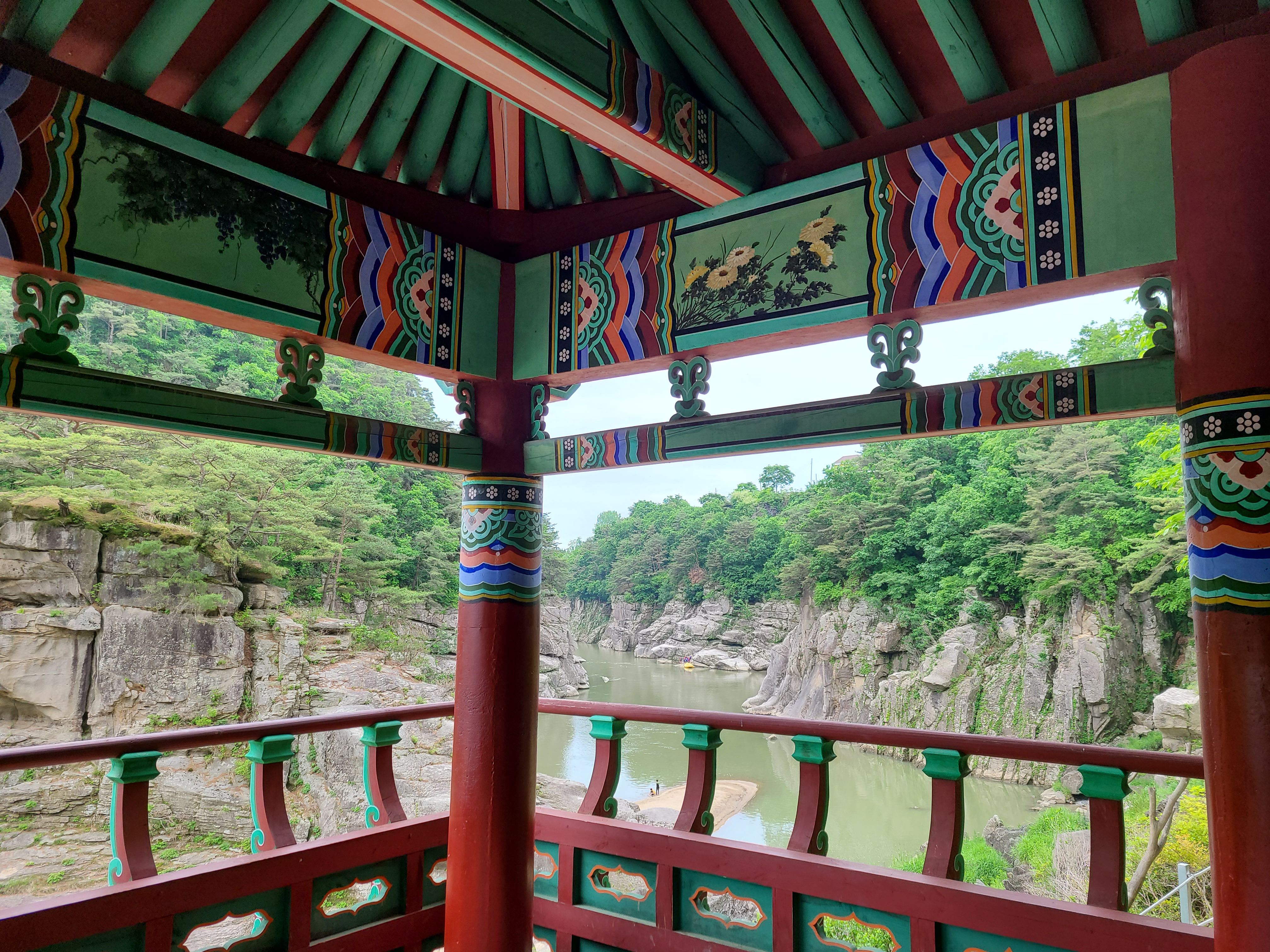 한탄강 양옆으로 높게 솟아있는 기암괴석과 정자의 모습이 아름답다.