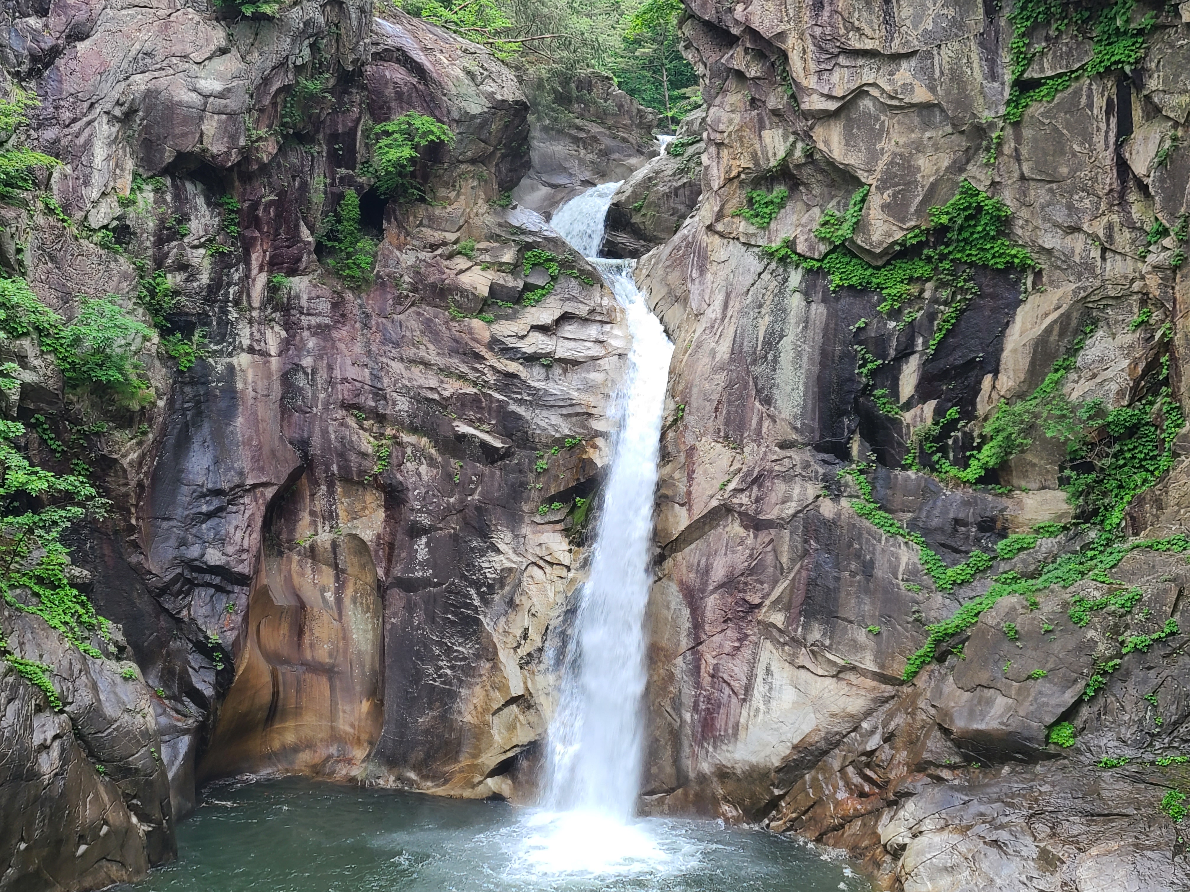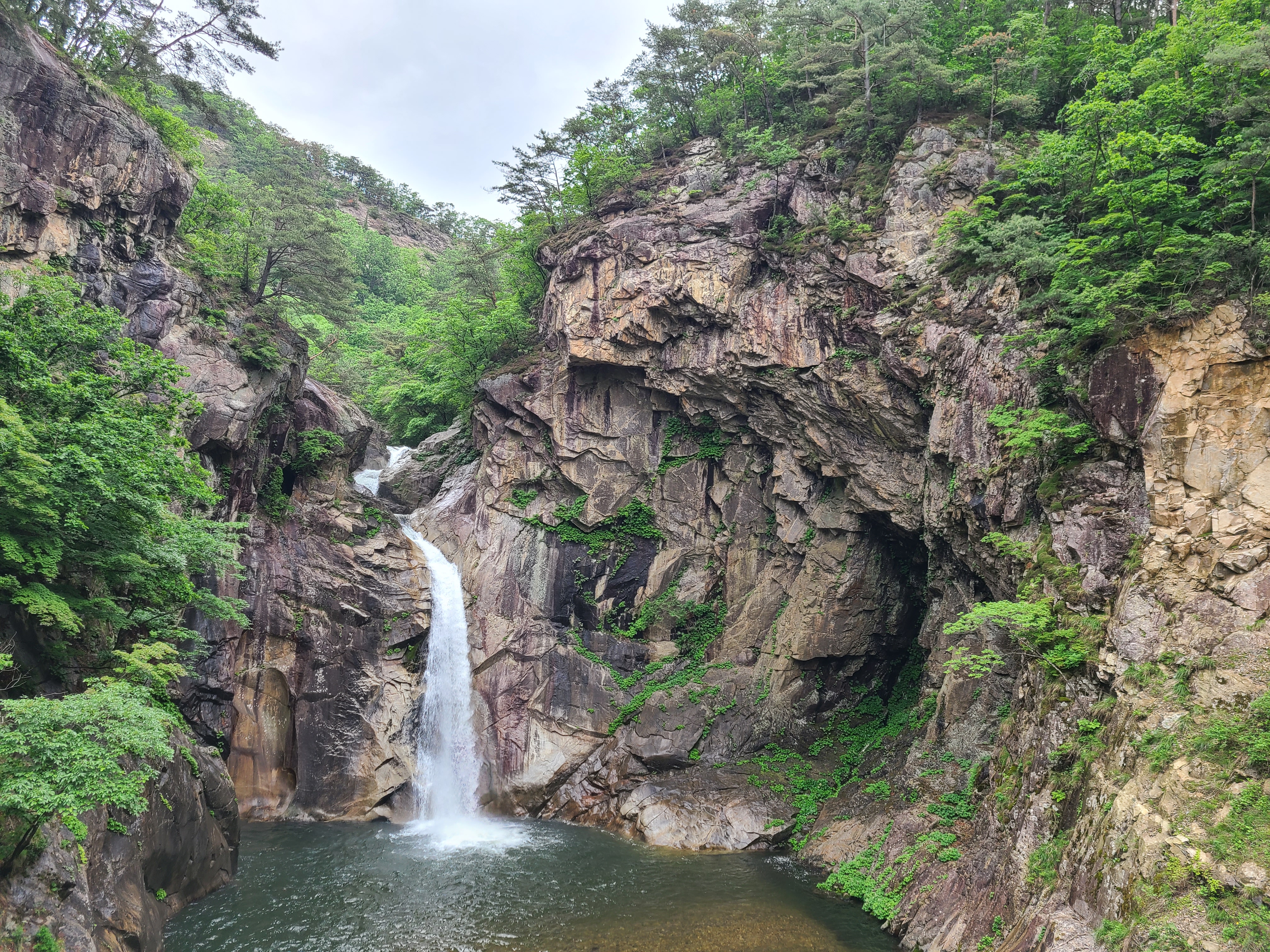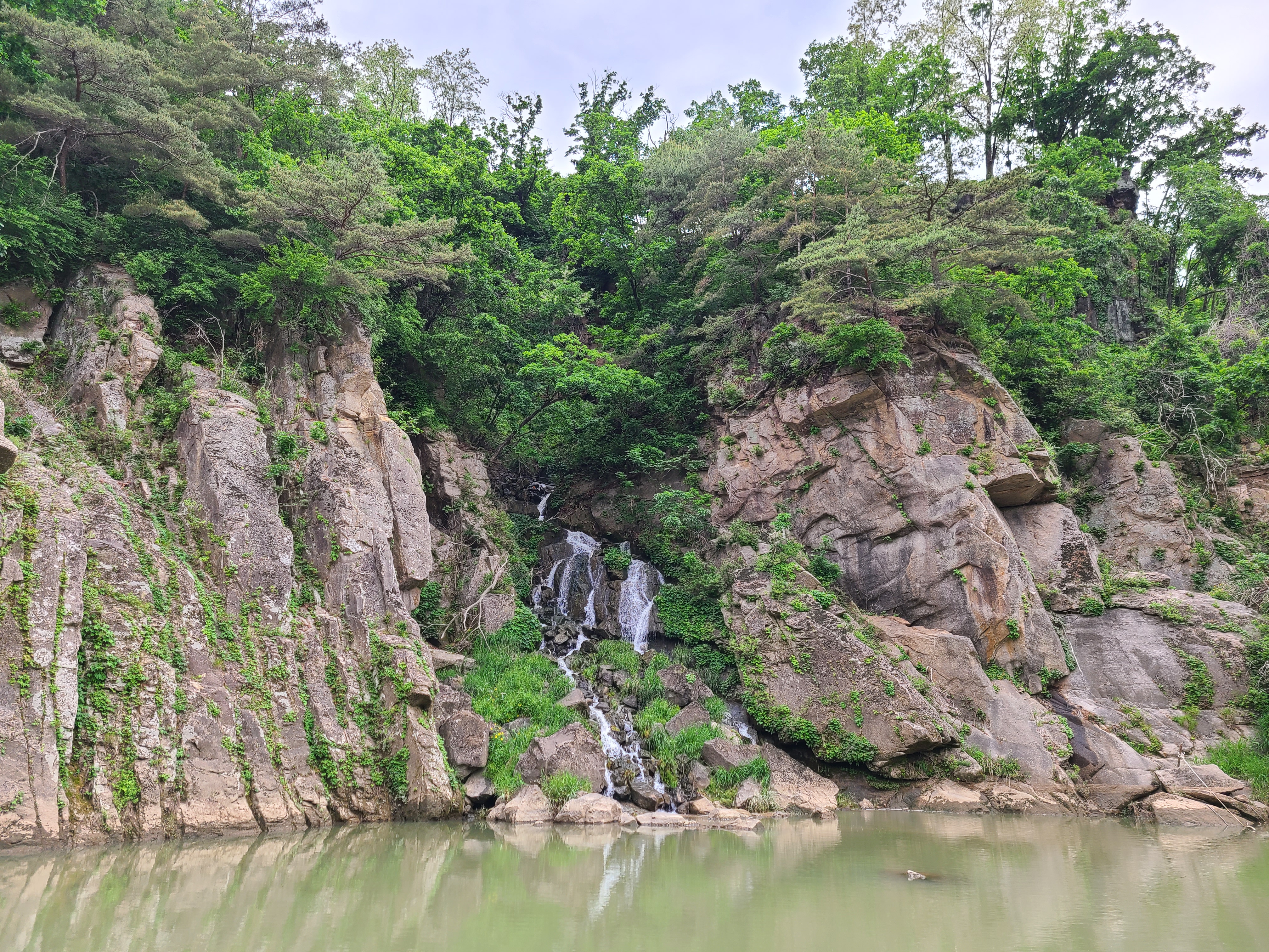 바위 절벽과 푸른 나무가 어우러진 모습이 동양화를 보는 듯하다. 아직 폭포 모습은 보이지 않는데 폭포 소리가 들린다.
